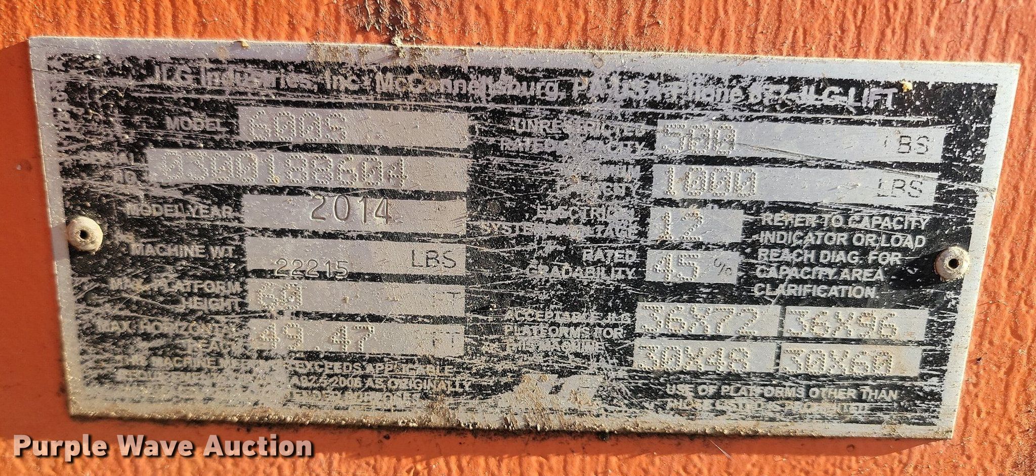 Purple Wave is selling a used Boom Lift in North Dakota. This item is a 2014 JLG 600S boom lift with the following: Hours: 8,682 on meter, Serial: 0300188604, Unit #: 10267892
