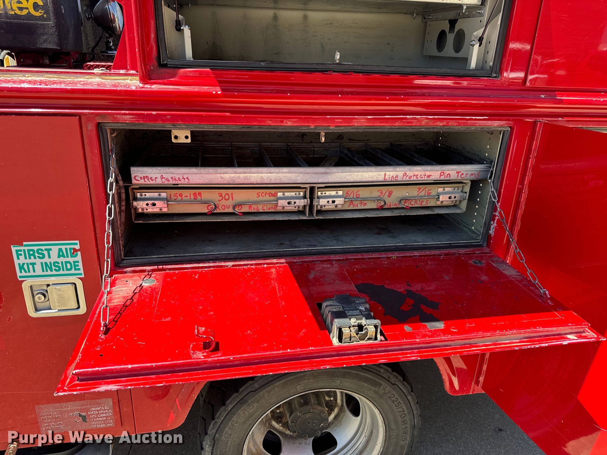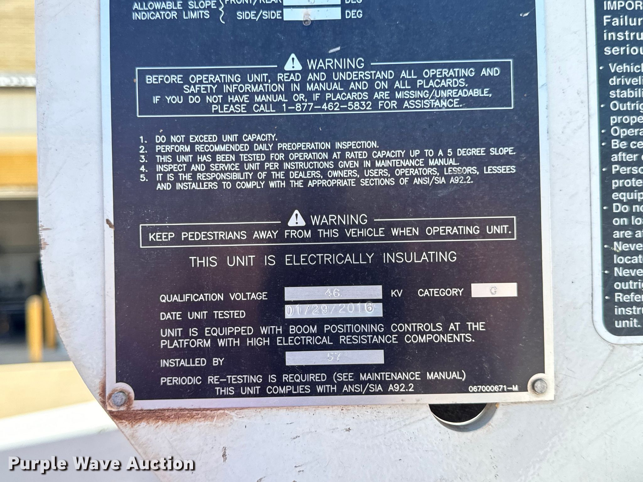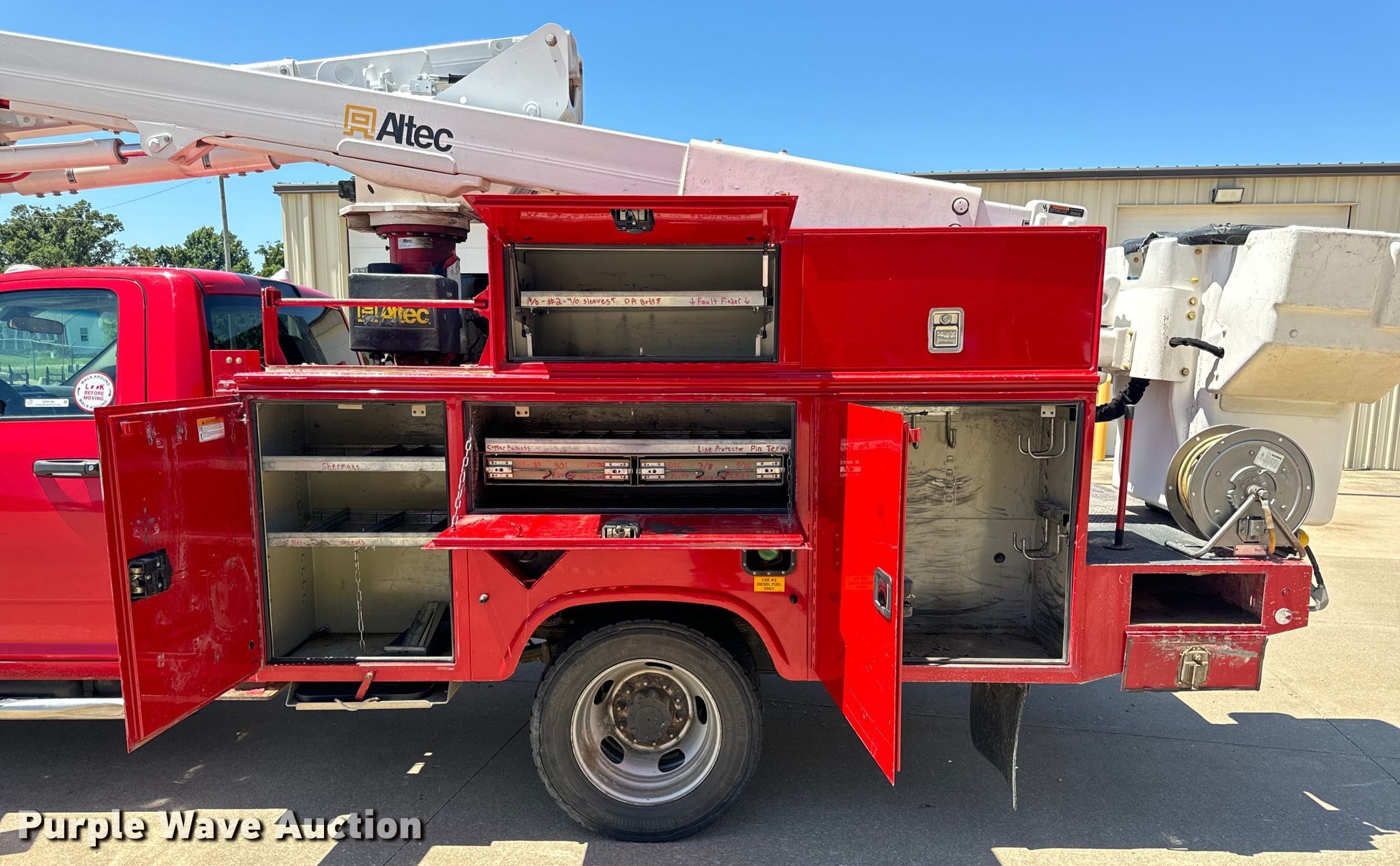 2015 Dodge Ram 5500HD bucket truck. Miles: 184,771 on odometer, VIN: 3C7WRNAL1FG705998. Engine Cummins, Displacement: 6.7L, Cylinders: 6, Fuel type: Diesel. Transmission Automatic. Chassis Four wheel drive, Axles: Single, Suspension: Spring, Brakes: Hydraulic, PTO, Wet kit, GVWR: 19,000 lbs. Interior AC, Heat, Cruise control, Auxiliary controls, Brake controller. Features Bed Altec, Serial: 57-36997818, 9' L x 94" W, Boom Altec AT40G, Serial: 1015EY1313, Maximum lift capacity: 400 lbs, Maximum lift height: 40.8', Boom type: Articulating, Insulated, Telescopic, Man basket, Boom controls Ground, Platform/ basket, Certification valid through: 09/2024. Tires Size: 225/70R19.5. Notes Dash warning indicator: Brake, Regen. Missouri title. Three Rivers Electric Cooperative. Linn, MO 65051