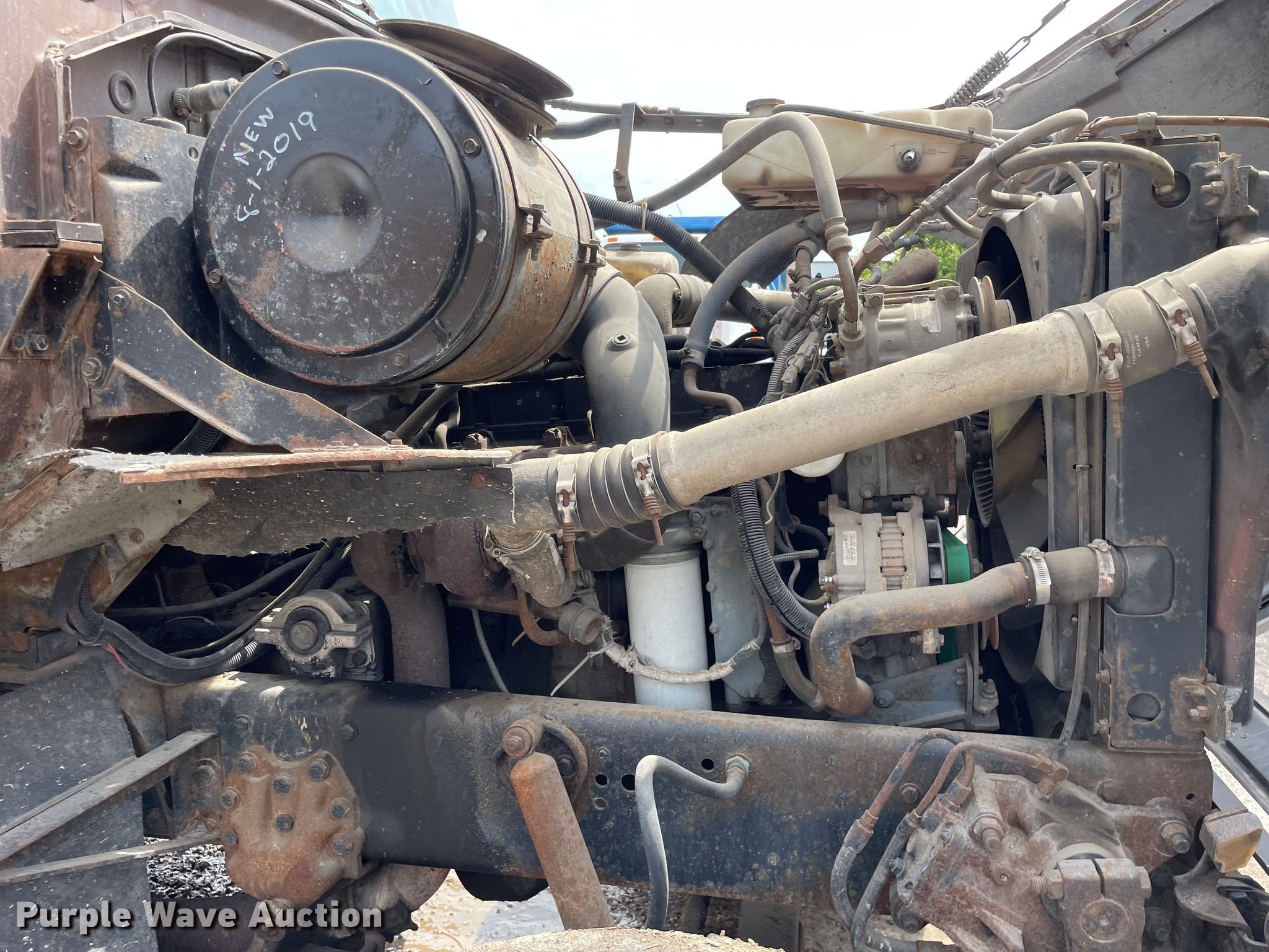 1994 Ford L8000 dump truck. Miles: 539,836 on odometer, Hours: 7,587 on meter, VIN: 1FDYU82E4RVA41001, Unit #: 301. Engine Displacement: 8.3L, Cylinders: 6, Fuel type: Diesel. Transmission Eaton Fuller Roadranger RT-7608LL, Manual, Speed: 10. Chassis Axles: Tandem, Differential lock: Inter-axle, Suspension: Spring over walking beam, Brakes: Air, PTO, GVWR: 50,000 lbs. Interior Heat, Heated mirrors, Brake controller. Features Dump bed Northshore Truck & Equipment, 14' 6" L, Side height: 48", Bed type: Steel, Roll tarp, Ram: Single, End gate: Air operated. Tires Front: 12R22.5, Rear: 11R22.5. Notes Unit must be towed or hauled, Unknown operating condition of dump bed Only raises slightly. Illinois title. Brancato Snow & Ice Management. Elk Grove Village, IL 60007