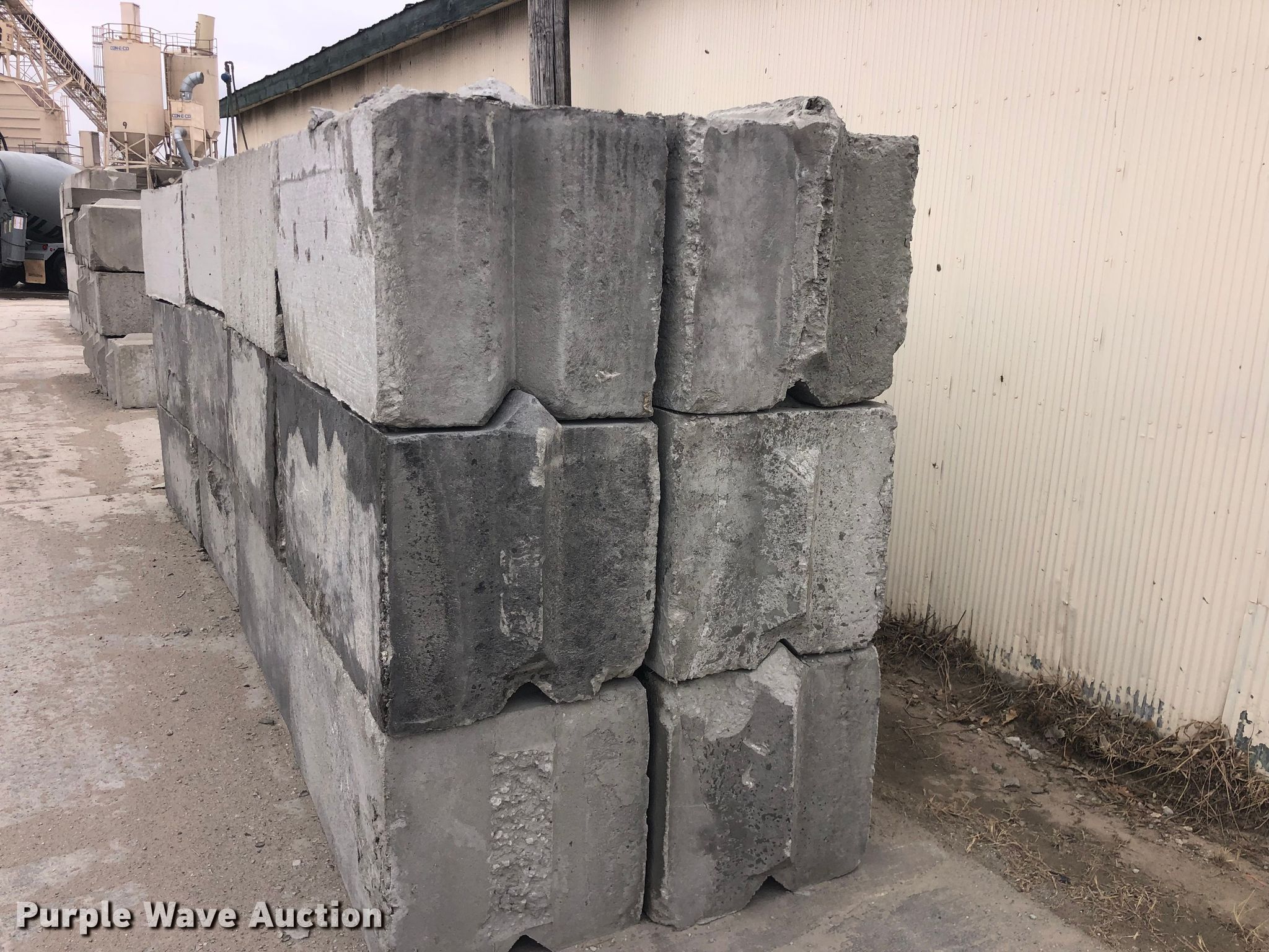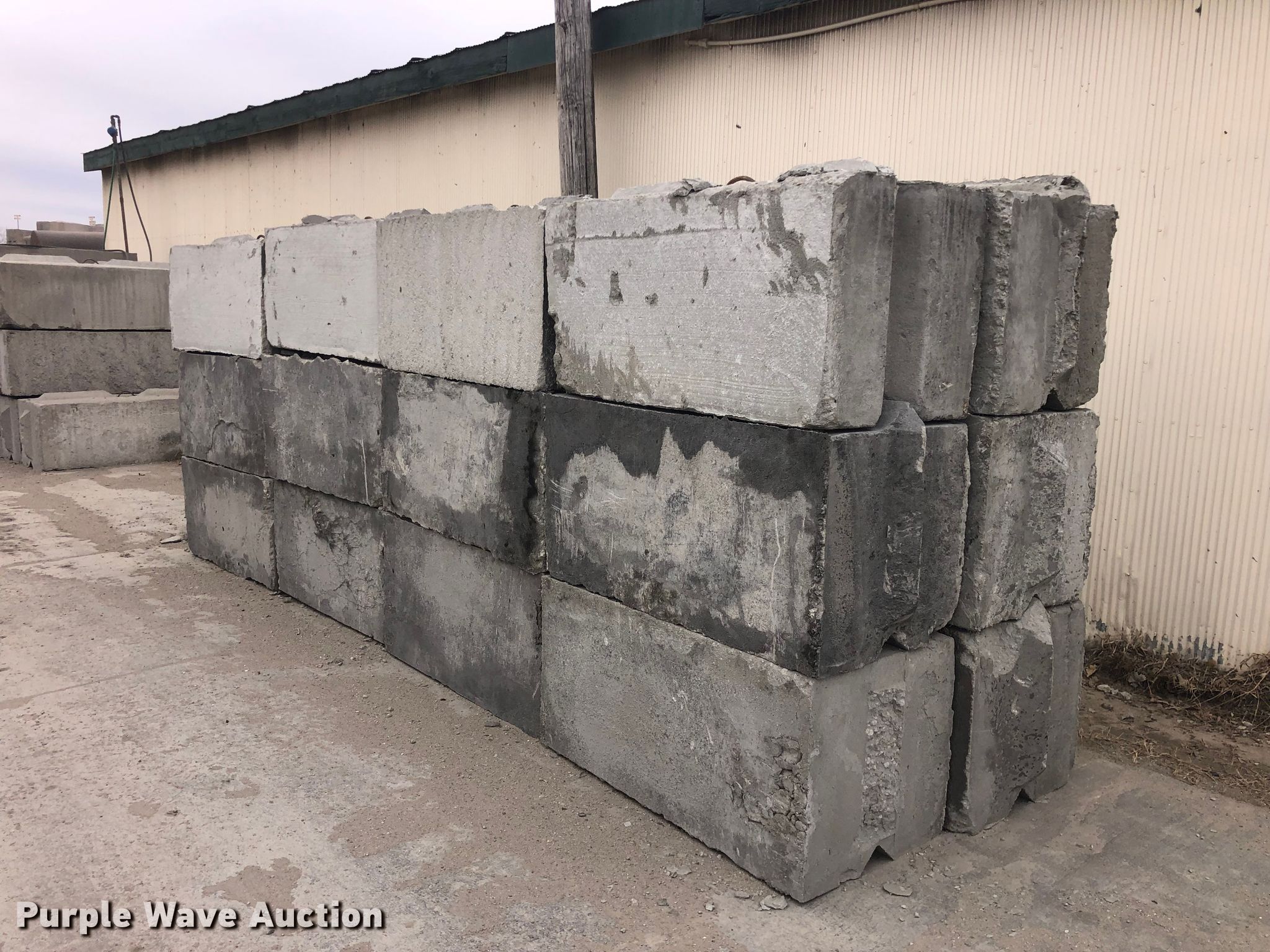 Purple Wave is selling a used Building Materials in Kansas. This item is a (24) concrete edge bunker blocks with the following: 2' x 2' x 4', Rebar lift eyelet, Keyed, Finish and condition may vary, Color: Grey, Approx. 2,100 lbs per block