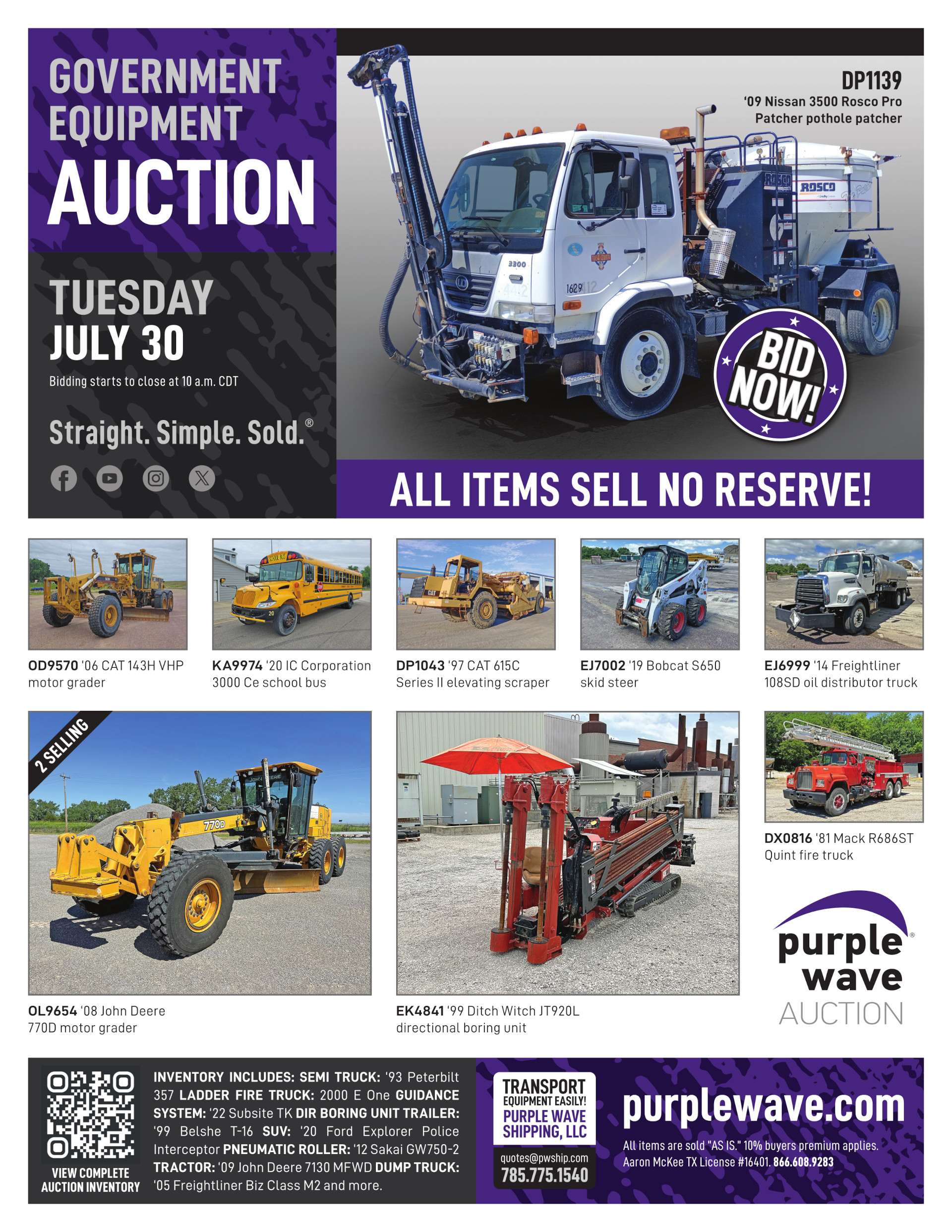 Purple Wave Shipping, LLC provides shipping and transportation services to winning bidders on ag, construction and fleet type assets. Purple Wave Shipping, LLC does not provide shipping on items weighing less than 1,000 pounds.