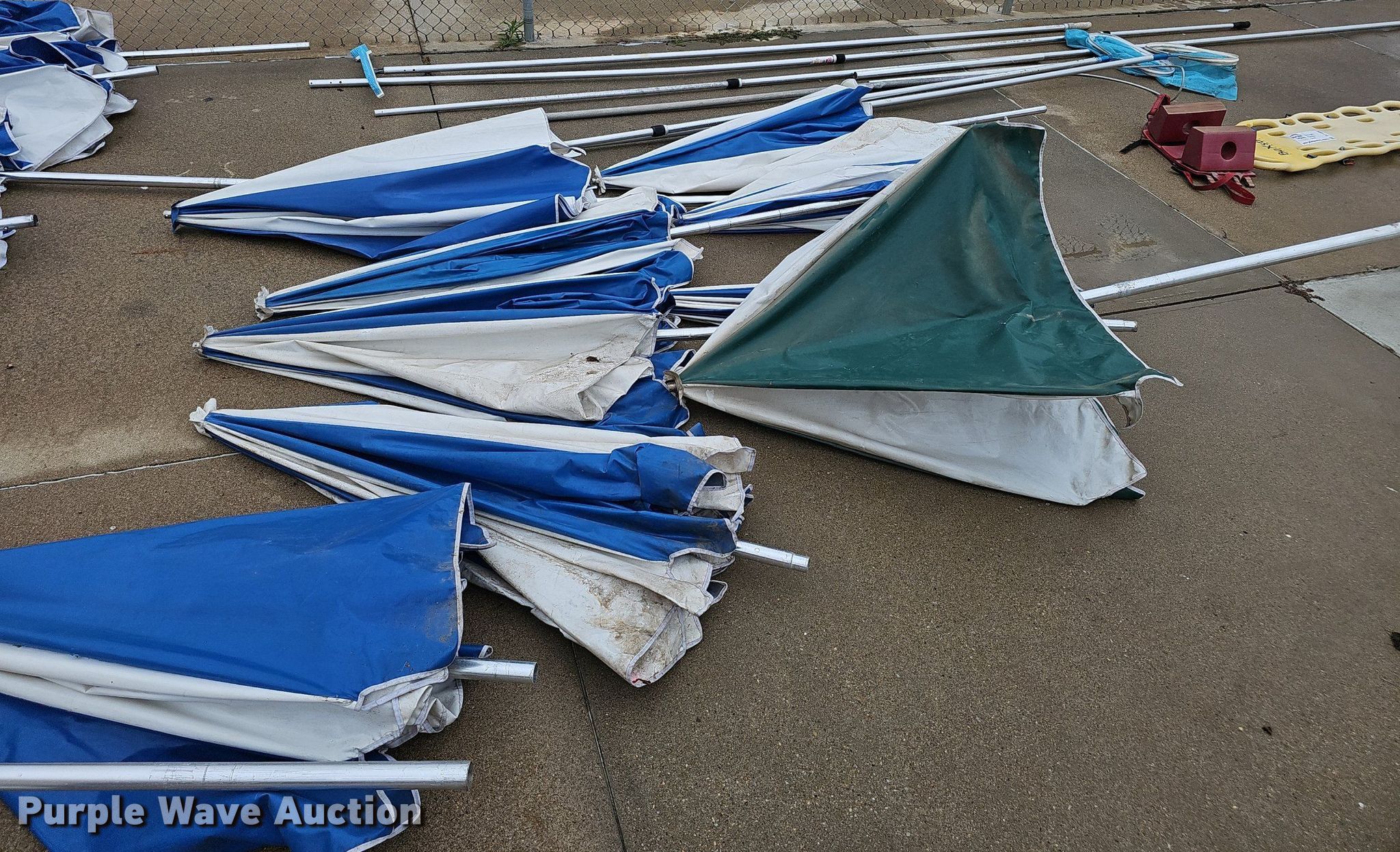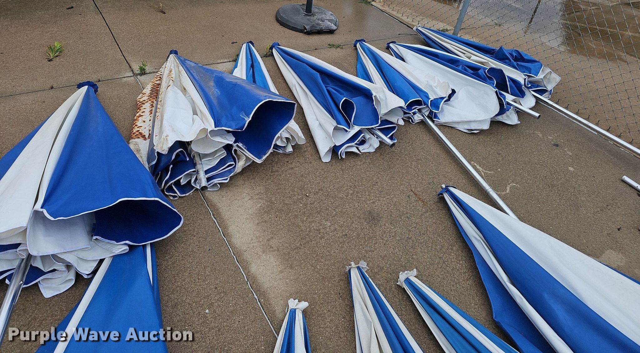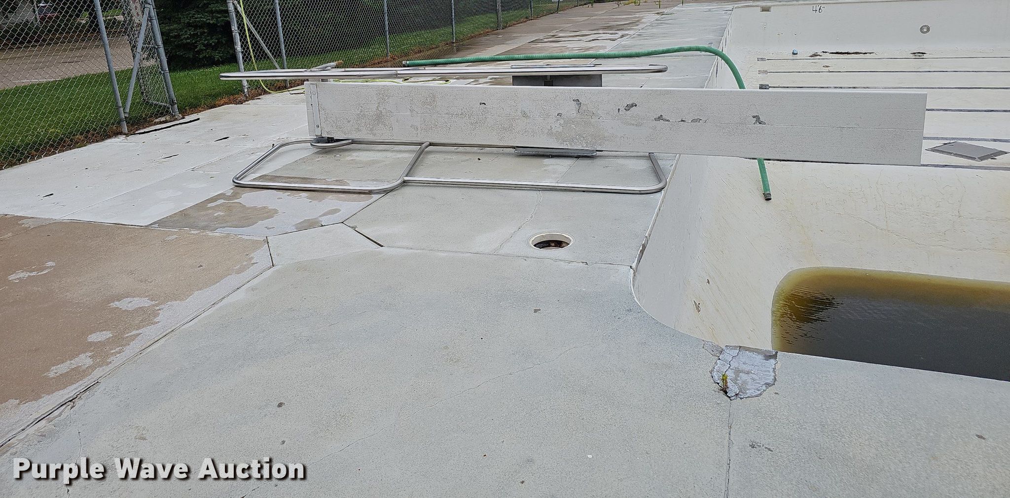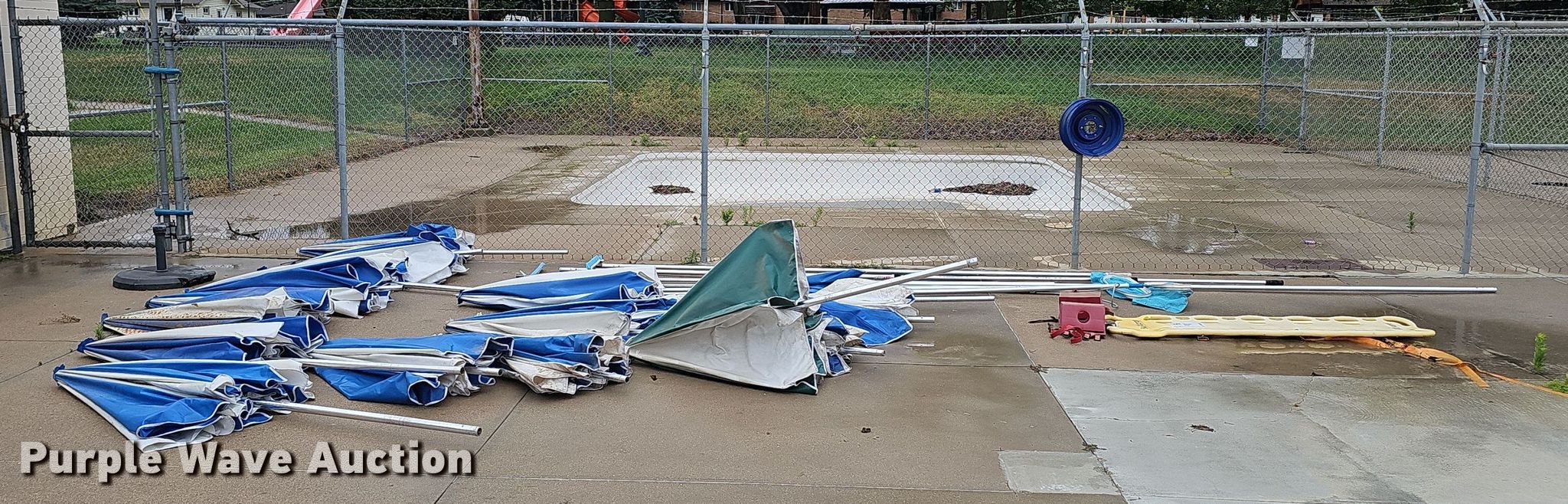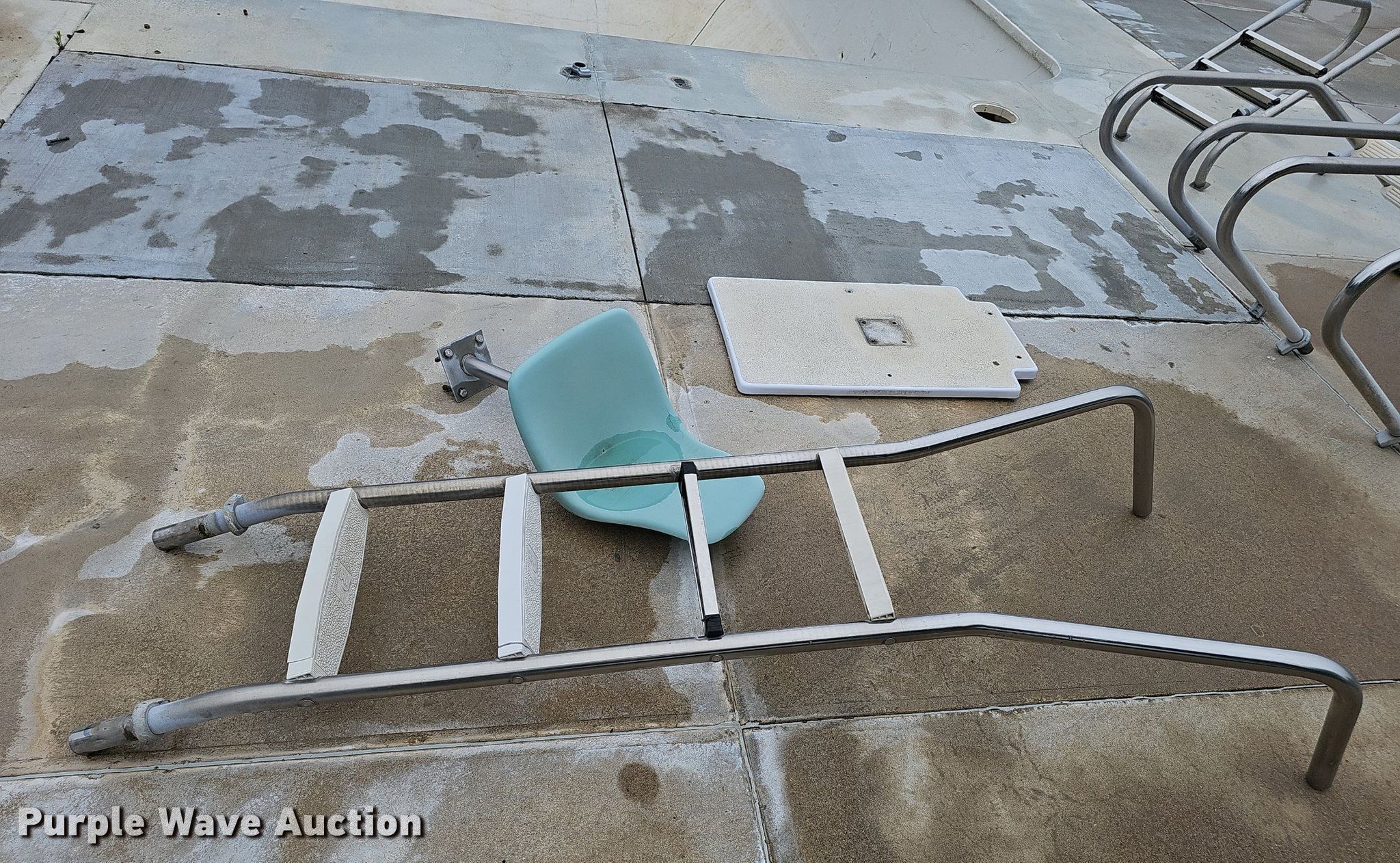 Purple Wave is selling a used Sporting Goods in Nebraska. This item is a Pool equipment with the following: Diving board, Length: 16', (4) pool ladders, (17) umbrellas, (6) umbrella bases, Aqua Creek Products F-2PR-B chair lift, Long handle pool nets and extensions