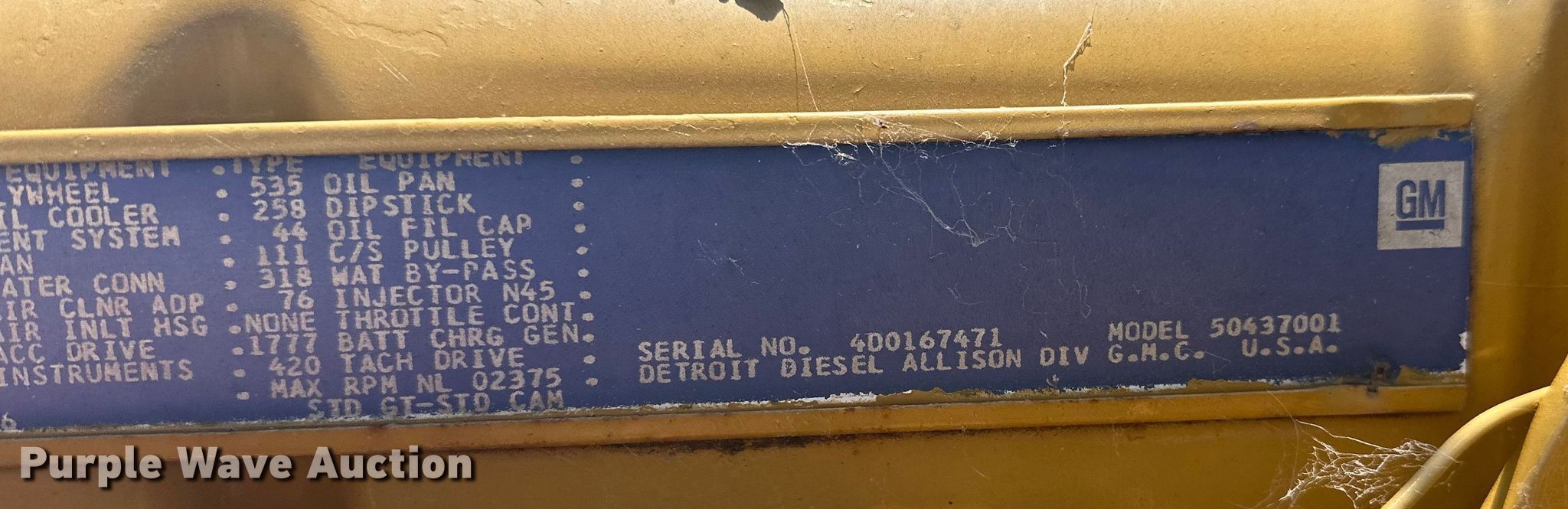 Crown 6C08D pump. Hours: 146 on meter, Serial: 400167471, Unit #: 4216. Engine Detroit 50437001, Serial: 4D0167471, Cylinders: 4, Fuel type: Diesel. Features Self-priming centrifugal pump Pump inlet: 6", Pump outlet: 6". Trailer 10' L x 82" W, Suspension: Spring, Hitch: Pintle. Tires Front: ST205/75D15. Notes Non-operational unit. Transfer of ownership documentation will be a bill of sale. Tulsa County Highway Construction Division - Open Inspection Monday, July 29. 6633 North 115th East Avenue. Owasso, OK 74055