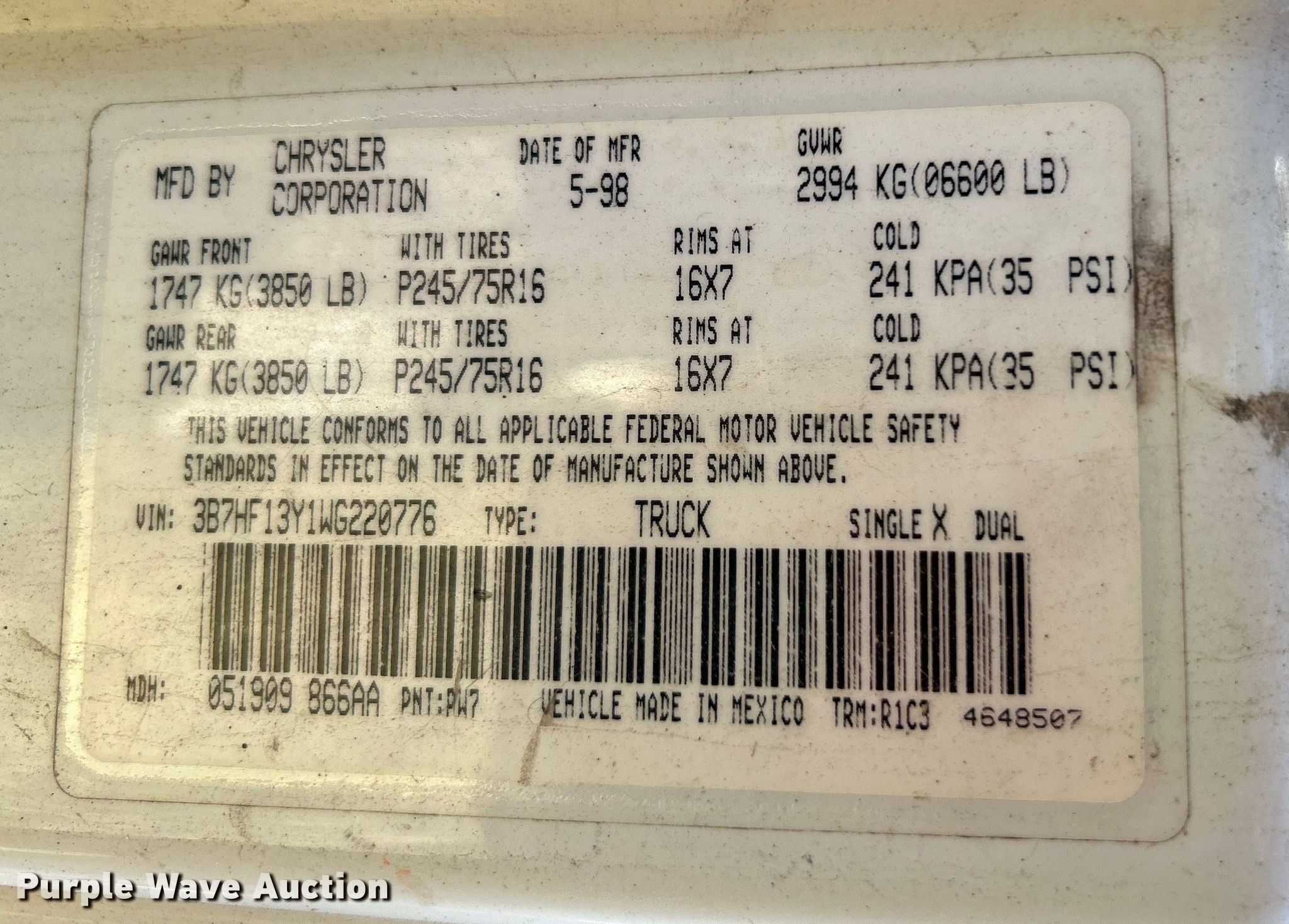 • VIN: 3B7HF13Y1WG220776