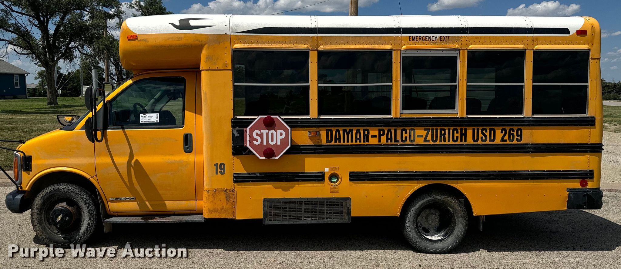 2001 Chevrolet Express school bus. Miles: 125,125 on odometer, VIN: 1GBJG31F411111364. Engine Displacement: 6.5L, Cylinders: 8, Fuel type: Diesel. Transmission Automatic. Chassis Axles: Single, Suspension: Spring, Brakes: Hydraulic, GVWR: 12,000 lbs. Interior AC, Heat, Passengers: 19, Adult seats: 10. Tires Size: 225/75R16. Notes Possible head gasket issues, Dead battery. Kansas title. Title distribution may be delayed up to 14 days from verification of funds. Palco USD 269. Palco, KS 67657