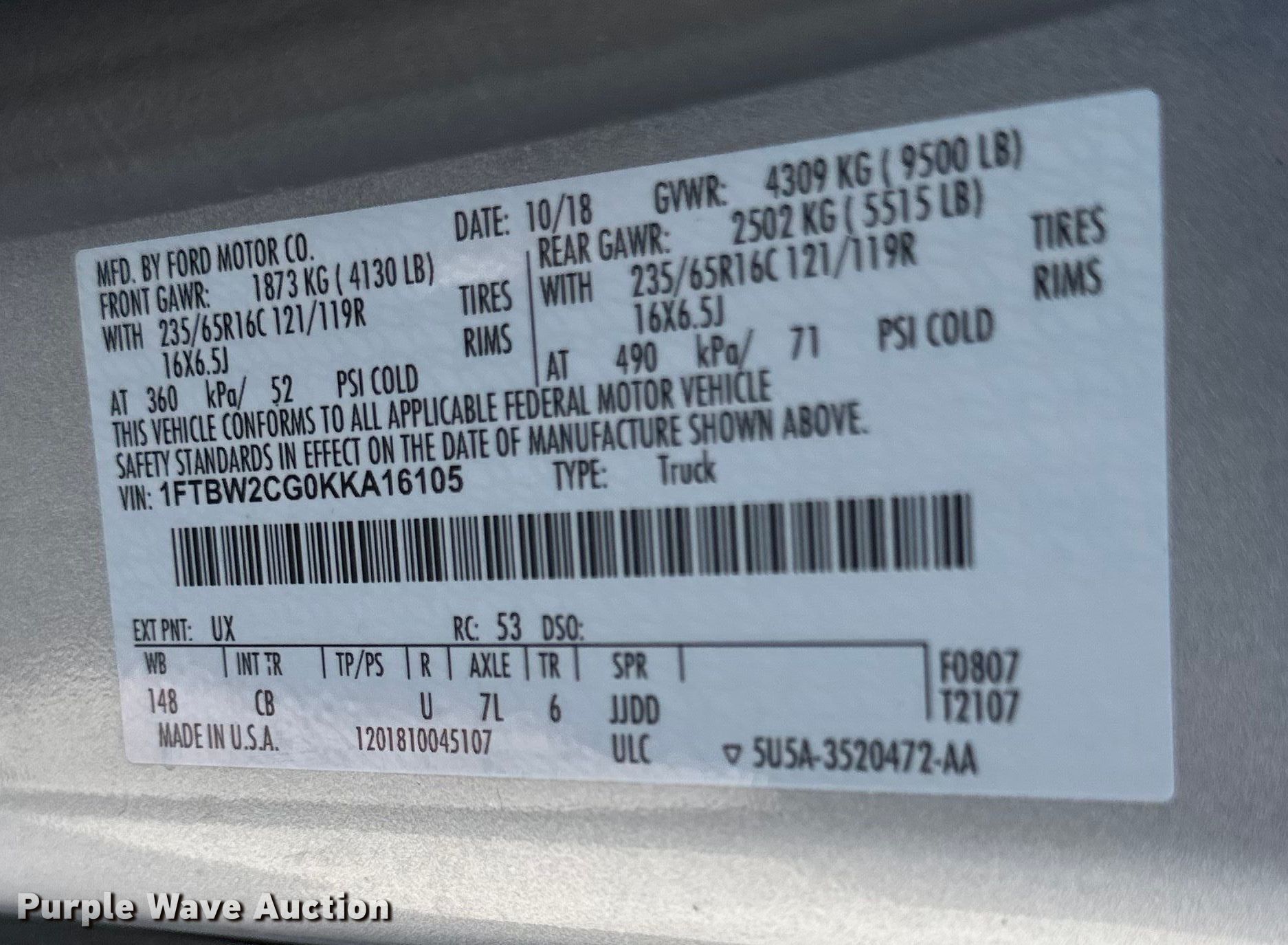 - VIN: 1FTBW2CG0KKA16105
