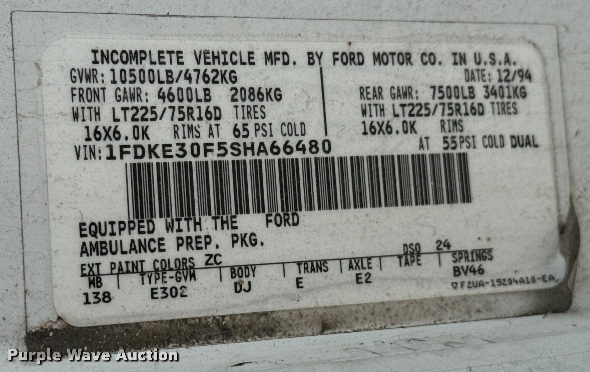 Purple Wave is selling a used Fire Truck or Emergency Vehicle in Kansas. This item is a 1995 Ford E350 ambulance with the following: Miles: 139,214 on odometer, VIN: 1FDKE30F5SHA66480