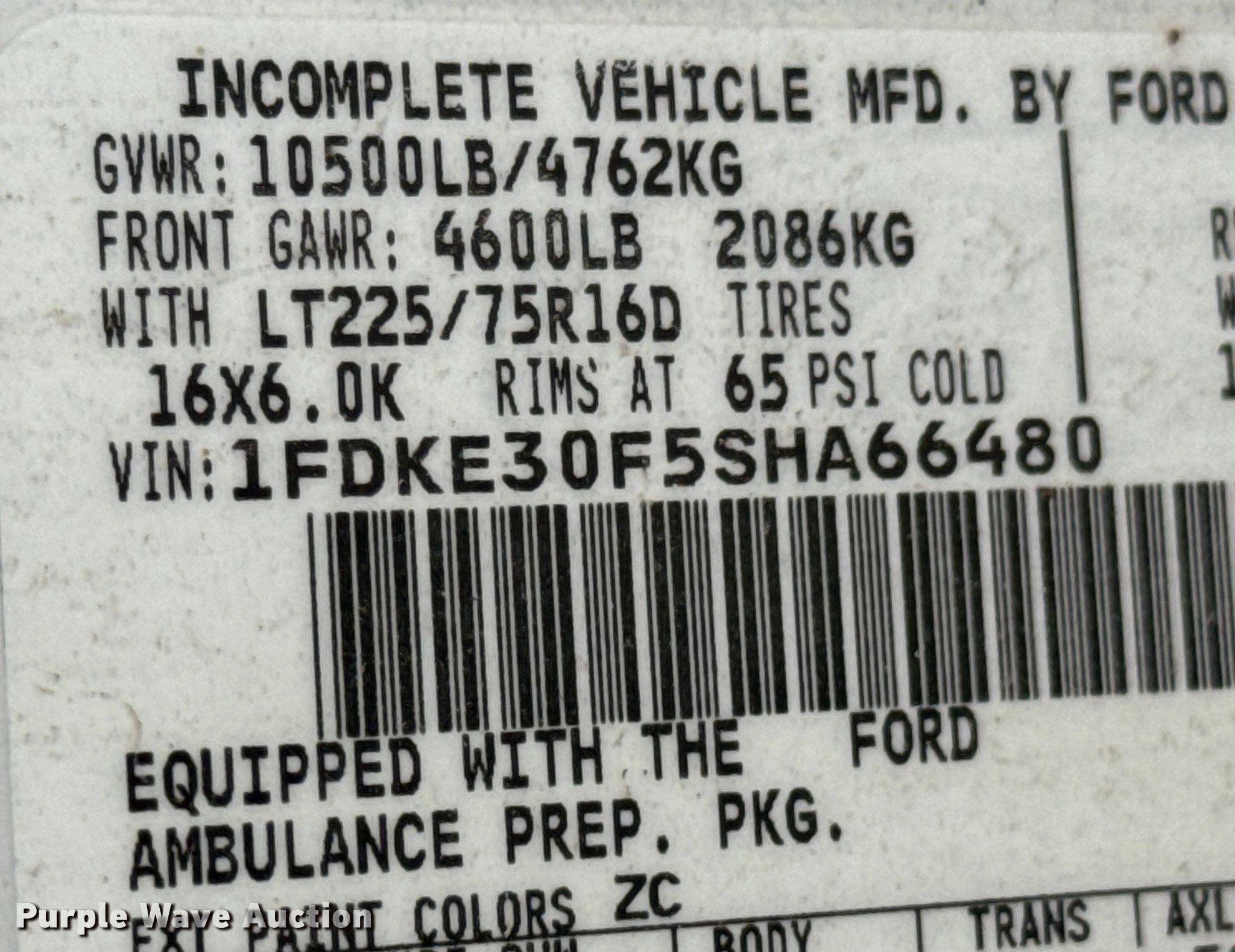 1995 Ford E350 ambulance. Miles: 139,214 on odometer, VIN: 1FDKE30F5SHA66480. Engine Displacement: 7.3L V8 OHV, Cylinders: 8, Fuel type: Diesel. Transmission Automatic. Chassis Axles: Single, Suspension: Spring, Brakes: Hydraulic, GVWR: 10,500 lbs. Interior AC, Heat, Power windows, Power locks, Cruise control. Features Ambulance body PA/ siren controls, Oxygen hookups. Tires Size: LT225/75R16. Notes Dead battery. Kansas title. Title distribution may be delayed up to 14 days from verification of funds. Montgomery County Rural Fire Dist. 1. Independence, KS 67301