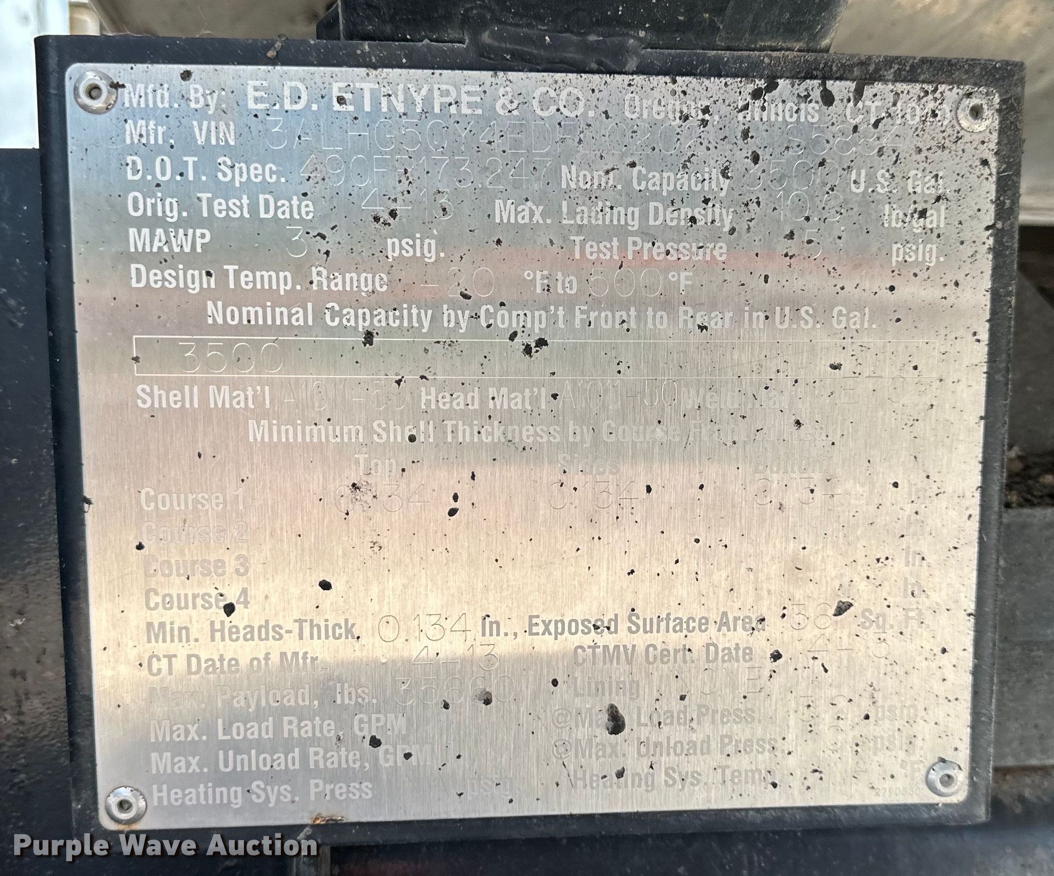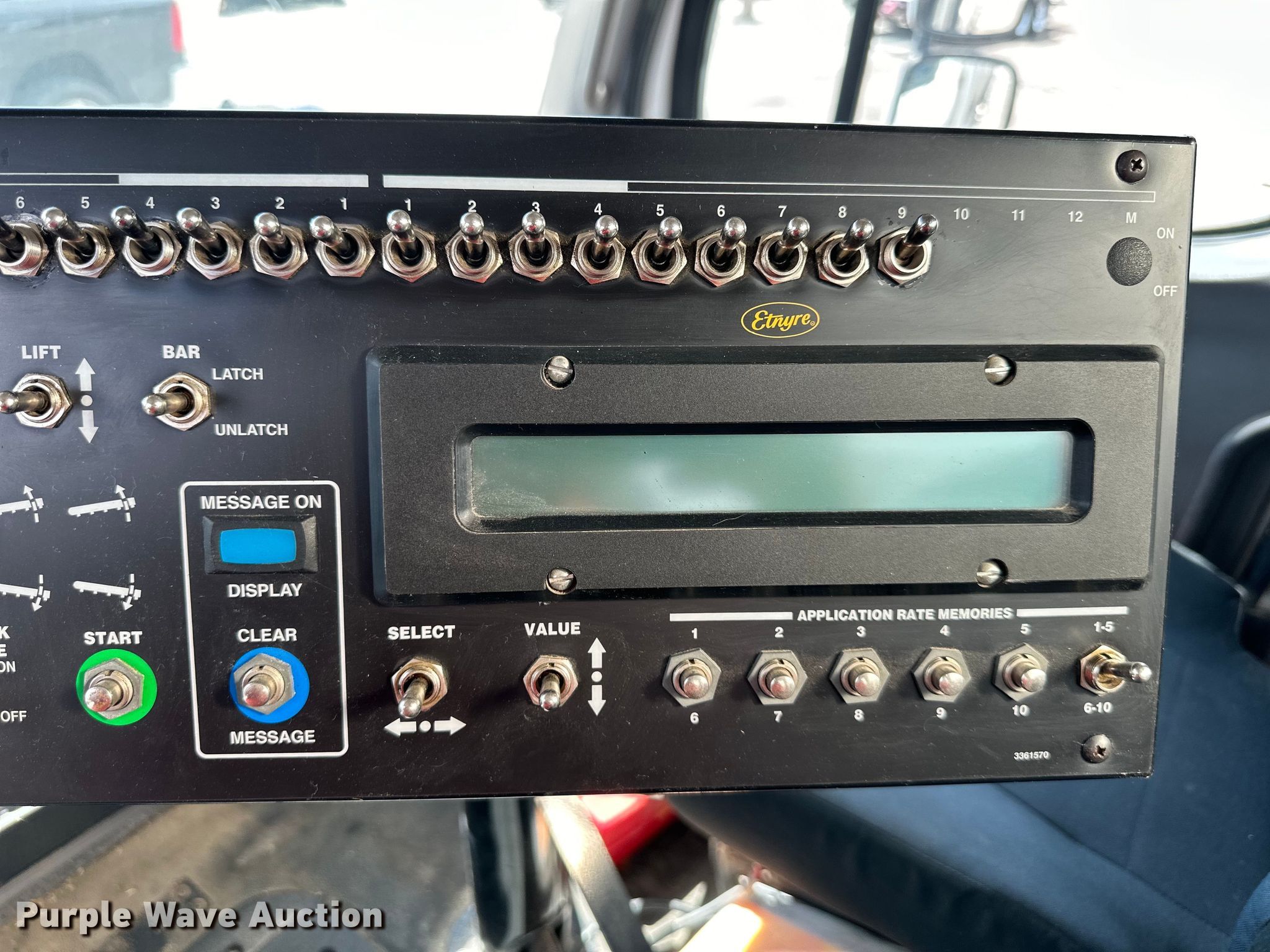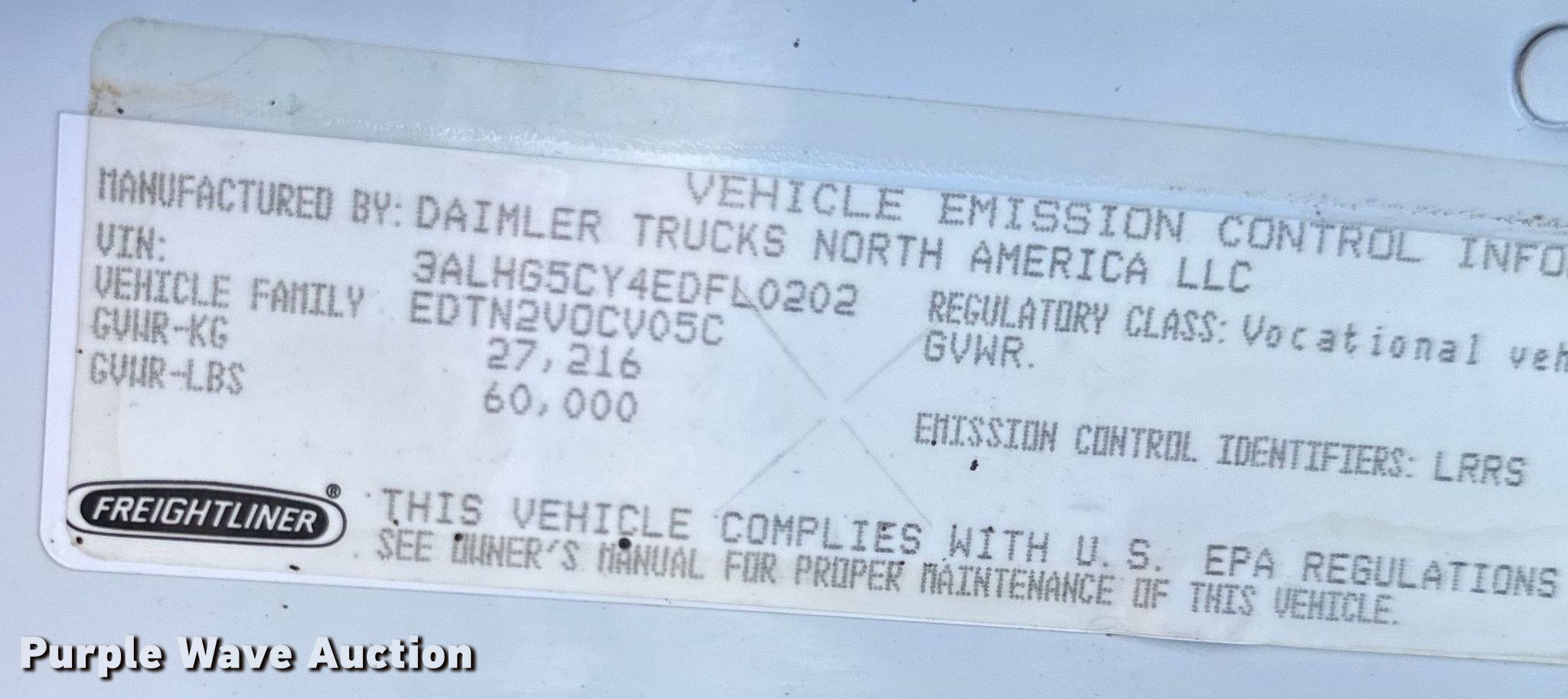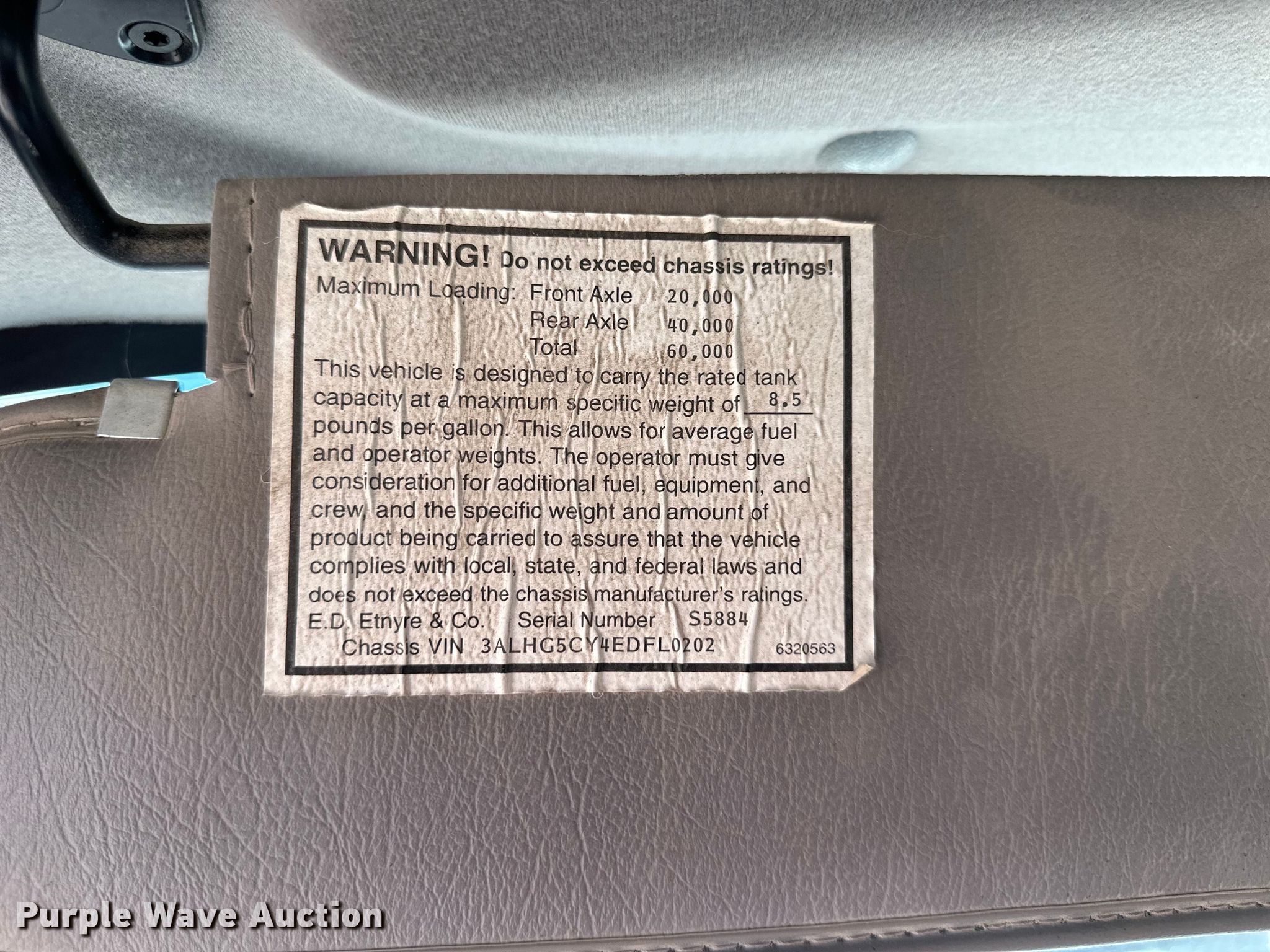 2014 Freightliner 108SD oil distributor truck. Miles: 31,488 on odometer, Hours: 4,636 on meter, VIN: 3ALHG5CY4EDFL0202. Engine Cummins ISB, Cylinders: 6, Fuel type: Diesel. Transmission Allison, Automatic. Chassis Axles: Tandem, Differential lock: Inter-axle, Suspension: Air, Brakes: Air, PTO, GVWR: 60,000 lbs. Interior AC, Heat, Cruise control. Features Bed / tank Etnyre, Capacity: 3,500 gallons, 15' L x 96" W, Burner: LPG, In-cab controls, Spray wand, Spray boom Width: 16', Folding, Nozzles: 50.. Tires Front: 315/80R22.5, Rear: 11R22.5. Kansas title. Title distribution may be delayed up to 14 days from verification of funds. Leavenworth County. Leavenworth, KS 66048