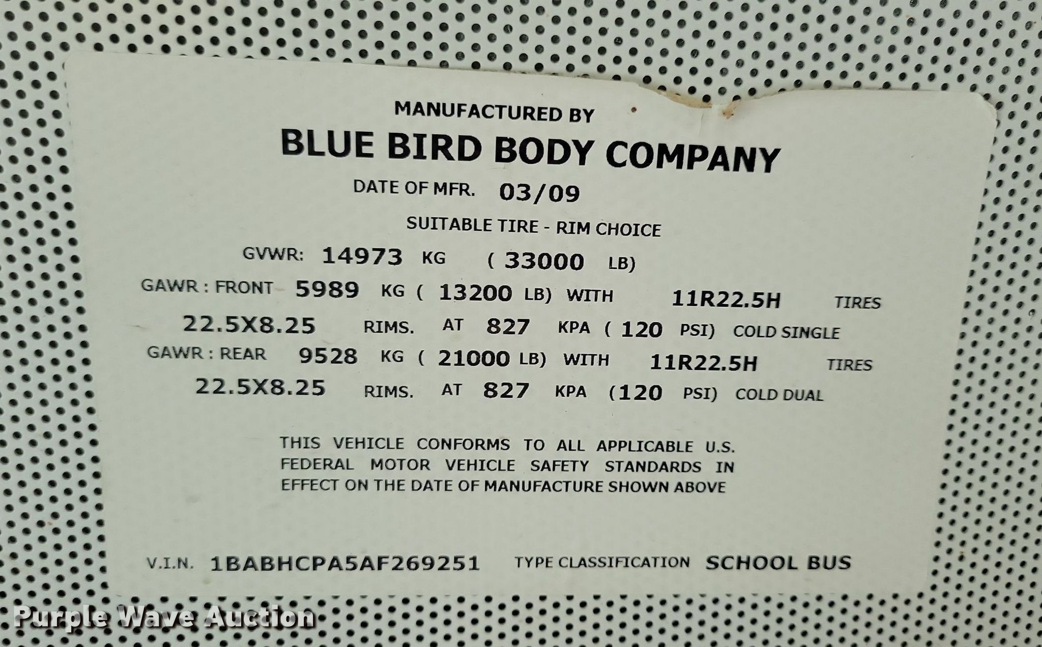 2010 Bluebird school bus. Miles: 105,018 on odometer, VIN: 1BABHCPA5AF269251. Engine Cummins ISB, Serial: 46978242, Displacement: 6.7L, Cylinders: 6, Fuel type: Diesel, HP: 240. Transmission Allison, Automatic. Chassis Axles: Single, Suspension: Air, Brakes: Air, GVWR: 33,000 lbs. Interior Heat, Cruise control, Passengers: 72. Tires Size: 11R22.5. Notes Dash warning indicator: Check engine. Iowa title. Seller is a government entity who will be assigning and distributing the title. Please contact the seller for distribution questions. Nodaway Valley Schools. Greenfield, IA 50849