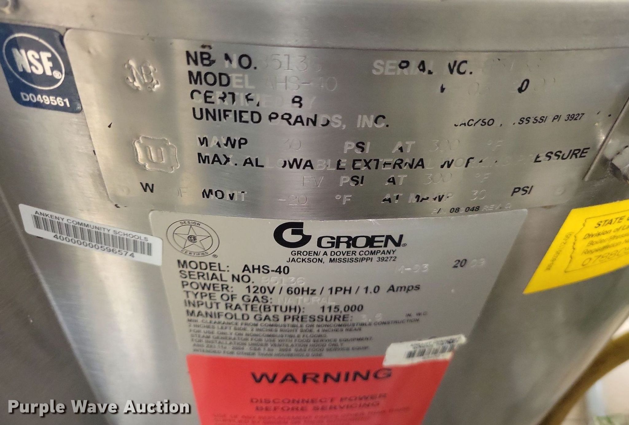 Purple Wave is selling a used Restaurant Equip. in Iowa. This item is a 2009 Groen AHS-40 steam kettle with the following: Serial: 85136, Gas, Volts: 120, BTU: 115,000