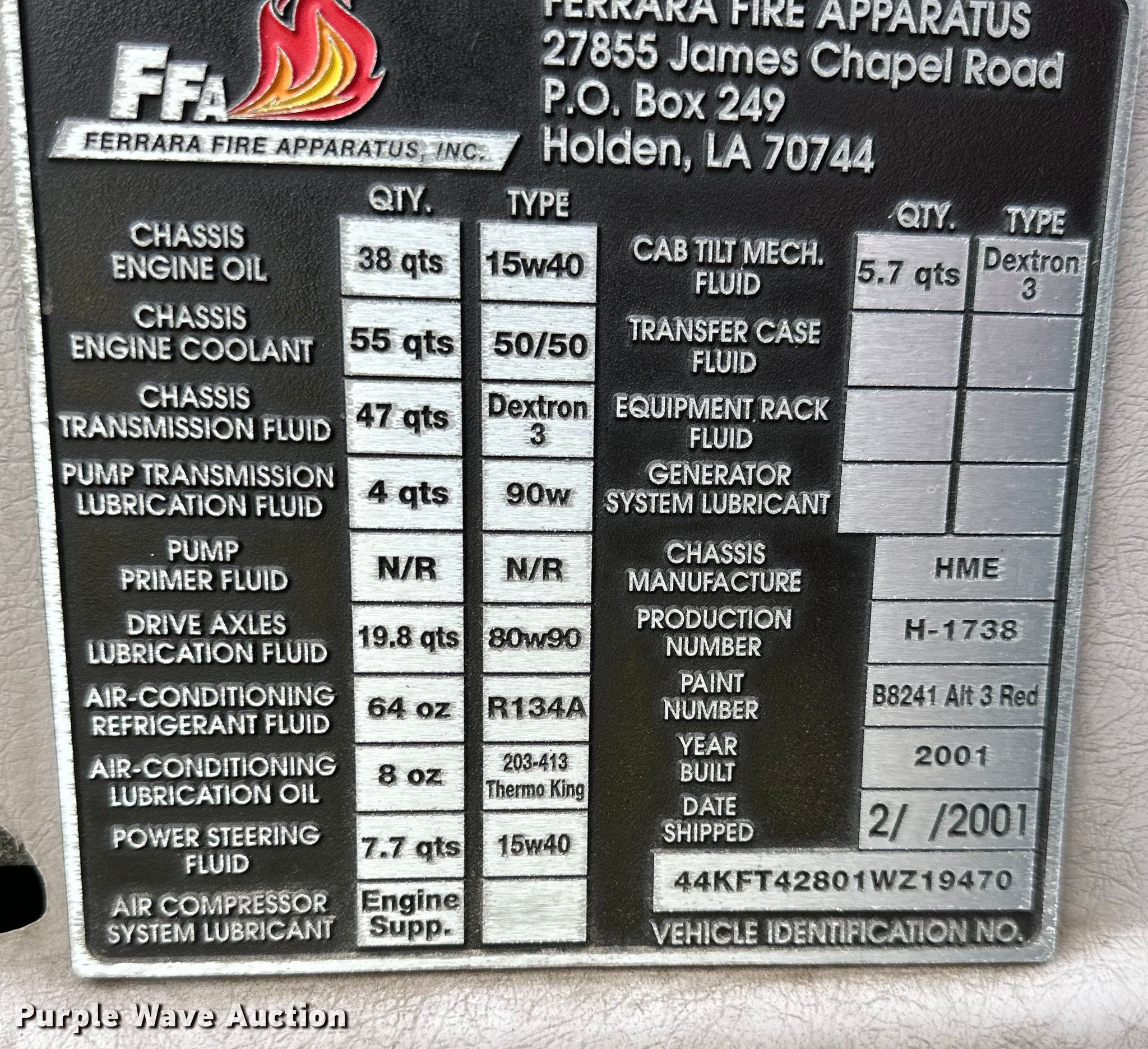 2001 HME H1738 pumper fire truck. Miles: 89,086 on odometer, Hours: 11,044 on meter, VIN: 44KFT42801WZ19470. Engine Detroit Diesel Series 60, Displacement: 12.7L, Cylinders: 6, Fuel type: Diesel. Transmission Automatic. Chassis Axles: Single, Suspension: Spring, Brakes: Air. Interior AC, Heat, Auxiliary controls. Features Fire truck body Ferrara Fire Apparatus Hale OSG125, Elevated deck gun, Pump 633 gpm.. Tires Front: 385/65R22.5, Rear: 11R22.5. Notes Pump issues, Unknown operating condition. Kansas title. Kansas City, KS 66106