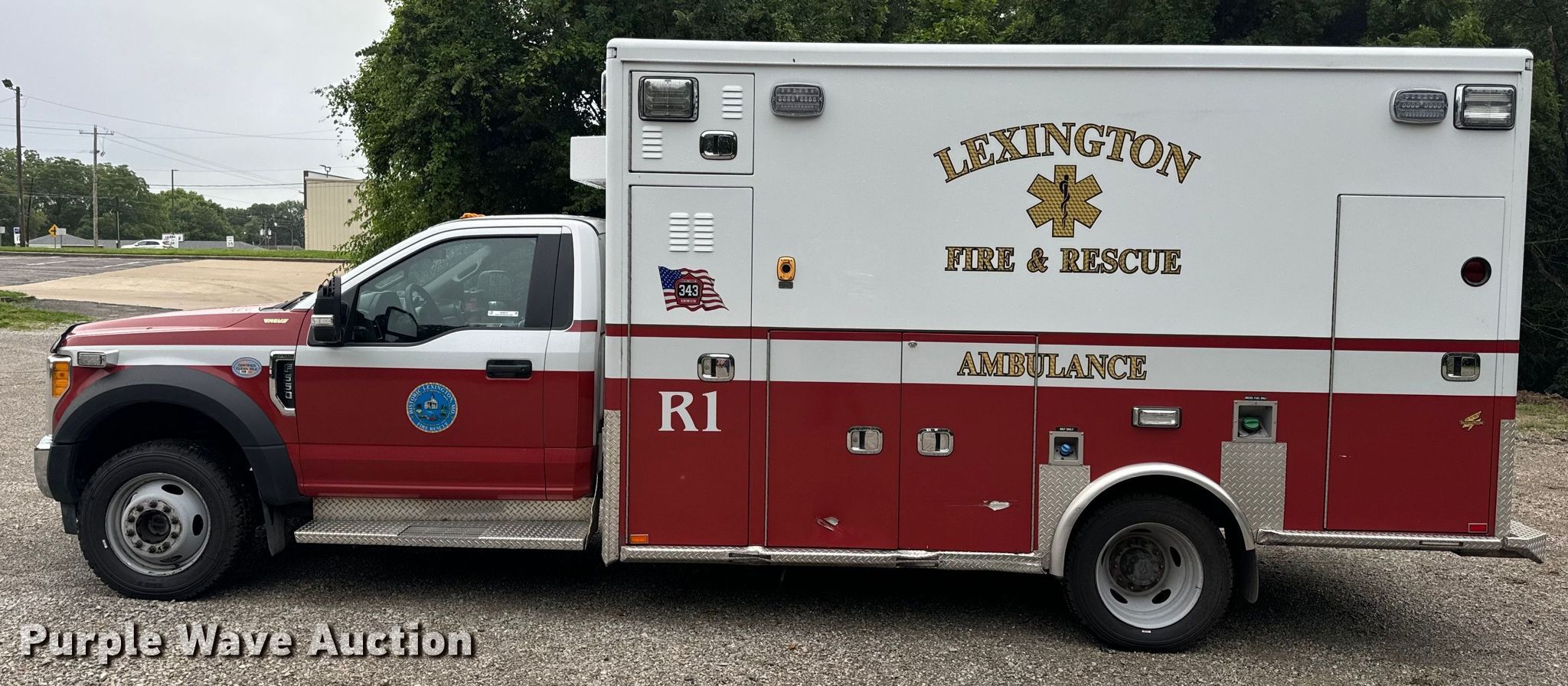 2017 Ford F550 XLT ambulance. Miles: 201,318 on odometer, Hours: 7,031 on meter, VIN: 1FDUF5HT1HEB62239. Engine Displacement: 6.7L, Cylinders: 8, Fuel type: Diesel. Transmission Automatic. Chassis Axles: Single, Suspension: Spring, Brakes: Hydraulic, GVWR: 18,000 lbs. Interior AC, Heat, Heated mirrors, Power windows, Power locks, Cruise control, Backup camera, Auxiliary controls, Brake controller. Features Ambulance body AEV TraumaHawk, PA/ siren controls, Oxygen hookups, Stryker PowerPro XT Capacity: 700 lbs. Tires Size: 225/70R19.5. Missouri title. Seller is a government entity who will be assigning and distributing the title. Please contact the seller for distribution questions. Title distribution may be delayed up to 14 days from verification of funds. City of Lexington, MO -Fire Department/EMS. Lexington, MO 64067
