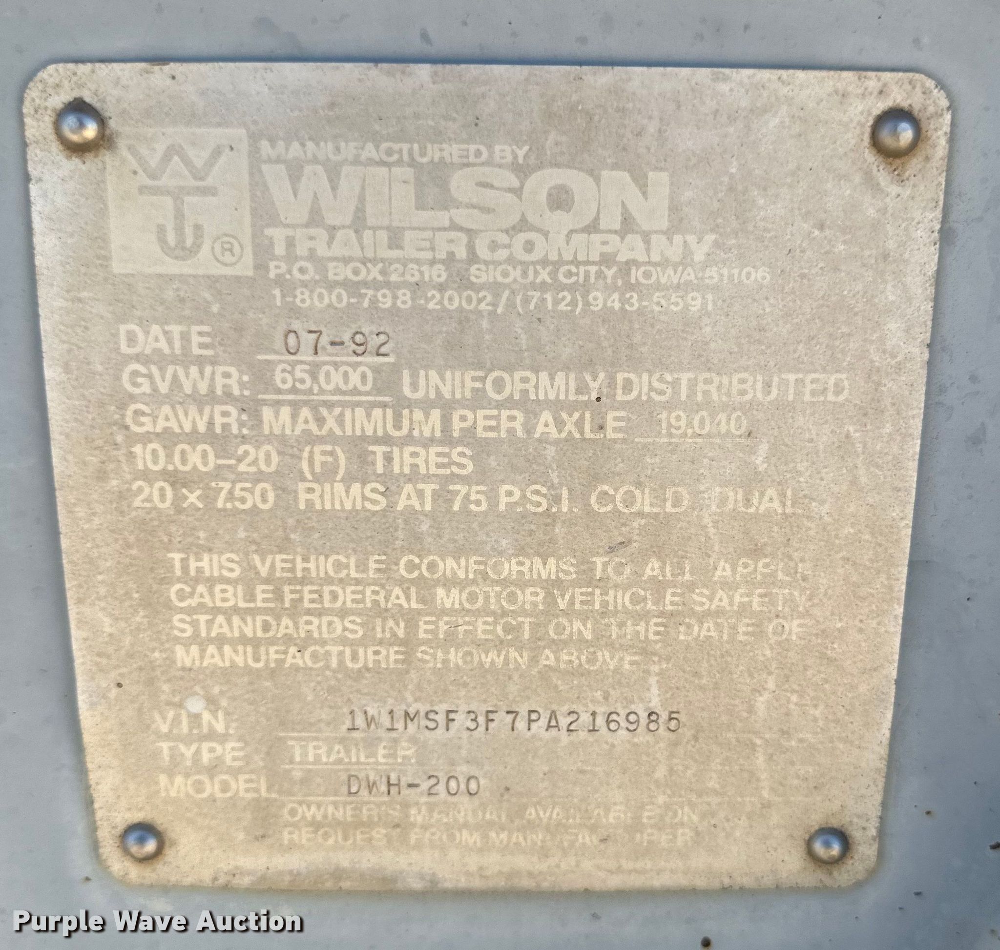 Purple Wave is selling a used Grain or Commodity Trailer in Texas. This item is a 1993 Wilson DWH-200 grain trailer with the following: VIN: 1W1MSF3F7PA216985