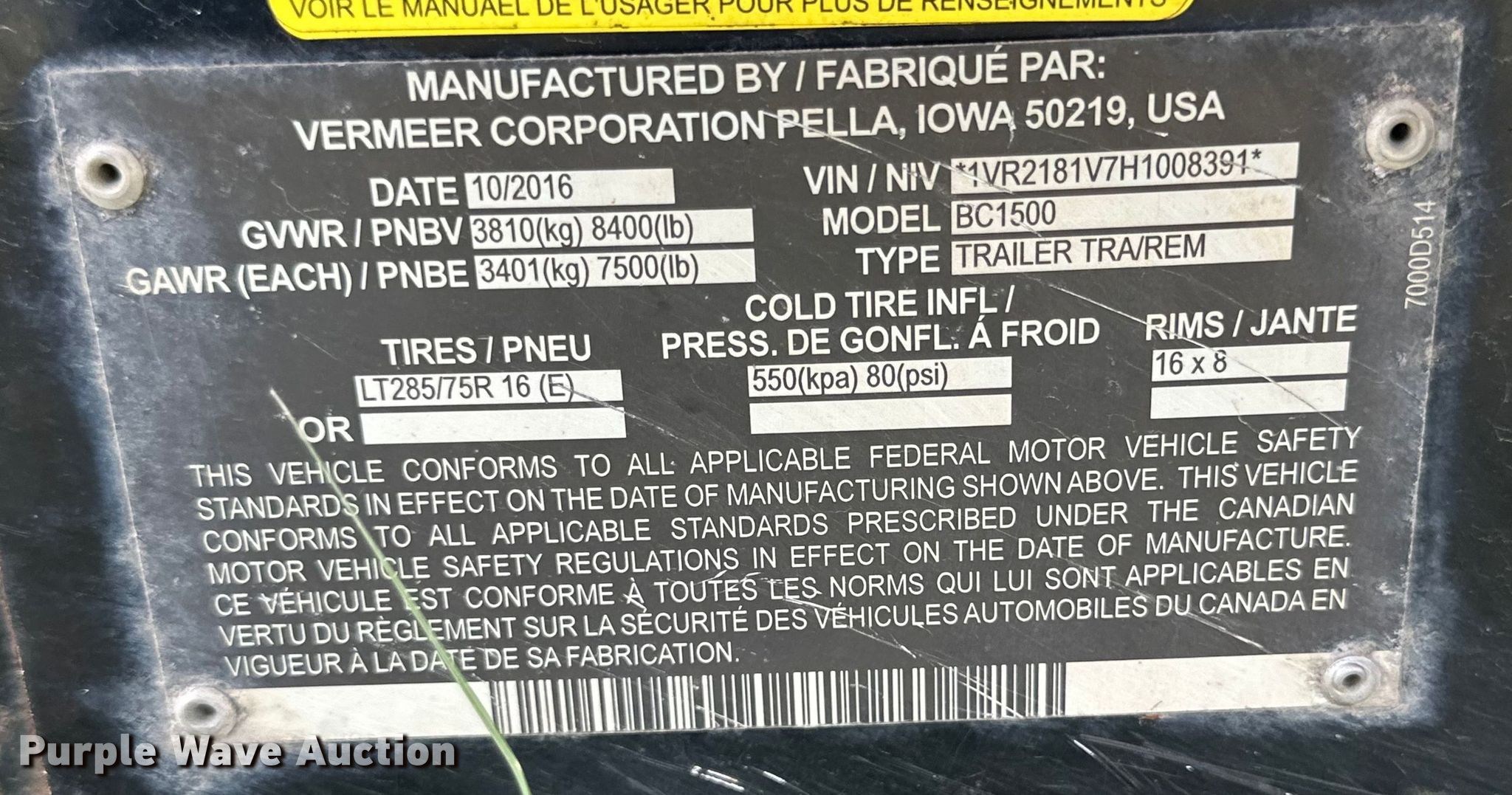 2017 Vermeer BC1500 wood chipper. Hours: 1,508 on meter, VIN: 1VR2181V7H1008391. Engine Cummins, Cylinders: 4, Fuel type: Diesel. Features Throat opening: 34" x 20", Cutting head diameter: 20". Tires Size: 235/75R17.5. Trailer 15' L x 86" W, Ball hitch size: 2 5/16", Suspension: Spring, Axles: Single, Tire size: 235/75R17.5, GVWR: 8,400 lbs, GAWR: 7,500 lbs. This is worksite support equipment and will not come with a title. Transfer of ownership documentation will be a bill of sale. H&H Enterprises. Amarillo, TX 79124