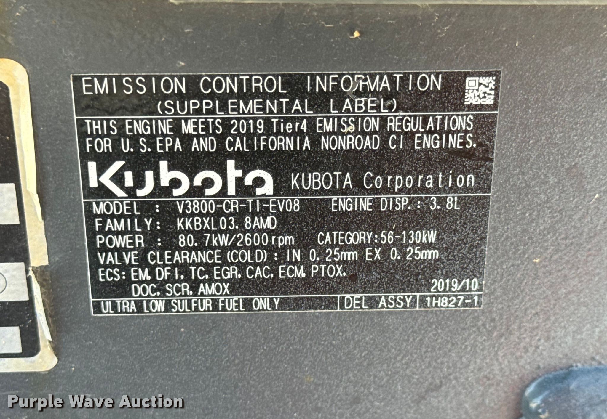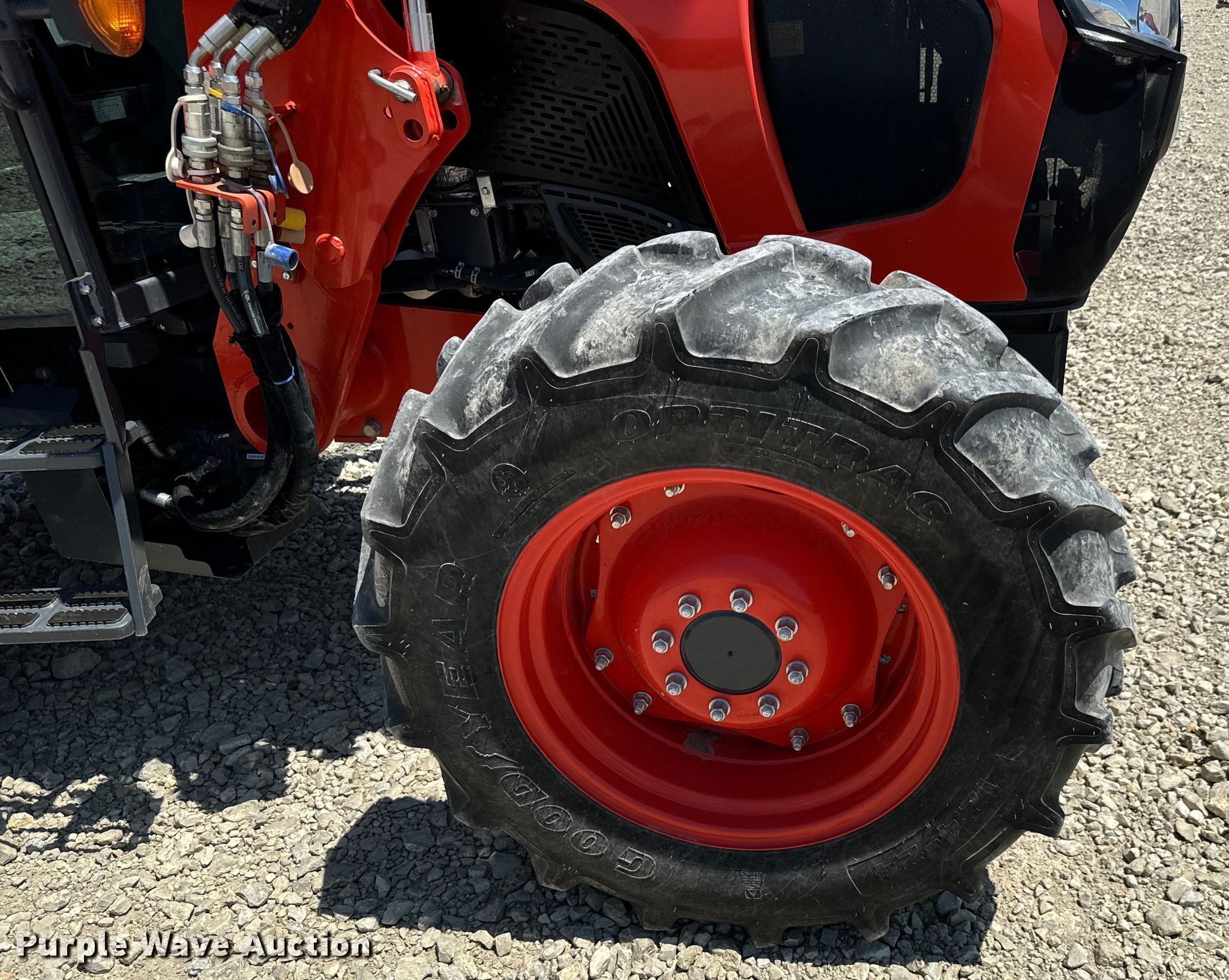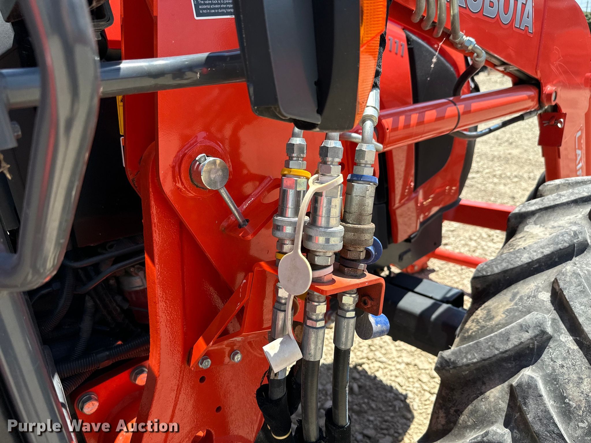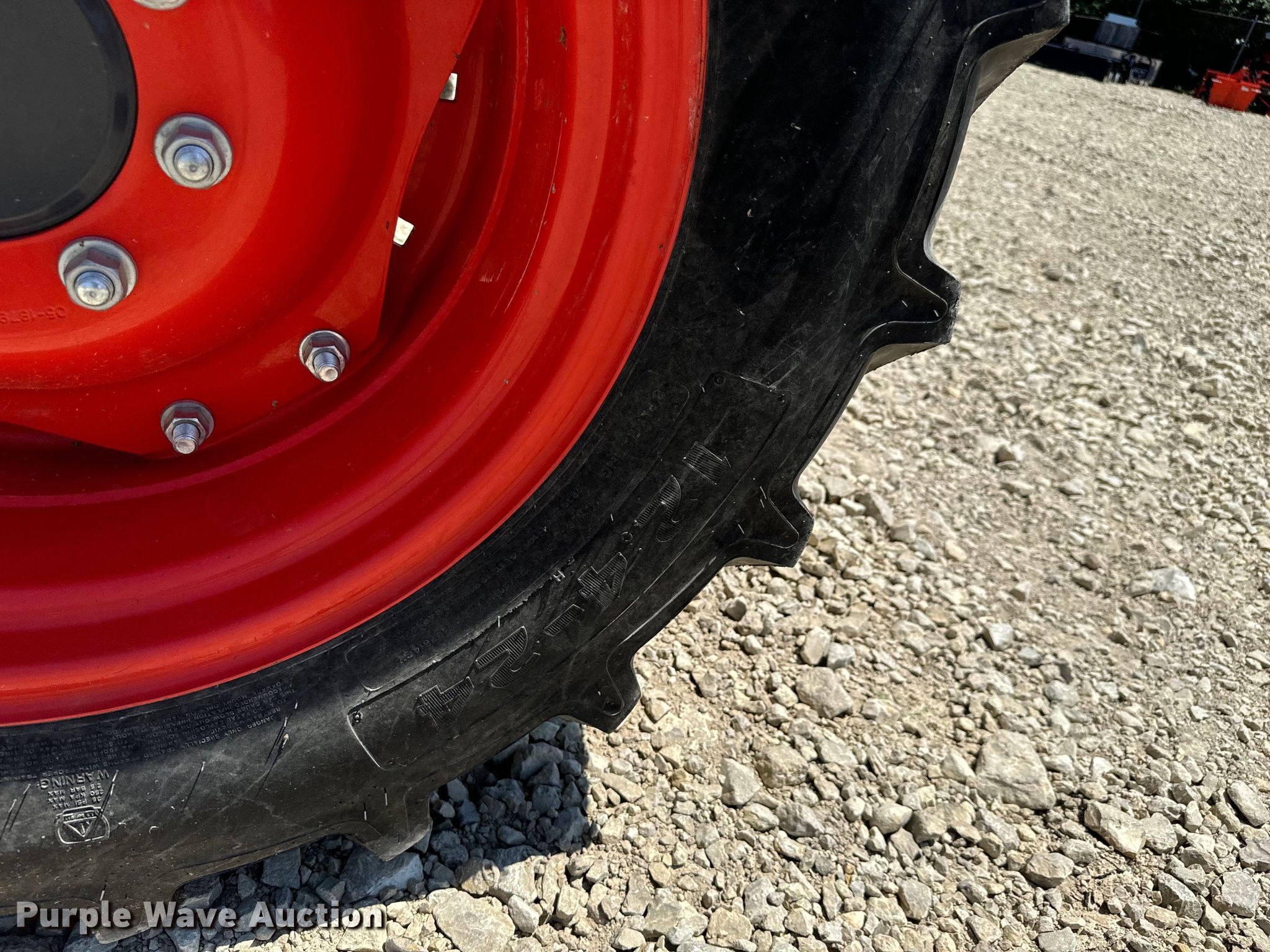 2020 Kubota M5-111D MFWD tractor. Hours: 614 on meter, Serial: KBUM4EDCAK8L62223. Engine Kubota V3800-CR-TI-EV08, Displacement: 3.8L, Cylinders: 4, Fuel type: Diesel. Transmission 8F - 8R, Left-hand reverser, Differential lock. Features PTO: 540, Three point Top link, Seven pin outlet, Hydraulic remote sets Rear: 3, Loader Kubota LA1854S, Quick attach, Controls: Joystick. Tires Front: 12.4-24, Rear: 18.4-30. Notes No manufacture's warranty. Kubota Tractor Corp. Salina, KS 67401