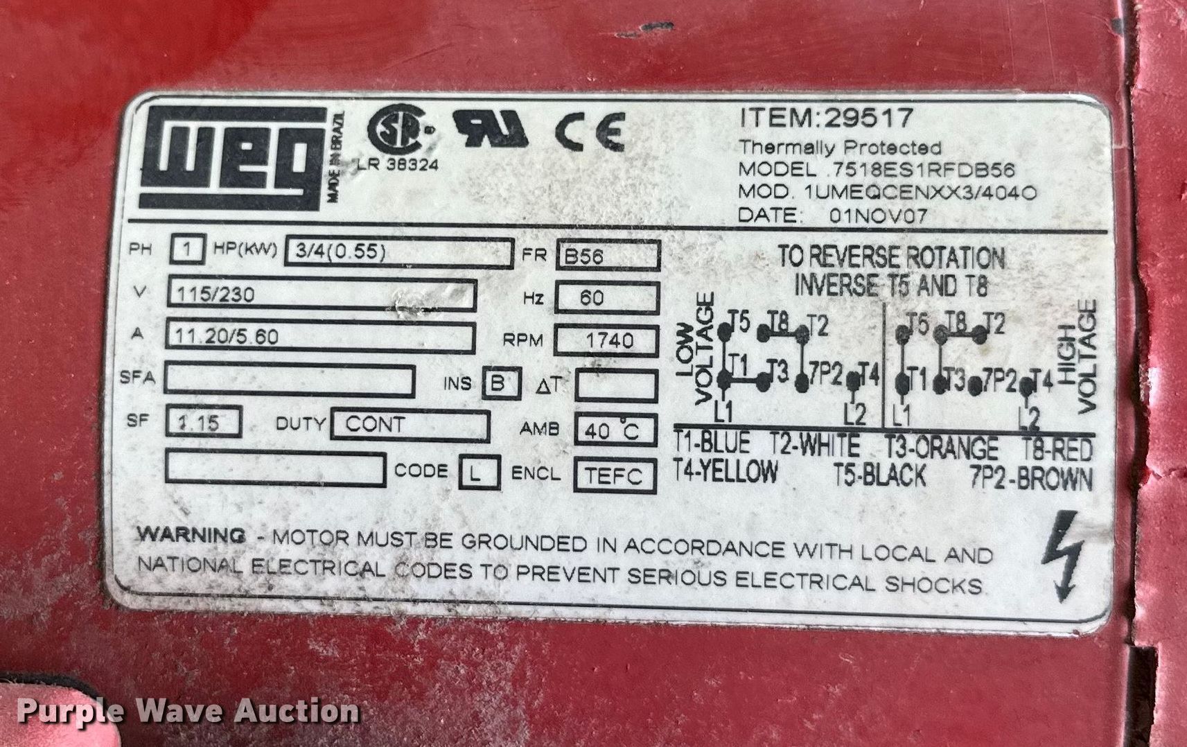 (2) augers. Westfield auger. Serial: 157700W. Electric Motor Marathon Electric, HP: 1.5, Volts: 115/208-230, Phase: Single. Features Length: 16', Diameter: 6". Auger Electric Motor Weg 7518ES1RFDB56, Volts: 115/230, Phase: Single. Features Length: 11', Diameter: 4". Notes Unknown operating condition. Stan Kolar Farms LLC. Keokuk Falls, OK 74864