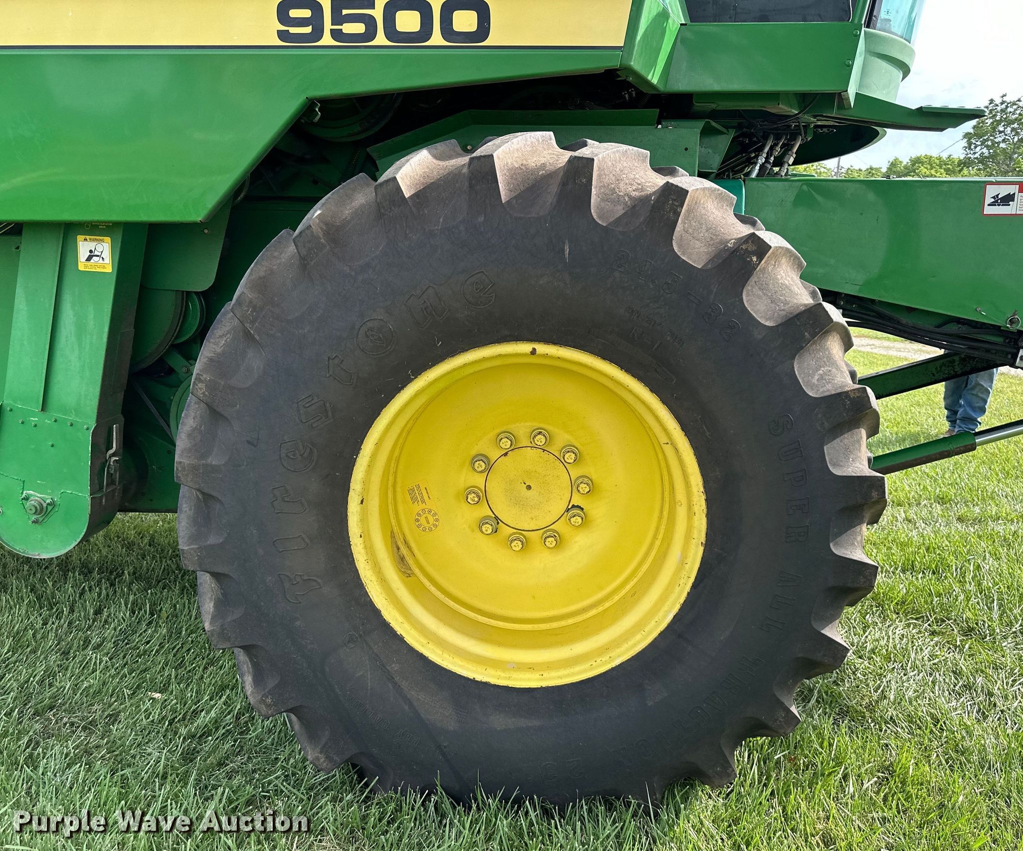 1994 John Deere 9500 combine. Engine hours: 4,645 on meter, Separator hours: 3,314 on meter, Serial: HO9500X656608. Engine John Deere, Displacement: 7.6L, Cylinders: 6, Fuel type: Diesel. Transmission Hydrostatic. Interior AC, Heat. Features Operator manual, Feederhouse: Reverser, Multi-speed, Chaff spreader, Straw chopper, Unloading auger length: 18'. Tires Front: 24.5-32, Rear: 14.9-24. David Oelschlaeger. Linwood, KS 66052