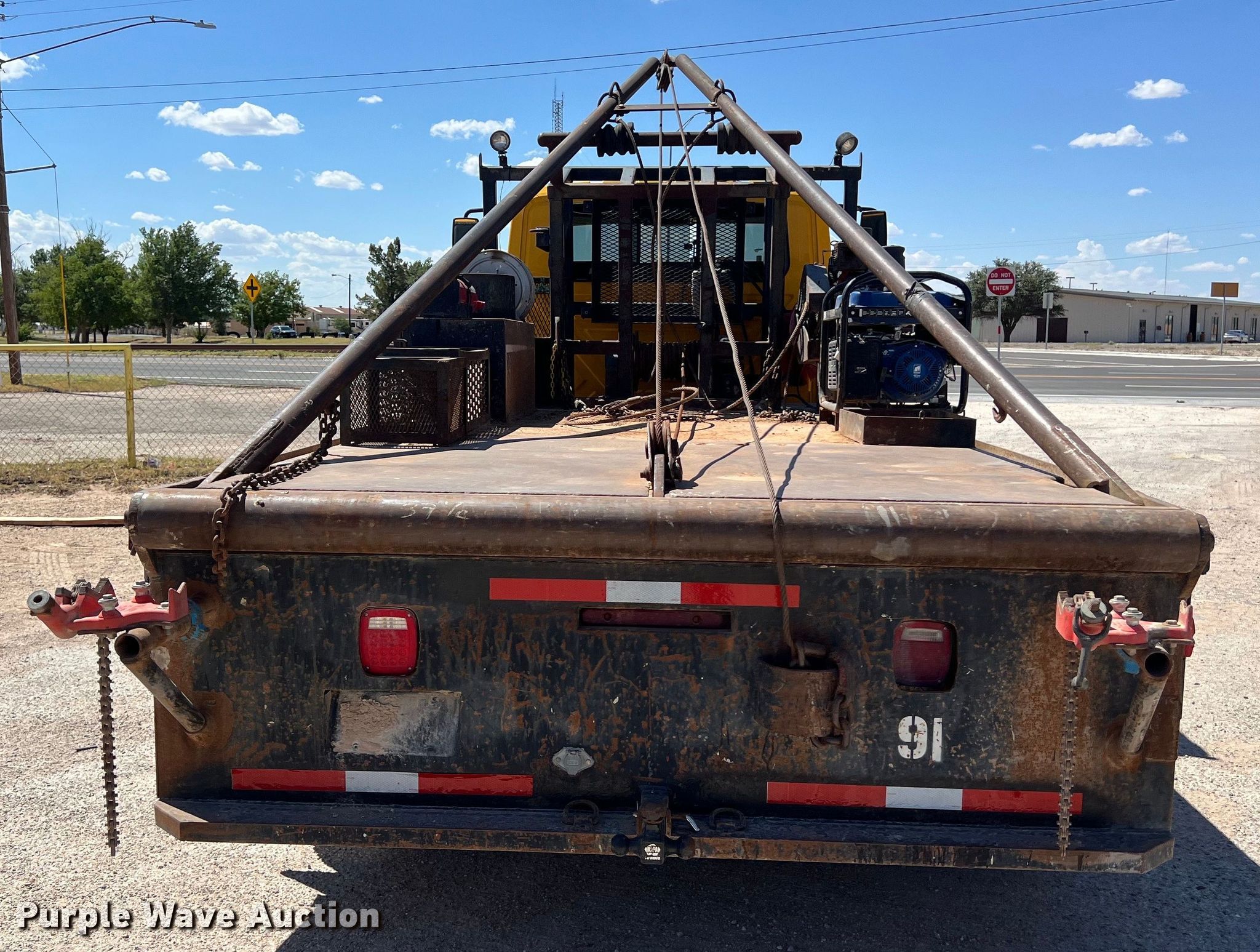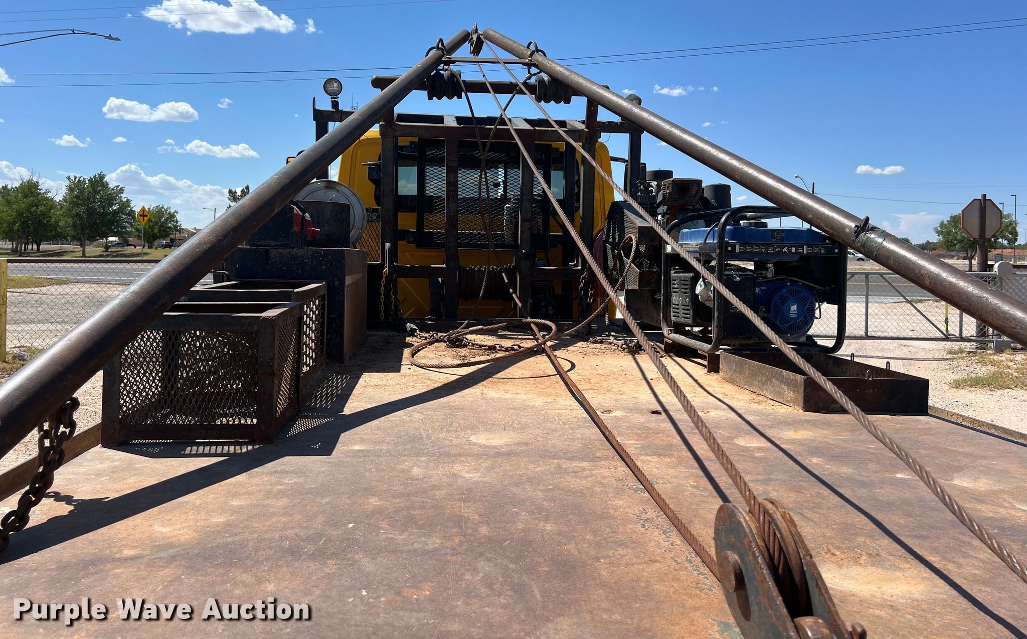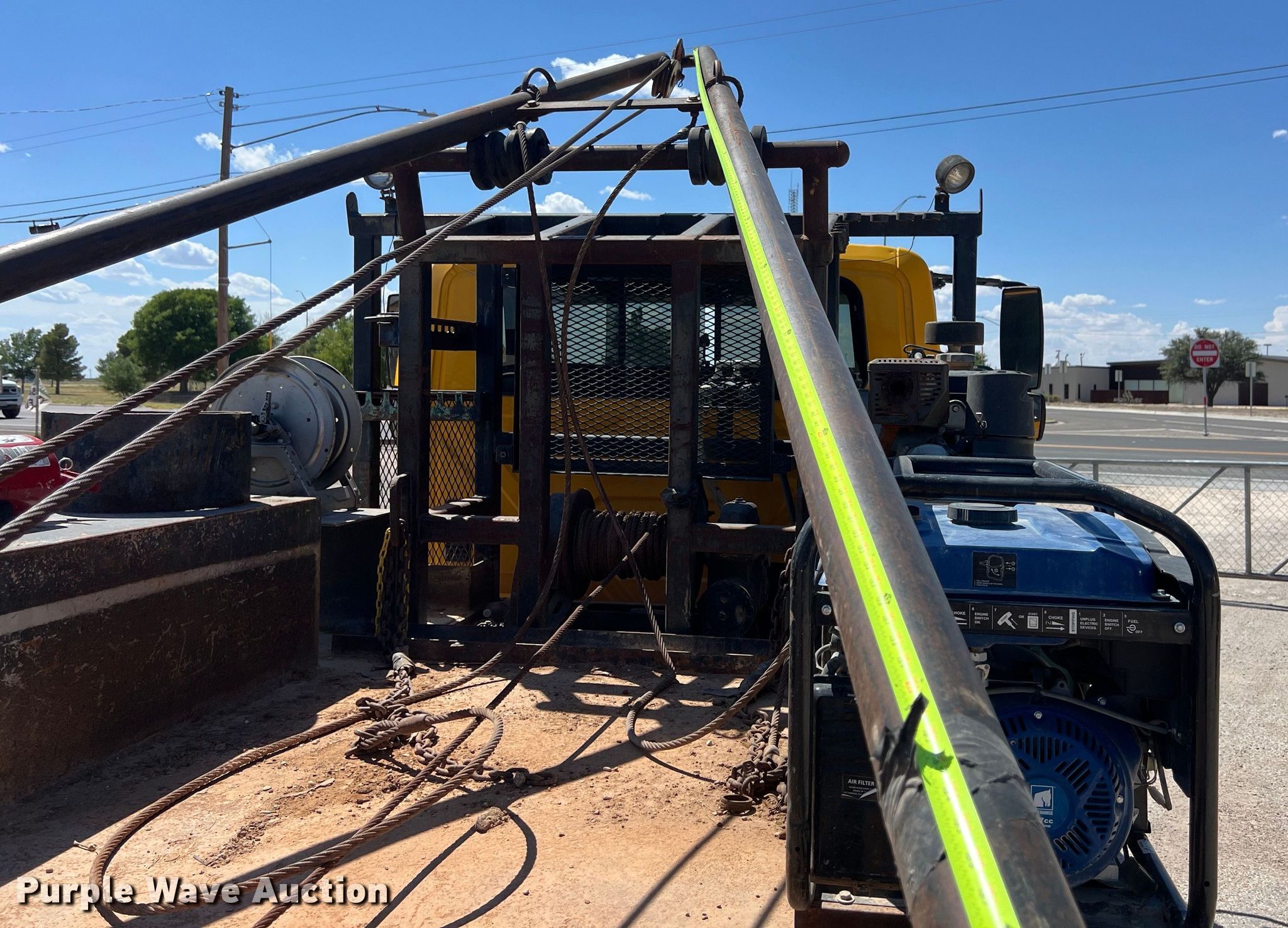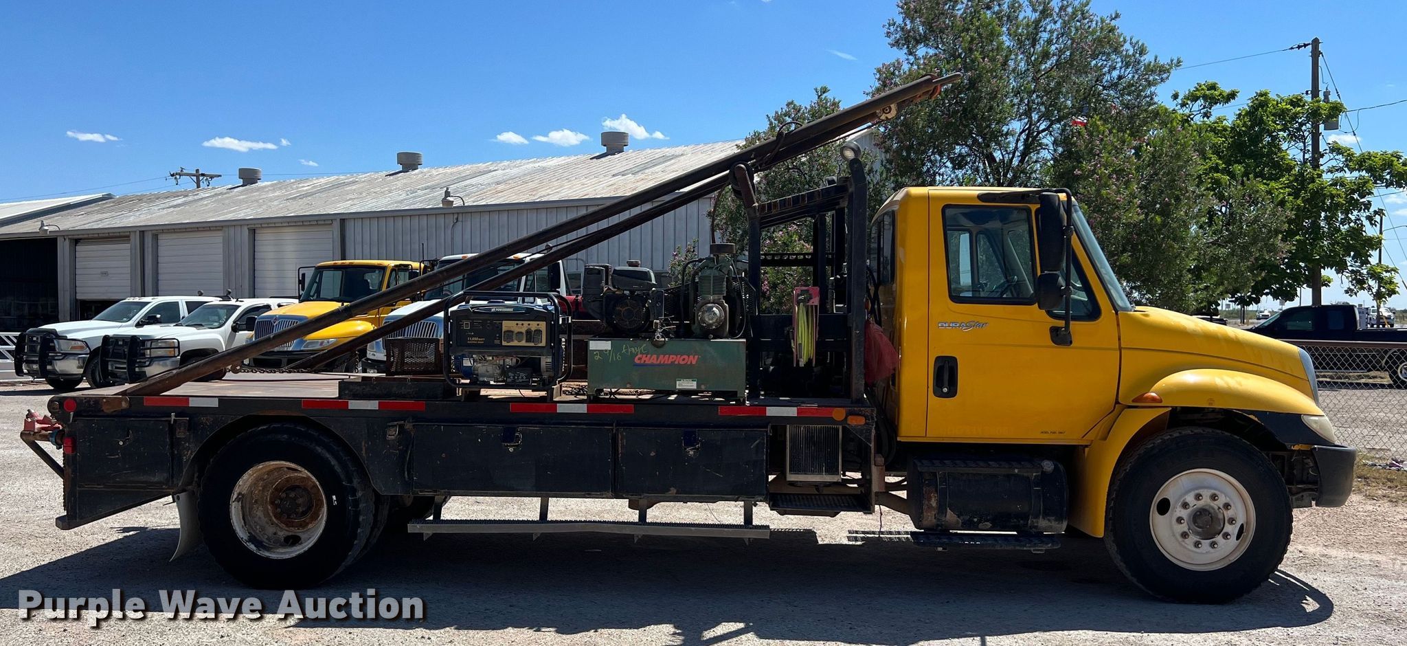 2009 International DuraStar 4300 winch truck. Miles: 144,558 on odometer, Hours: 8,943 on meter, VIN: 1HTMMAAM79H693731. Engine Displacement: 7.6L, Cylinders: 6, Fuel type: Diesel. Transmission Automatic. Chassis Axles: Single, Suspension: Spring, Brakes: Hydraulic, PTO, Wet kit, GVWR: 25,500 lbs. Interior AC, Heat, Cruise control. Features Flatbed 16' L x 96" W, Gin pole length: 18', Winch, Rolling tailboard, Champion air compressor, Powerhorse generator. Tires Size: 11R22.5. Notes Dash warning indicator: ABS, Windshield chipped or cracked, Unknown operating condition of air compressor. View repairs. Texas title. Title distribution may be delayed up to 14 days from verification of funds. Stewart Welding & Machine Inc. - Open Inspection July 24. Andrews, TX 79714