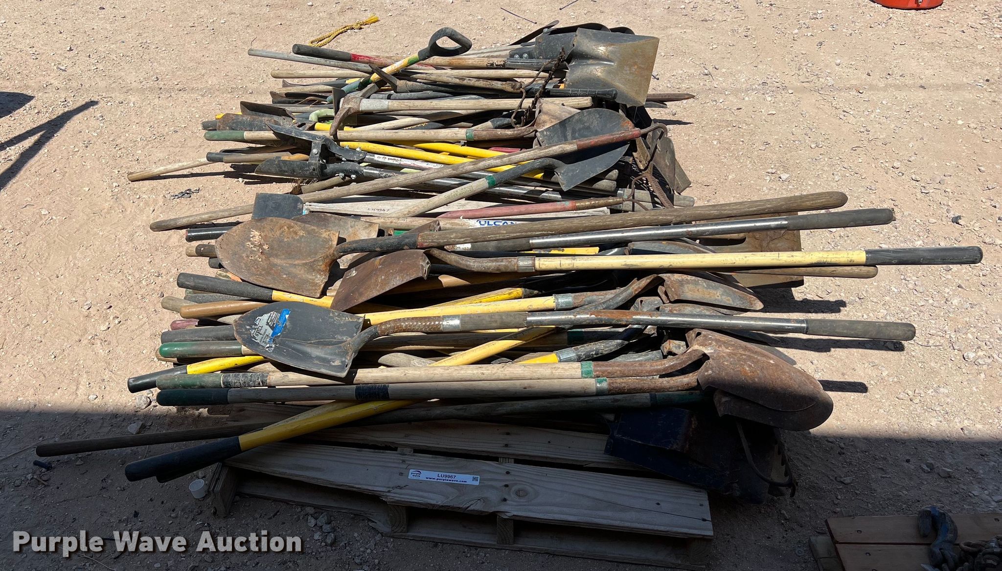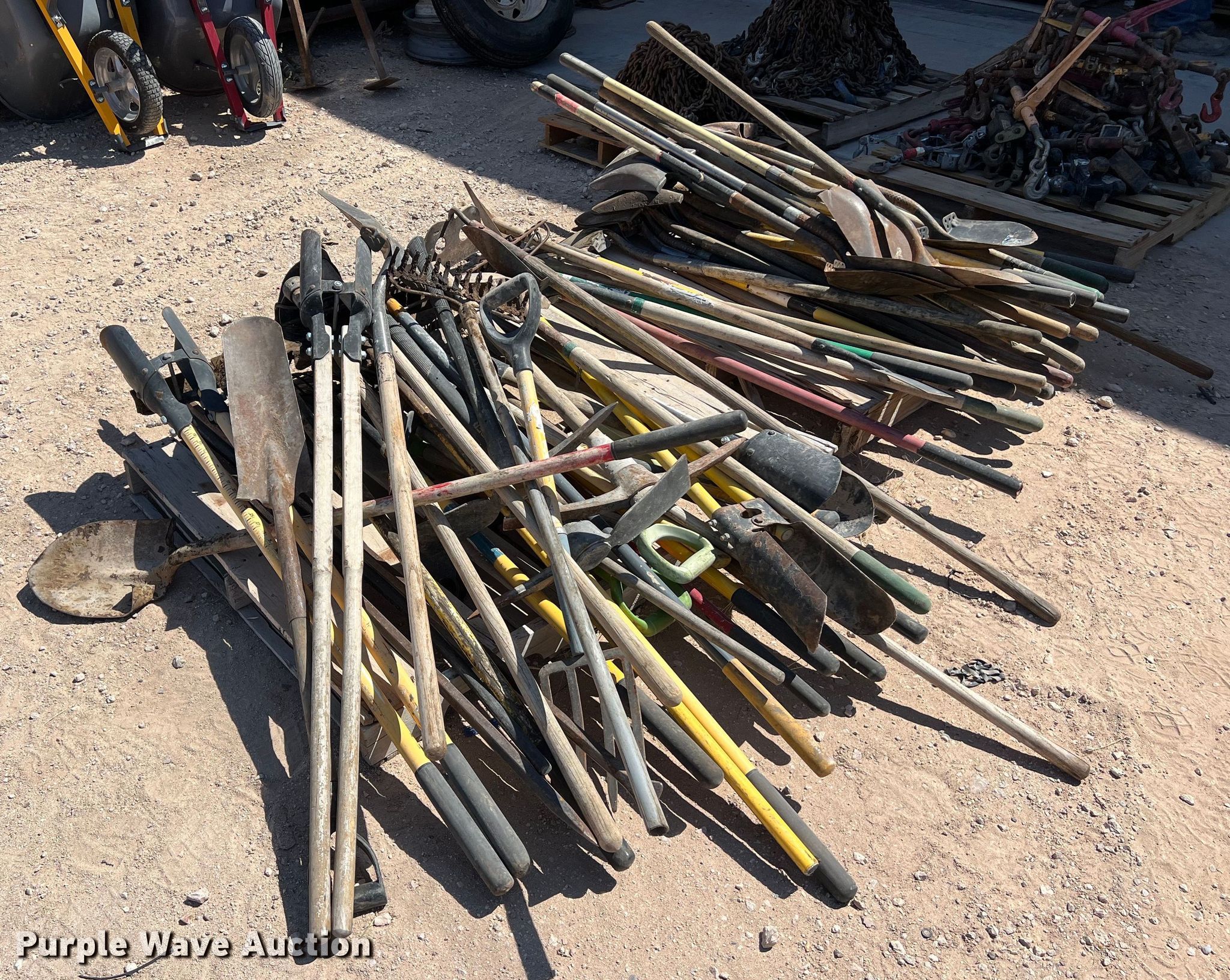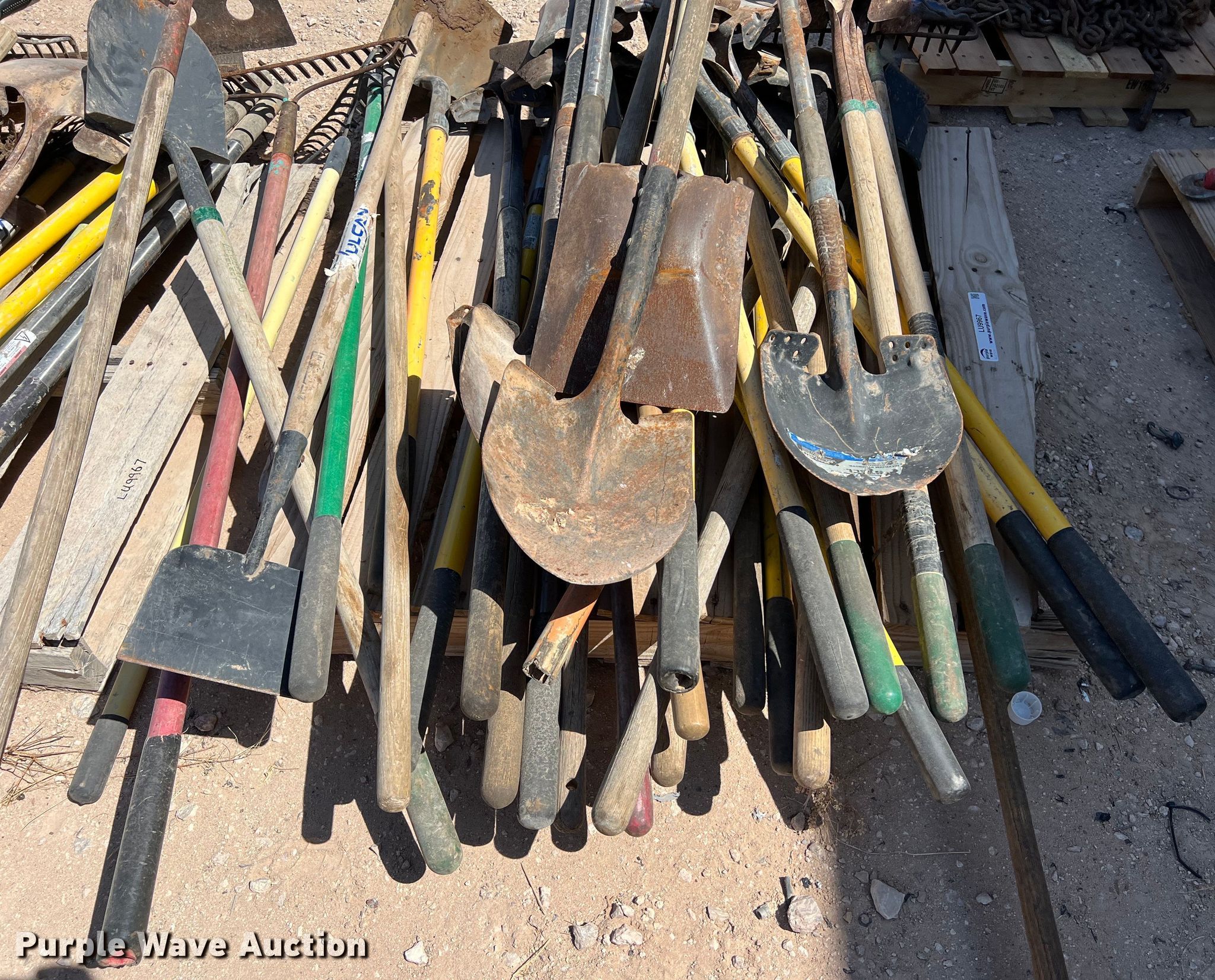 Purple Wave is selling a used Tools in Texas. This item is a (2) pallets of tools with the following: Shovels, Rakes, Post hole diggers and more