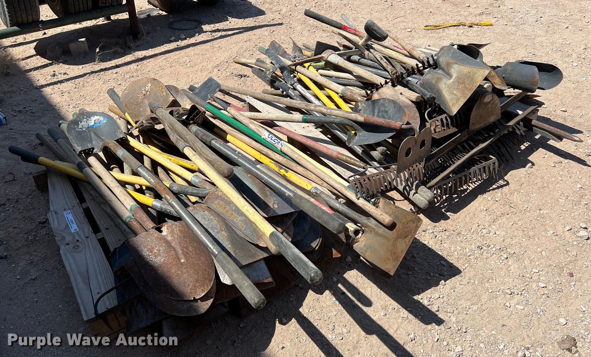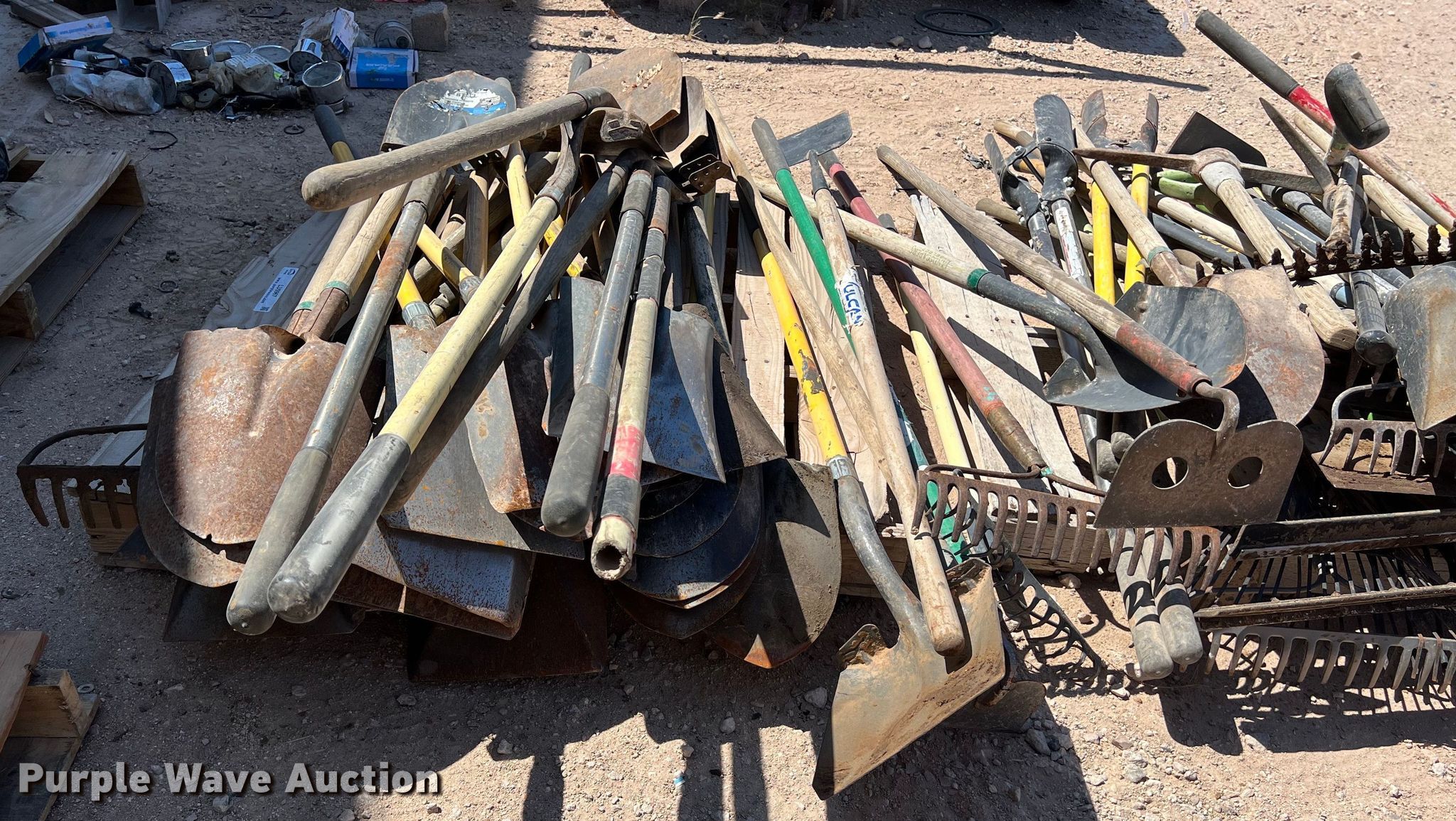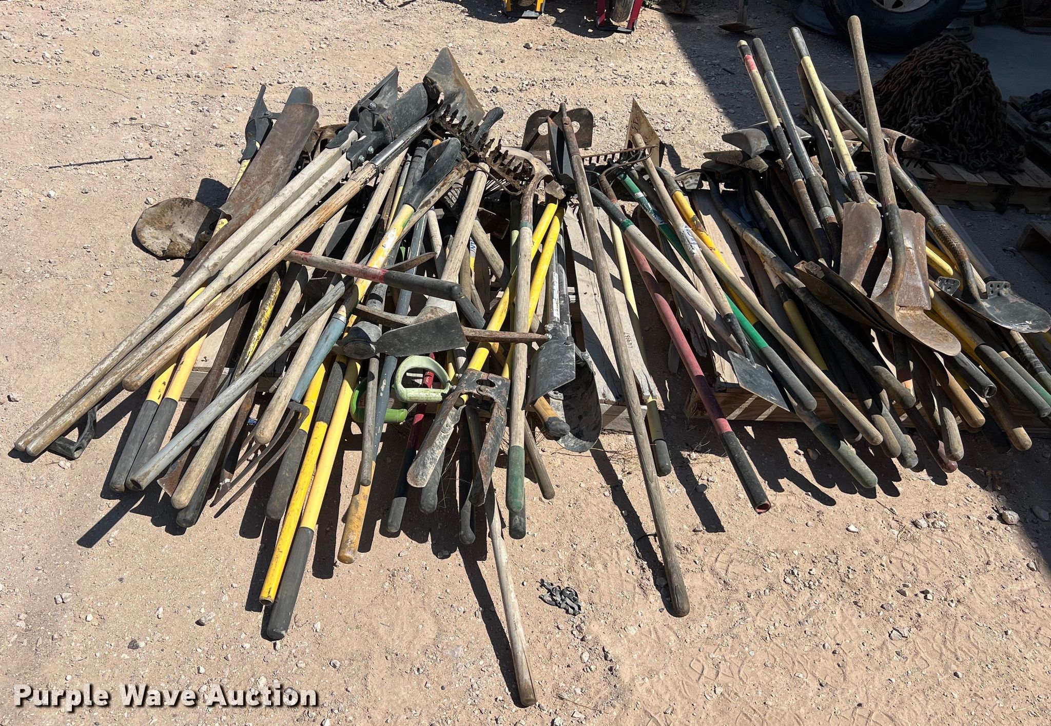 Purple Wave is selling a used Tools in Texas. This item is a (2) pallets of tools with the following: Shovels, Rakes, Post hole diggers and more