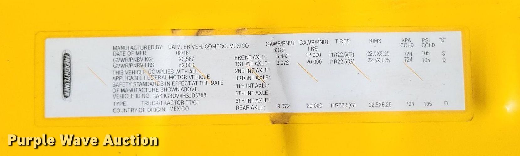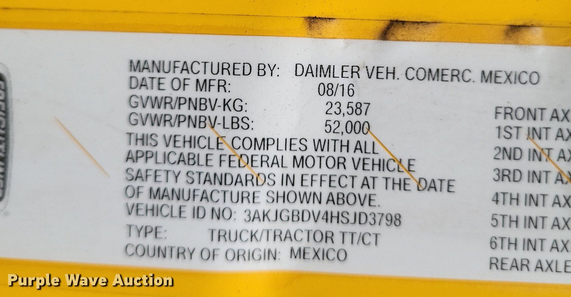 2017 Freightliner Cascadia 113 semi truck. Miles: 442,155 on odometer, Hours: 14,784 on meter, VIN: 3AKJGBDV4HSJD3798. Engine Detroit Diesel DD13, Displacement: 12.8L, Cylinders: 6, Fuel type: Diesel, Engine brake. Transmission Automated manual. Chassis Axles: Tandem, Differential lock: Inter-axle, Suspension: Air Dump valves, Brakes: Air, PTO, GVWR: 52,000 lbs FAWR: 12,000 lbs, IAWR: 20,000 lbs, RAWR: 20,000 lbs. Interior AC, Heat, Heated mirrors, Power windows, Power locks, Cruise control, Air ride cab. Features Deck plate: Aluminum, Fifth wheel type: Air operated, Sliding, Fuel tank: Dual. Tires Size: 11R22.5. Notes Windshield chipped or cracked. Texas title. Seller is a Tennessee licensed motor vehicle dealer. The buyer may be required to pay sales tax and/or registration fees to the dealer prior to taking possession. Title will be assigned and distributed by the dealer. Please contact the seller for distribution questions. Snider Equipment LLC. Jackson, TN 38301