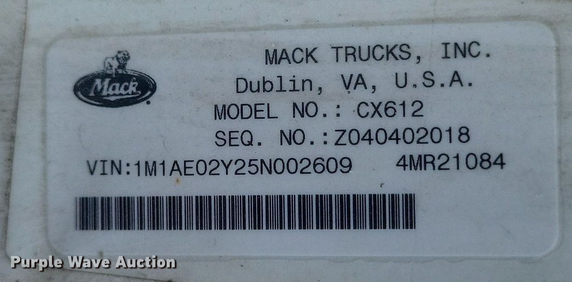 Purple Wave is selling a used Truck Tractor in Mississippi. This item is a 2005 Mack CX612 semi truck with the following: Miles: 653,421 on odometer, Hours: 44,400 on meter, VIN: 1M1AE02Y25N002609, Unit #: 143370