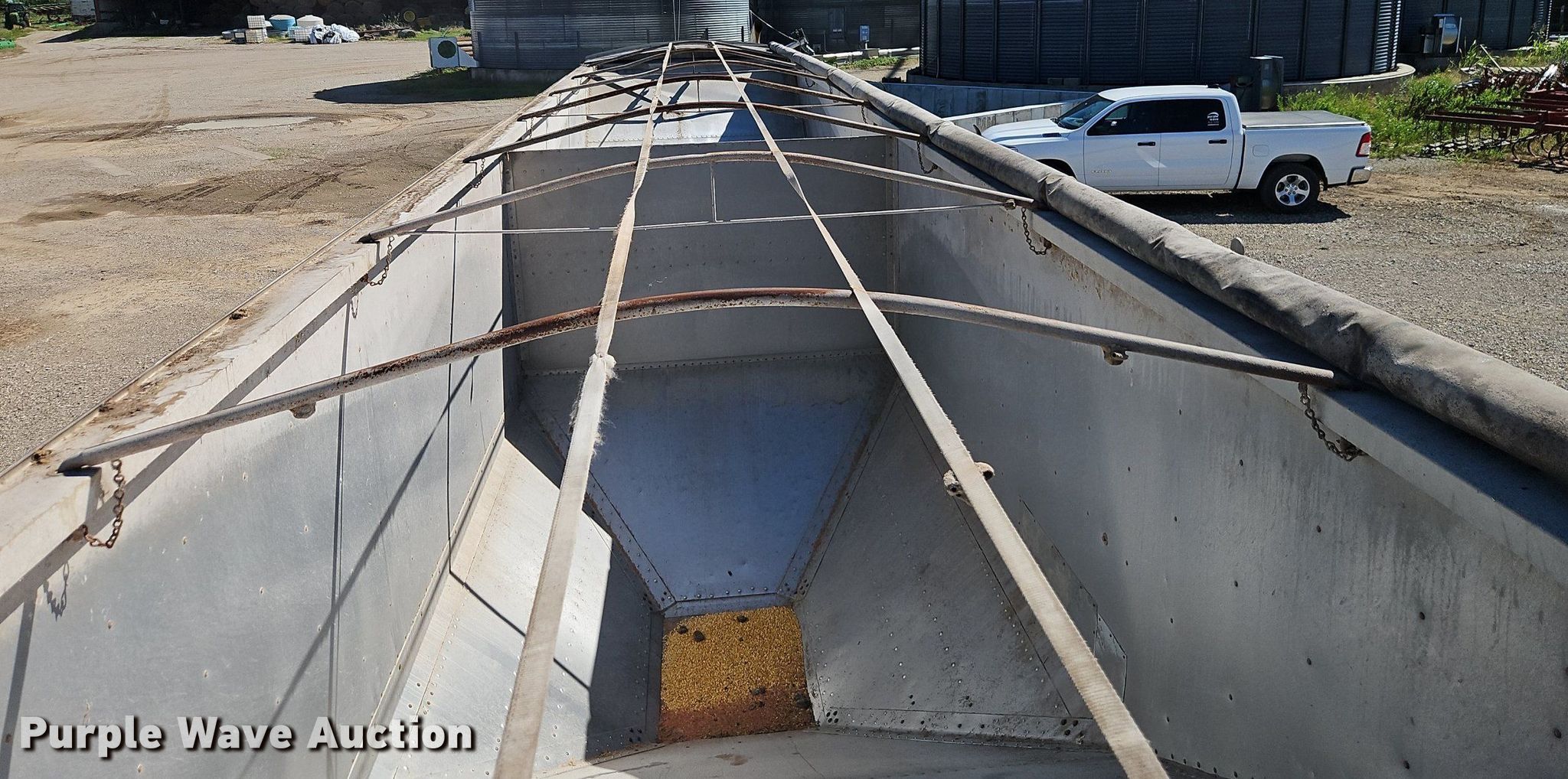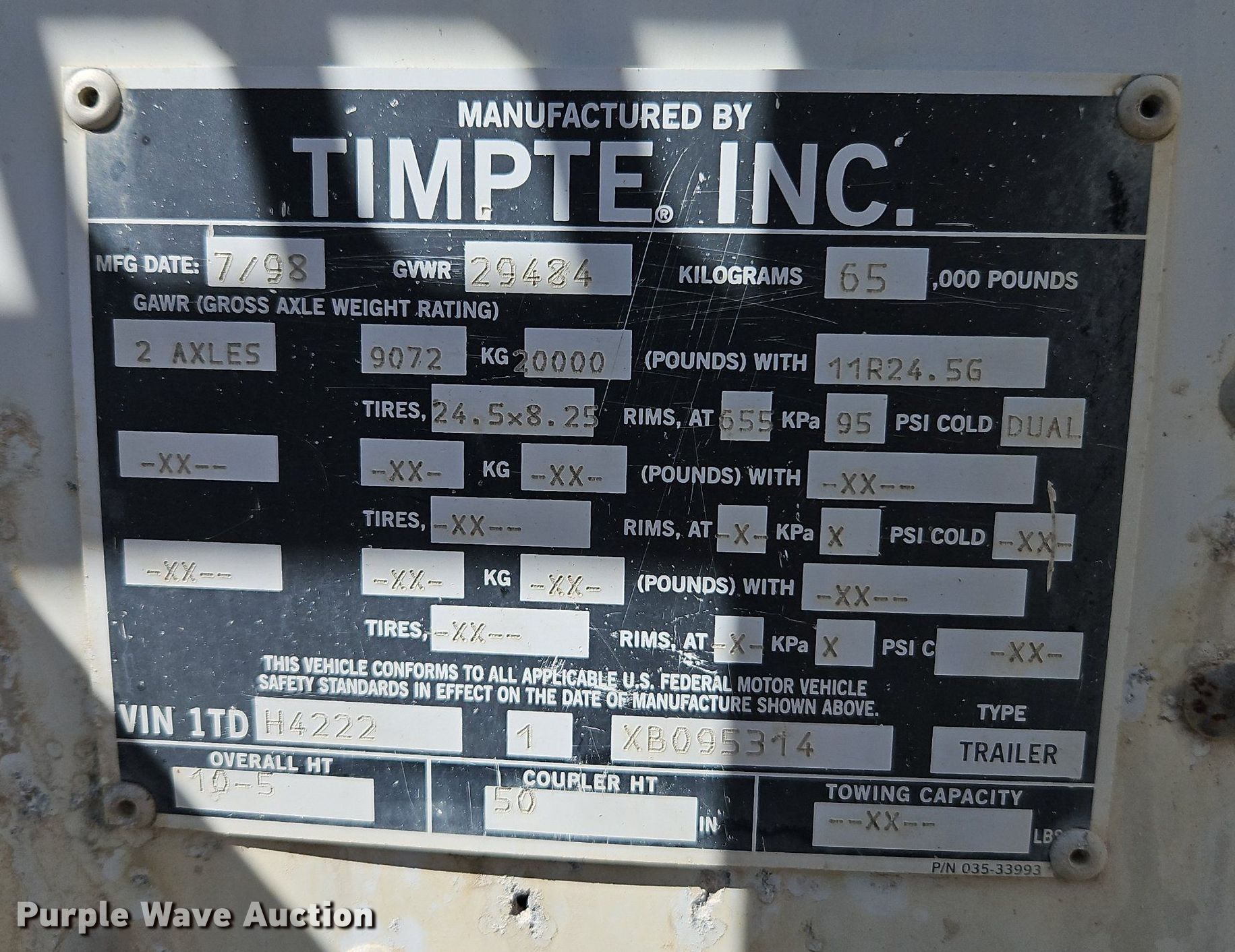 1999 Timpte Super Hopper grain trailer. VIN: 1TDH42221XB095314. Dimensions Overall: 43' L x 96' W, Body: 43' L x 96' W, Side height: 62". Features Body type: Aluminum, Hoppers: Double Trap gates: Manual, Roll tarp. Chassis Landing gear: Dual, Suspension: Air, Brakes: Air, Axles: Tandem, GVWR: 65,000 lbs, GAWR: 20,000 lbs. Tires Aluminum wheels, Size: 11R24.5. Notes Semi truck not included. Kansas title. Segebartt Farms. Hepler, KS 66746
