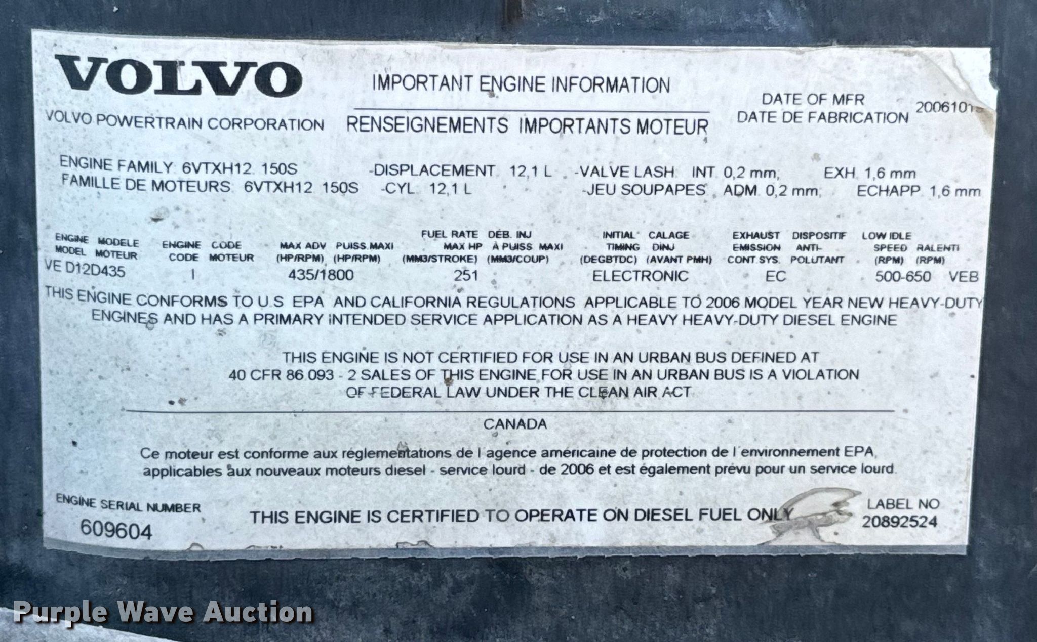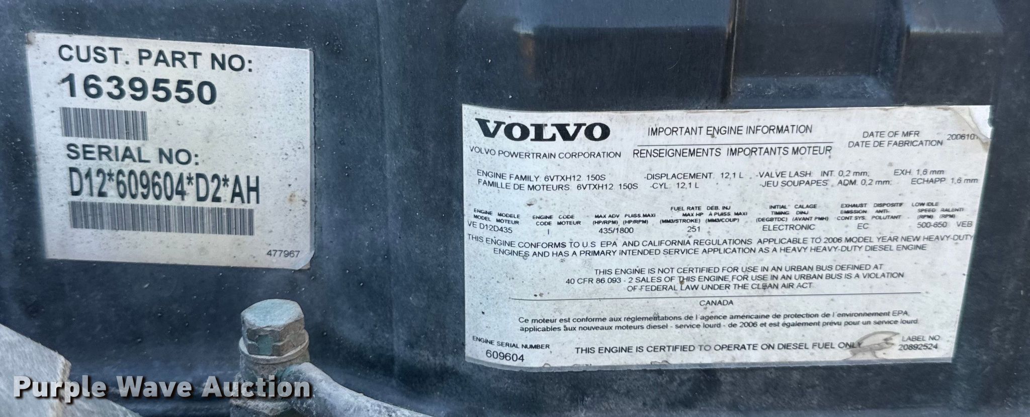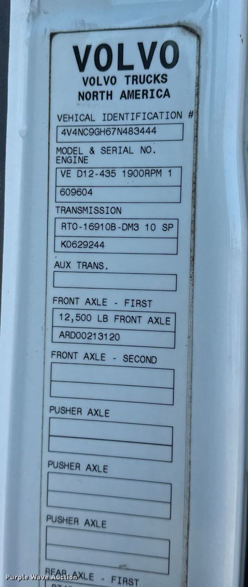 2007 Volvo VN semi truck. Miles: 902,312 on odometer, VIN: 4V4NC9GH67N483444. Engine Volvo VE D12D435, Serial: 609604, Displacement: 12.1L, Cylinders: 6, Fuel type: Diesel, HP: 435. Transmission Eaton Fuller RTO-16910B-DM3, Automatic, Speed: 10. Chassis Axles: Tandem, Differential lock: Inter-axle, Suspension: Air, Brakes: Air, GVWR: 46,350 lbs FAWR: 12,349 lbs, IAWR: 17,000 lbs, RAWR: 17,000 lbs. Interior AC, Heat, Heated mirrors, Power windows, Power locks, Cruise control, Air ride cab. Features Deck plate: Aluminum, Fifth wheel type: Fixed, Fuel tank: Single. Tires Front: 11R22.5, Rear: 285/75R24.5. Notes Dash warning indicator: ABS, AC issues, does not blow cold. Iowa title. Seller is a Missouri licensed motor vehicle dealer. Title will be assigned and distributed by the dealer. Please contact the seller for distribution questions. Title distribution may be delayed up to 14 days from verification of funds. T&R Equipment. New Bloomfield, MO 65080