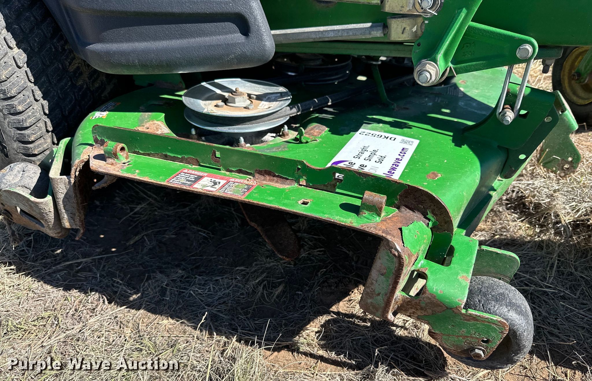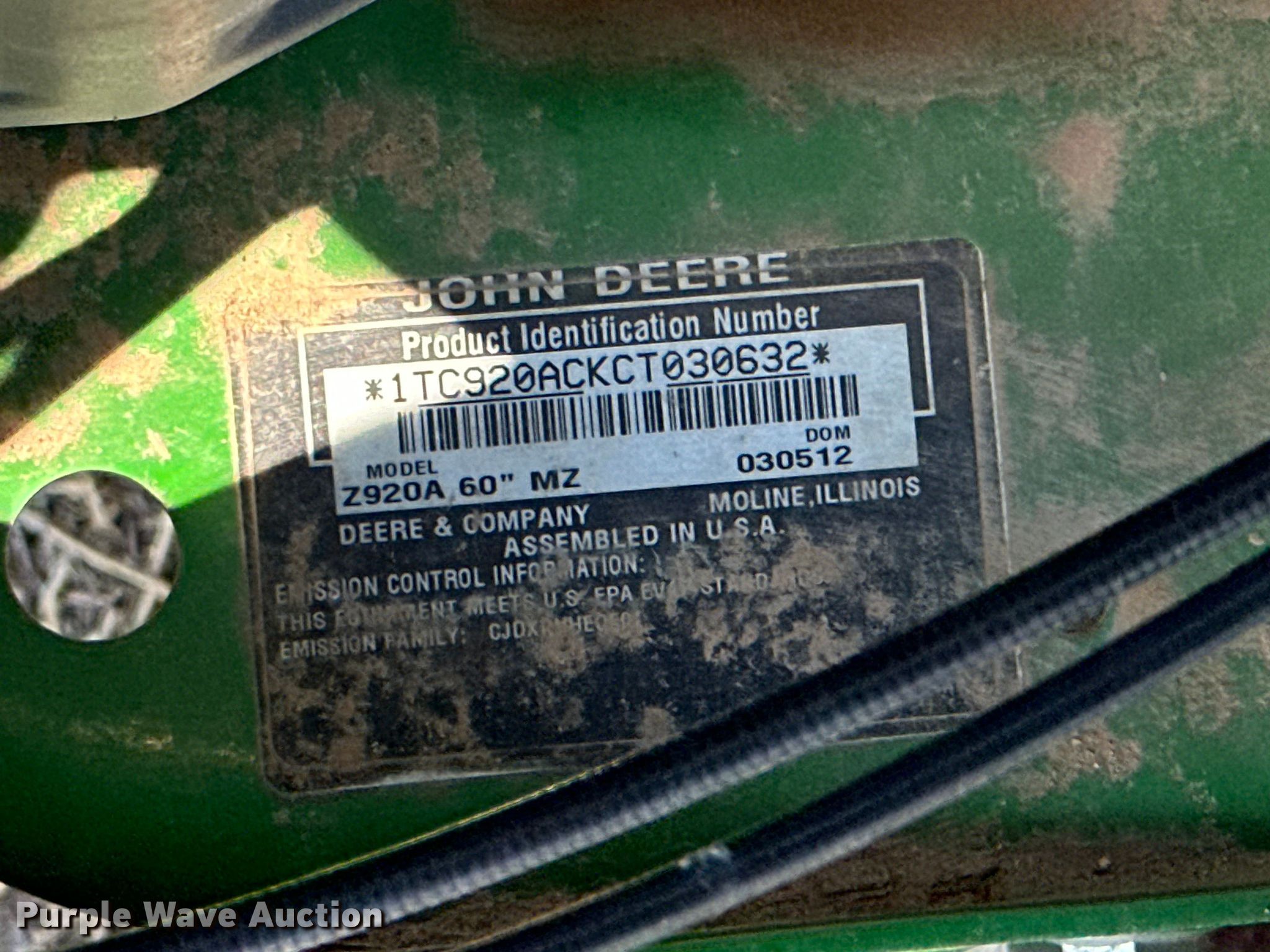 2012 John Deere Z920A ZTR lawn mower. Hours: 1,670 on meter, Cutting width: 60", Serial: 1TC920ACKT030632. Engine Kawasaki, Displacement: 726 cc, Cylinders: 2, Fuel type: Gas. Transmission Hydrostatic. Features Mower deck John Deere 7 Iron. Tires Front: 13x6.5-6/4.5, Rear: 24x12.00-12. Notes PTO issues, does not engage. H&H Enterprises. Amarillo, TX 79124