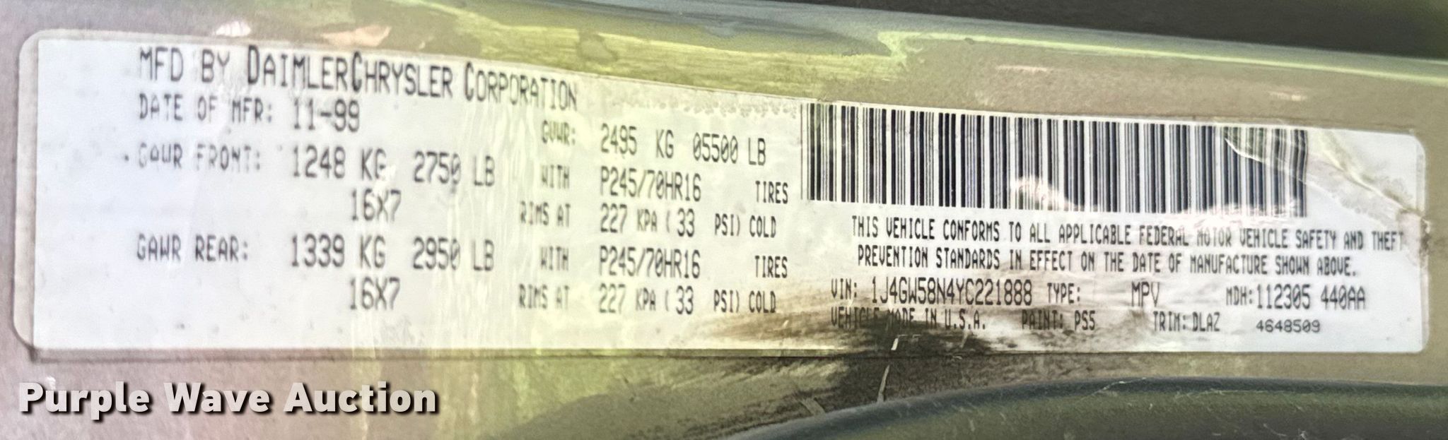 Purple Wave is selling a used Passenger Vehicle in Missouri. This item is a 2000 Jeep Grand Cherokee SUV with the following: Miles: 187,064 on odometer, VIN: 1J4GW58N4YC221888
