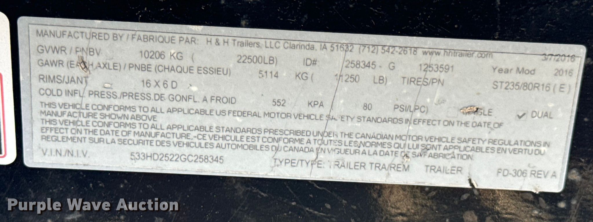 Purple Wave is selling a used Equip. Trailer in Missouri. This item is a 2016 H&H equipment trailer with the following: VIN: 533HD2522GC258345