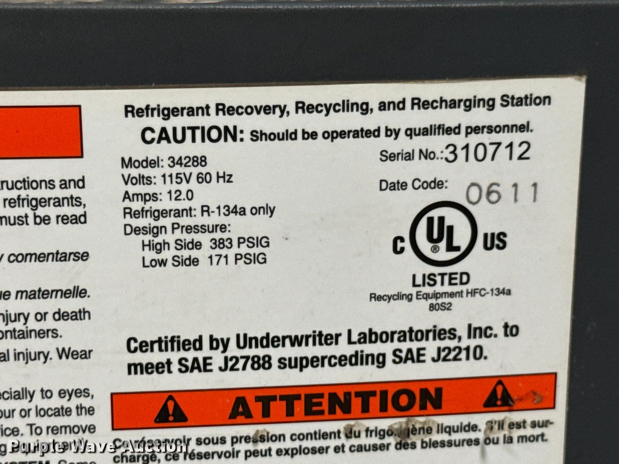 Purple Wave is selling a used Tools in Missouri. This item is a RobinAir Cooltech 34288 AC recovery machine with the following: Serial: 310712, Volts: 115, Single phase, PSIG: 383