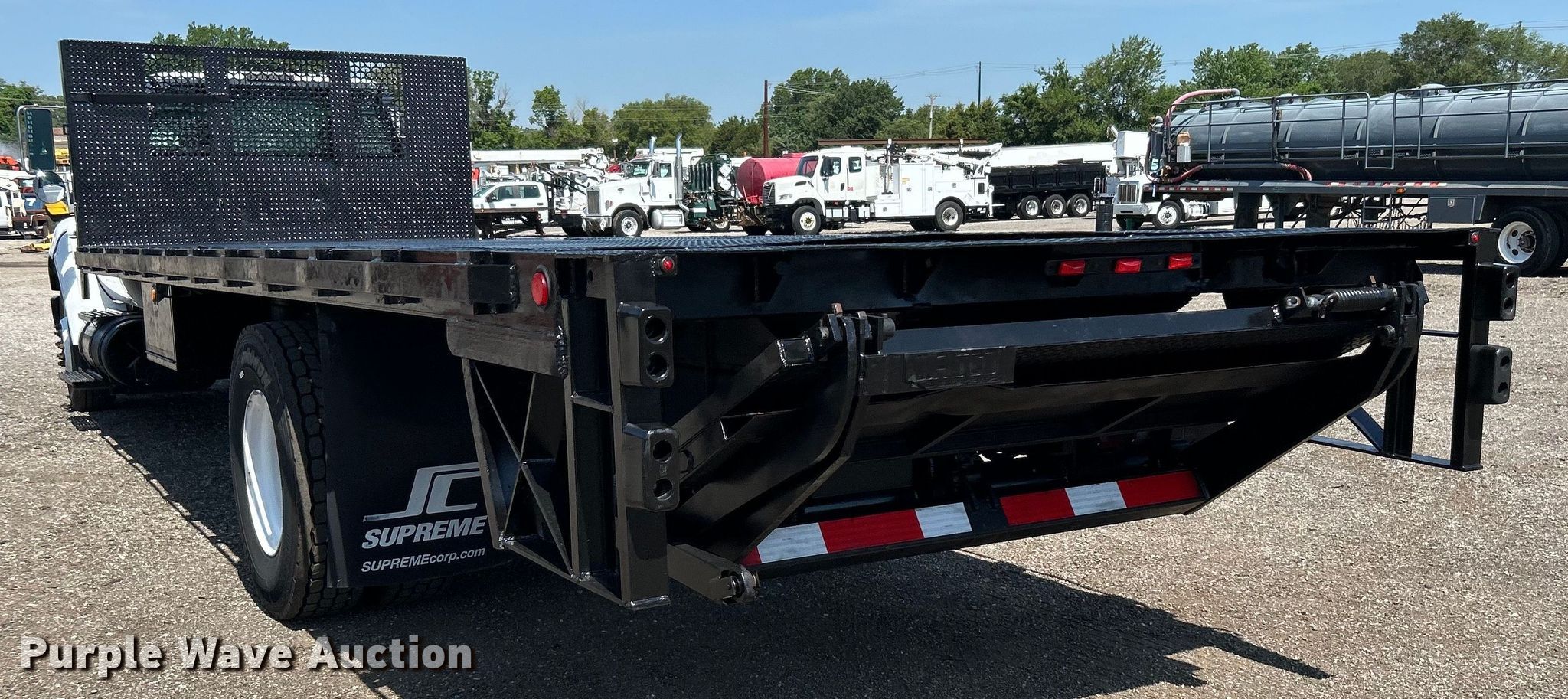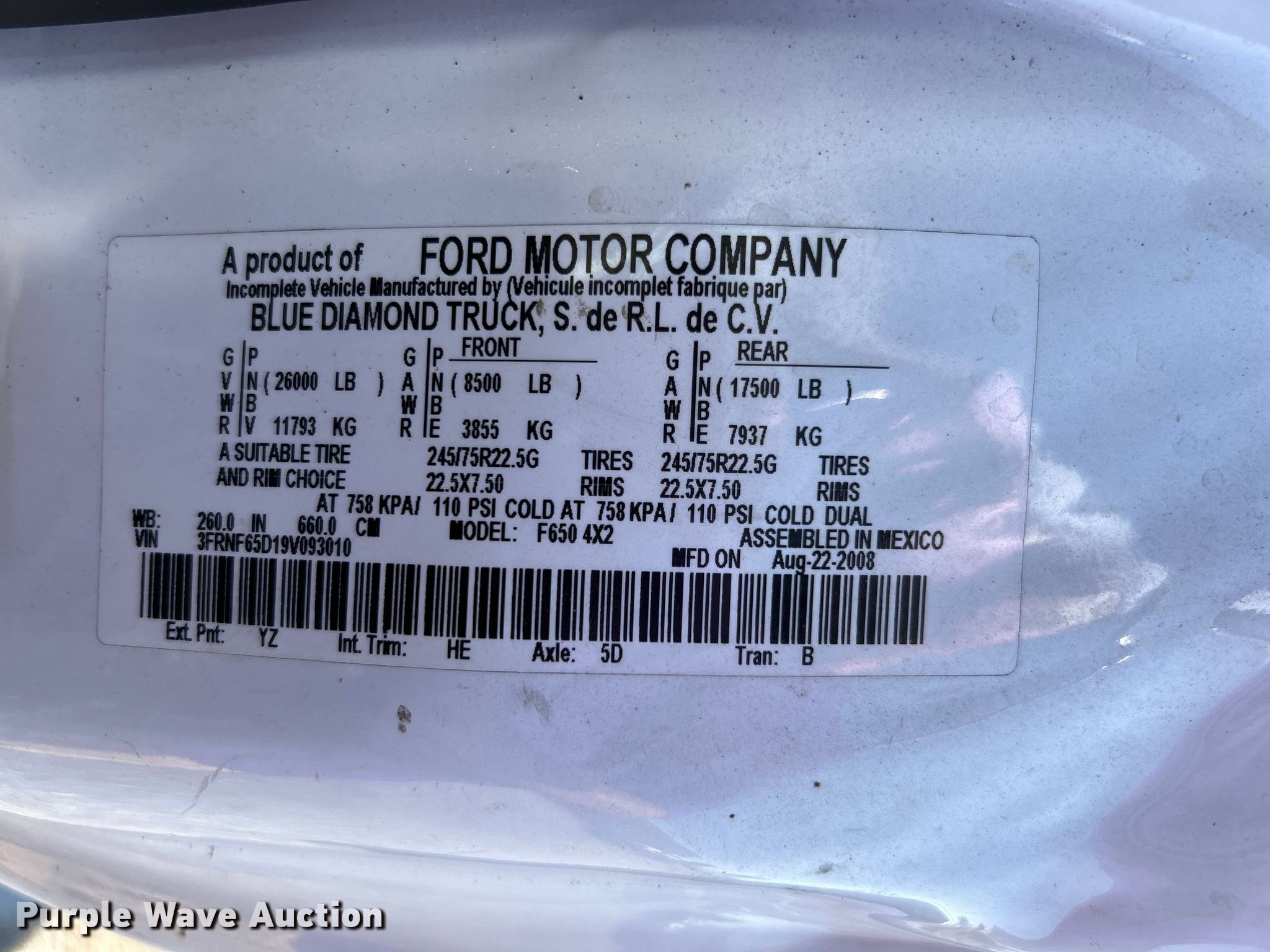 2009 Ford F650 Super Duty flatbed truck. Miles: 235,282 on odometer, VIN: 3FRNF65D19V093010. Engine Cummins ISB240, Serial: 57846270, Displacement: 6.7L, Cylinders: 6, Fuel type: Diesel, HP: 250. Transmission Automatic. Chassis Axles: Single, Suspension: Spring, Brakes: Hydraulic, GVWR: 26,000 lbs, Wheelbase: 260". Interior AC, Heat, Cruise control. Features Flatbed Supreme Corp, 24' 8" L x 98" W, End gate lift Waltco. Tires Size: 11R22.5. Notes Windshield chipped or cracked. Oklahoma title. 15107 North 137th East Avenue. Collinsville, OK 74021