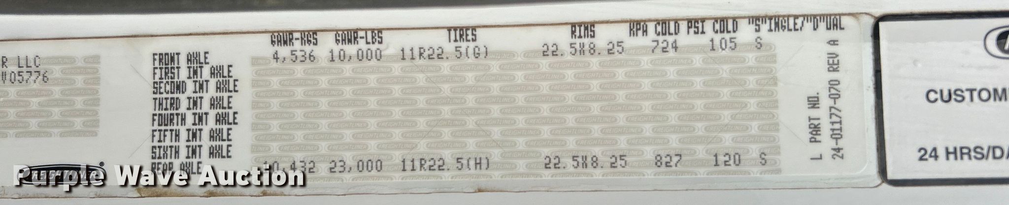 2005 Freightliner Business Class M2 flatbed truck. Miles: 174,963 on odometer, Hours: 6,135 on meter, VIN: 1FVACXDC15HV05776. Engine Caterpillar C7, Serial: KAL85317, Displacement: 7.2L, Cylinders: 6, Fuel type: Diesel, HP: 275, kW: 205. Transmission Eaton Fuller 8LL, Manual, Speed: 10. Chassis Axles: Single, Suspension: Air, Brakes: Air, GVWR: 33,000 lbs. Interior AC, Heat, Heated mirrors, Cruise control. Features Flatbed 12' 5" L x 90" W, Removable sides. Tires Size: 11R22.5. Oklahoma title. 15107 North 137th East Avenue. Collinsville, OK 74021