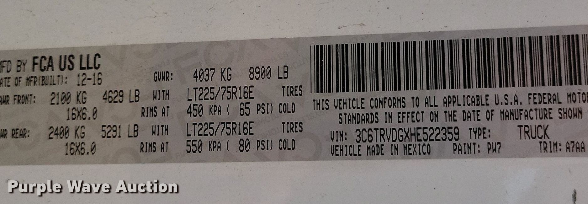 - VIN: 3C6TRVDGXHE522359