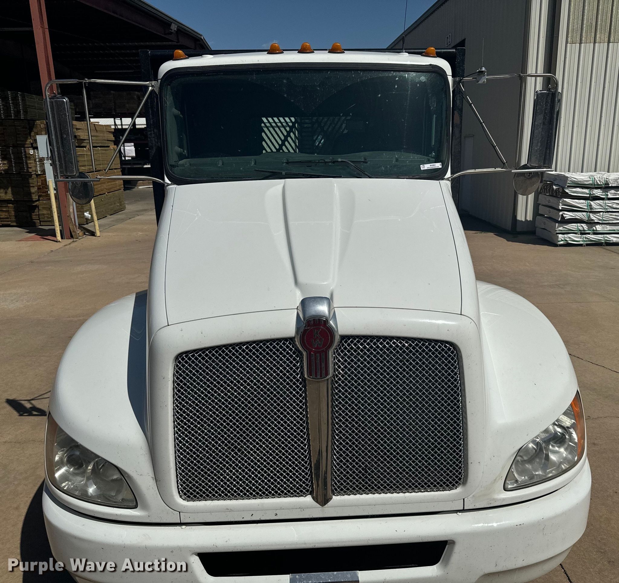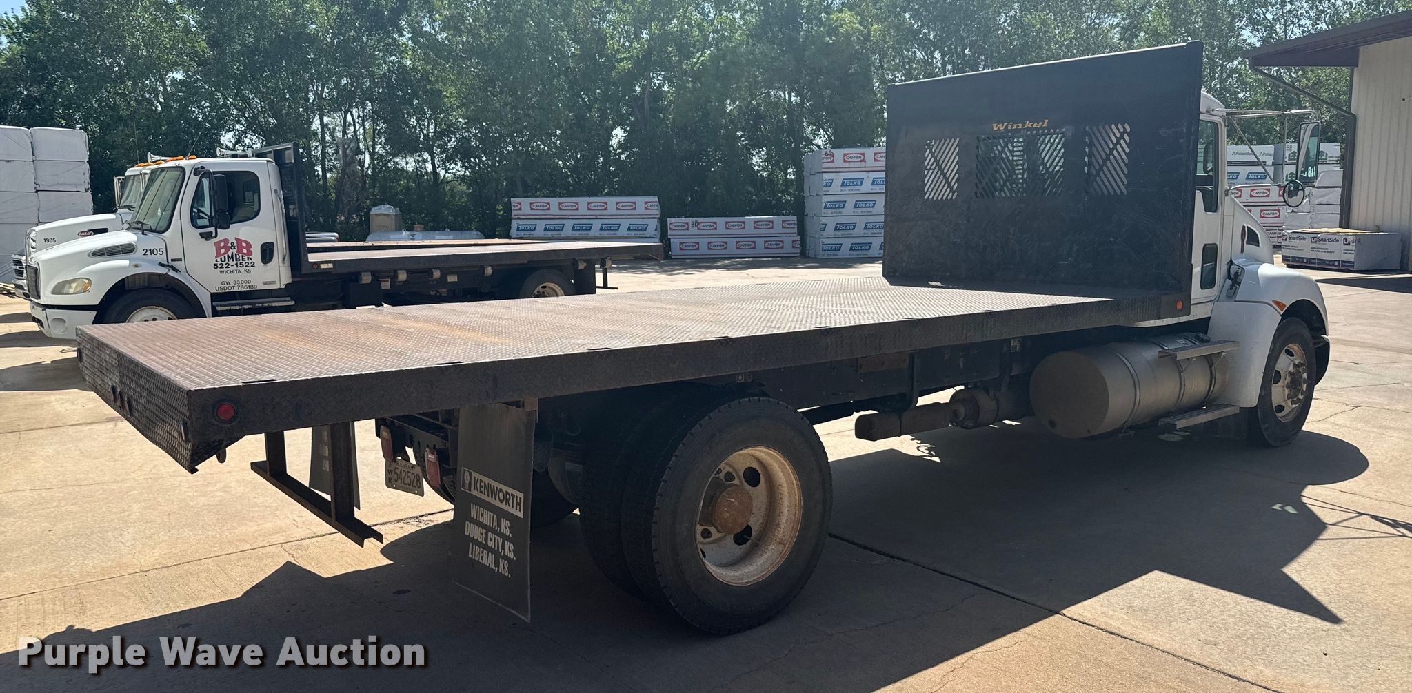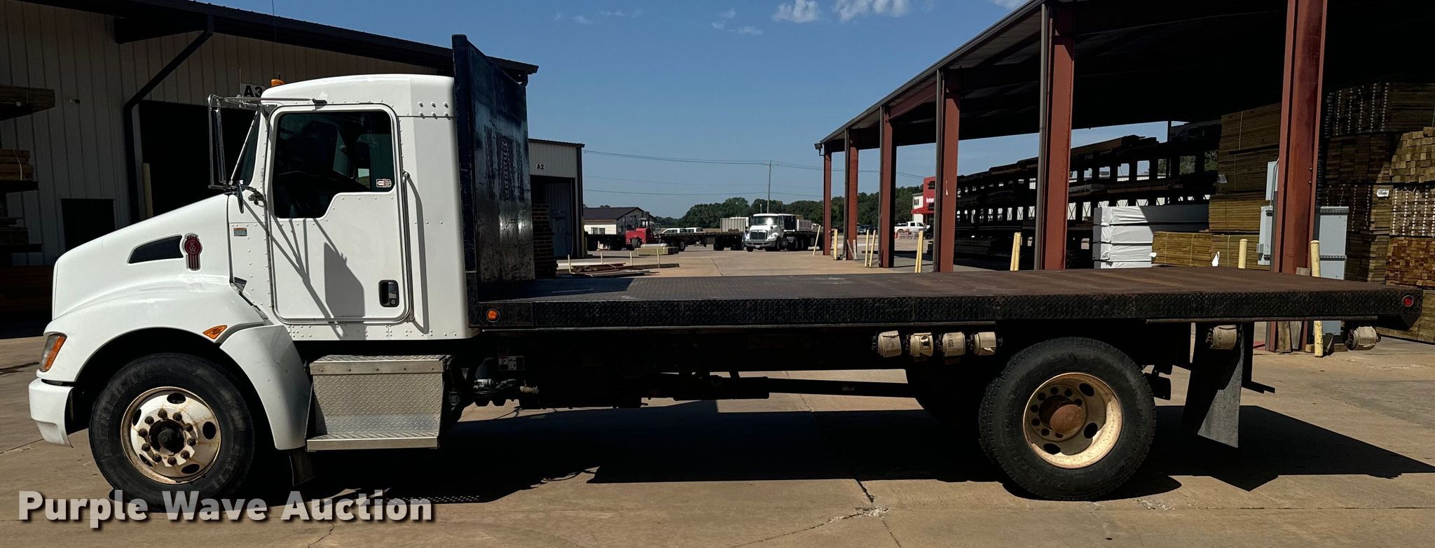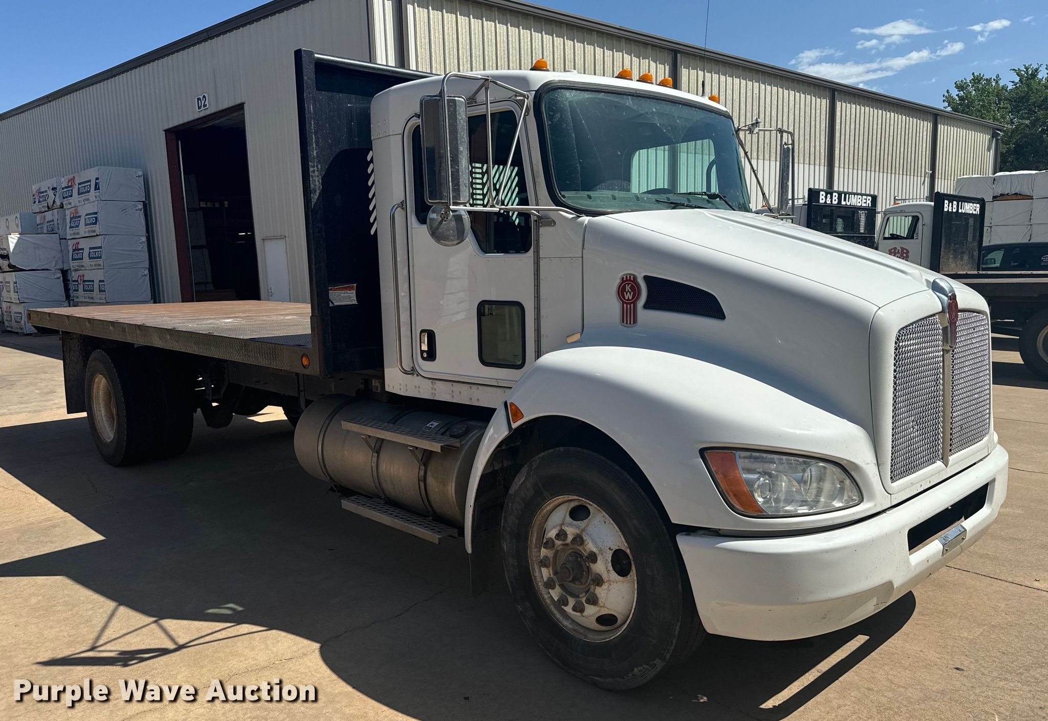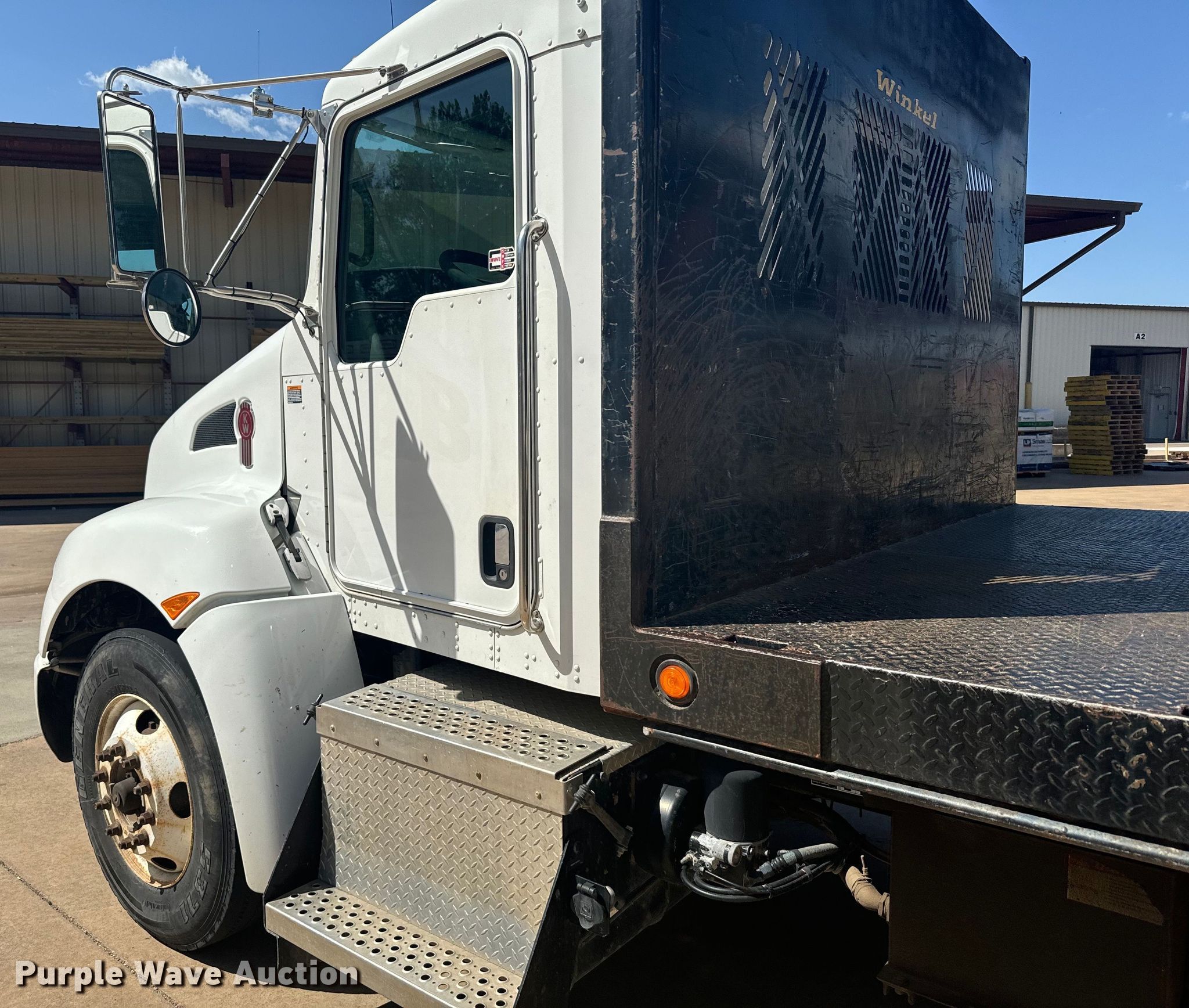 2009 Kenworth T370 flatbed truck. Miles: 117,185 on odometer, Hours: 4,727 on meter, VIN: 2NKHHM7X39M255391. Engine Paccar PX-6, Serial: 57849265, Displacement: 6.7L, Cylinders: 6, Fuel type: Diesel, HP: 260, Engine brake. Transmission Eaton Fuller, Manual, Speed: 6. Chassis Differential lock, Axles: Single, Suspension: Spring, Brakes: Air, PTO, GVWR: 33,000 lbs. Interior AC, Heat, Power locks, Power passenger window, Cruise control. Features Dump flatbed Winkel, 18' 9" L x 96" W, Ram: Single. Tires Size: 295/75R22.5. Kansas title. B & B Lumber Co. Wichita, KS 67215
