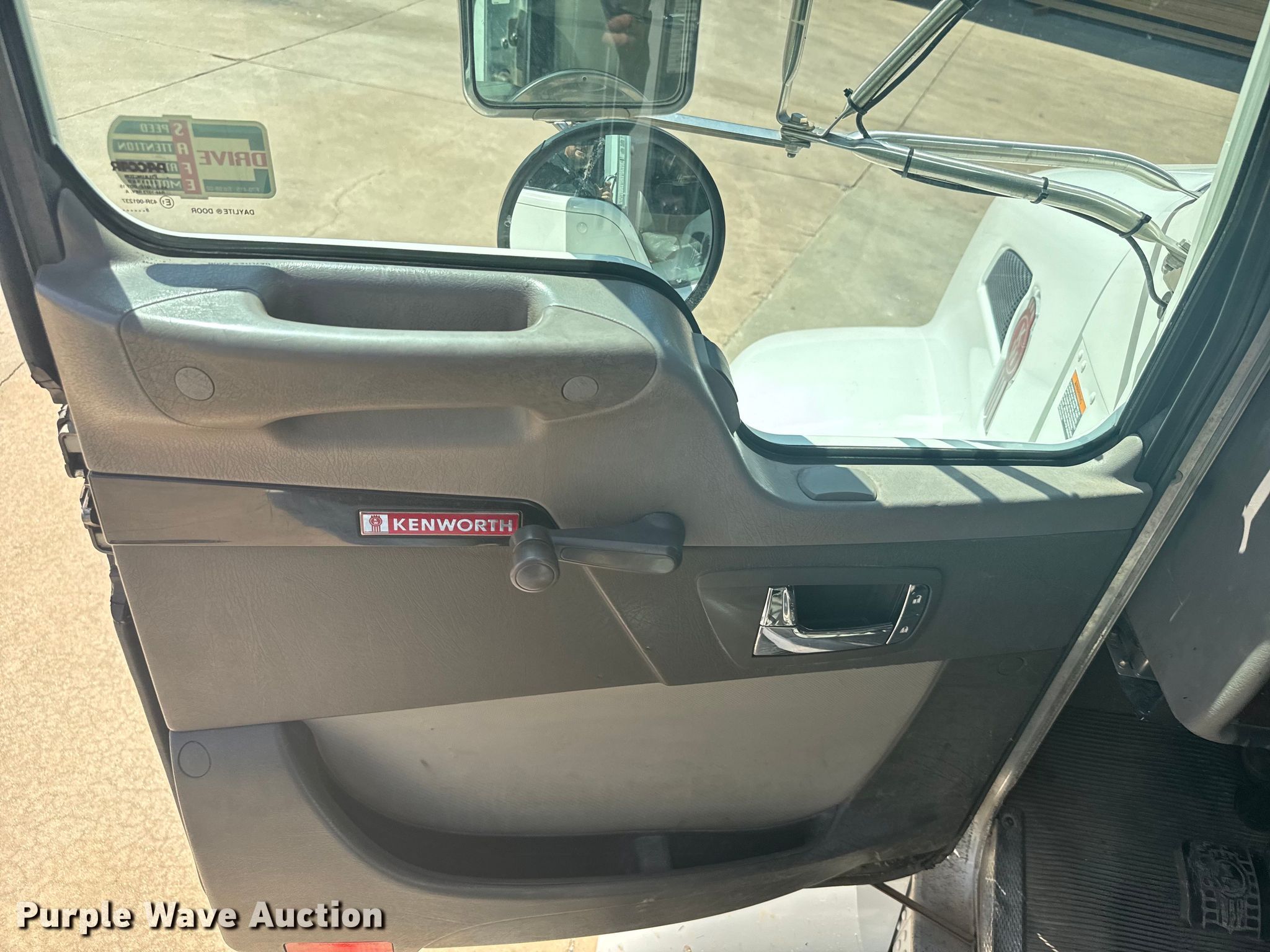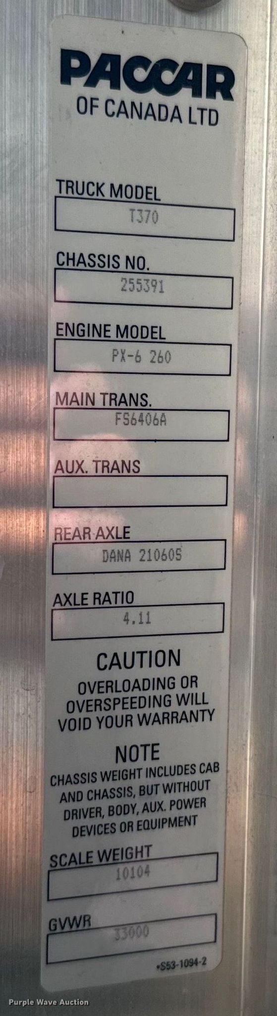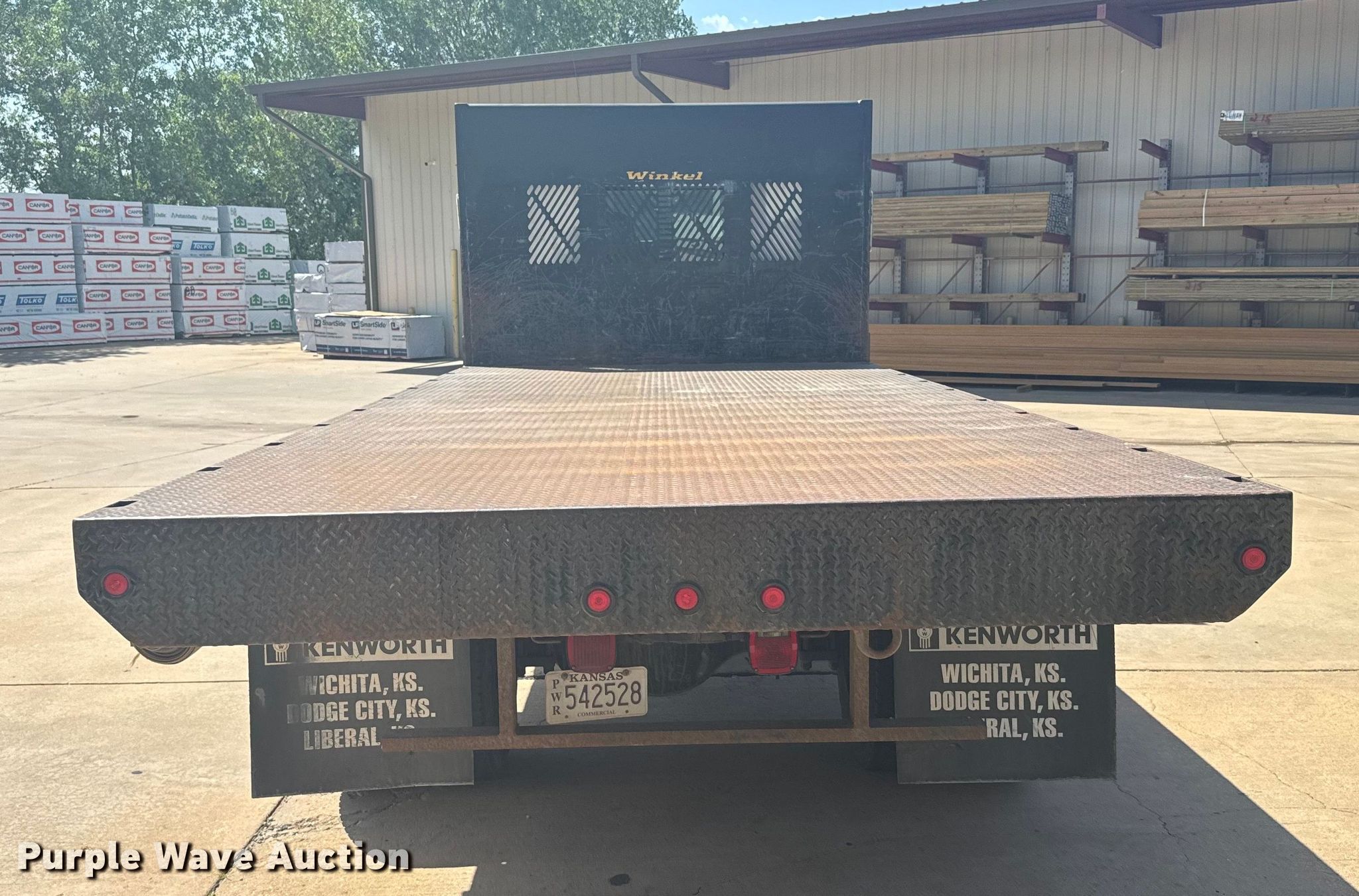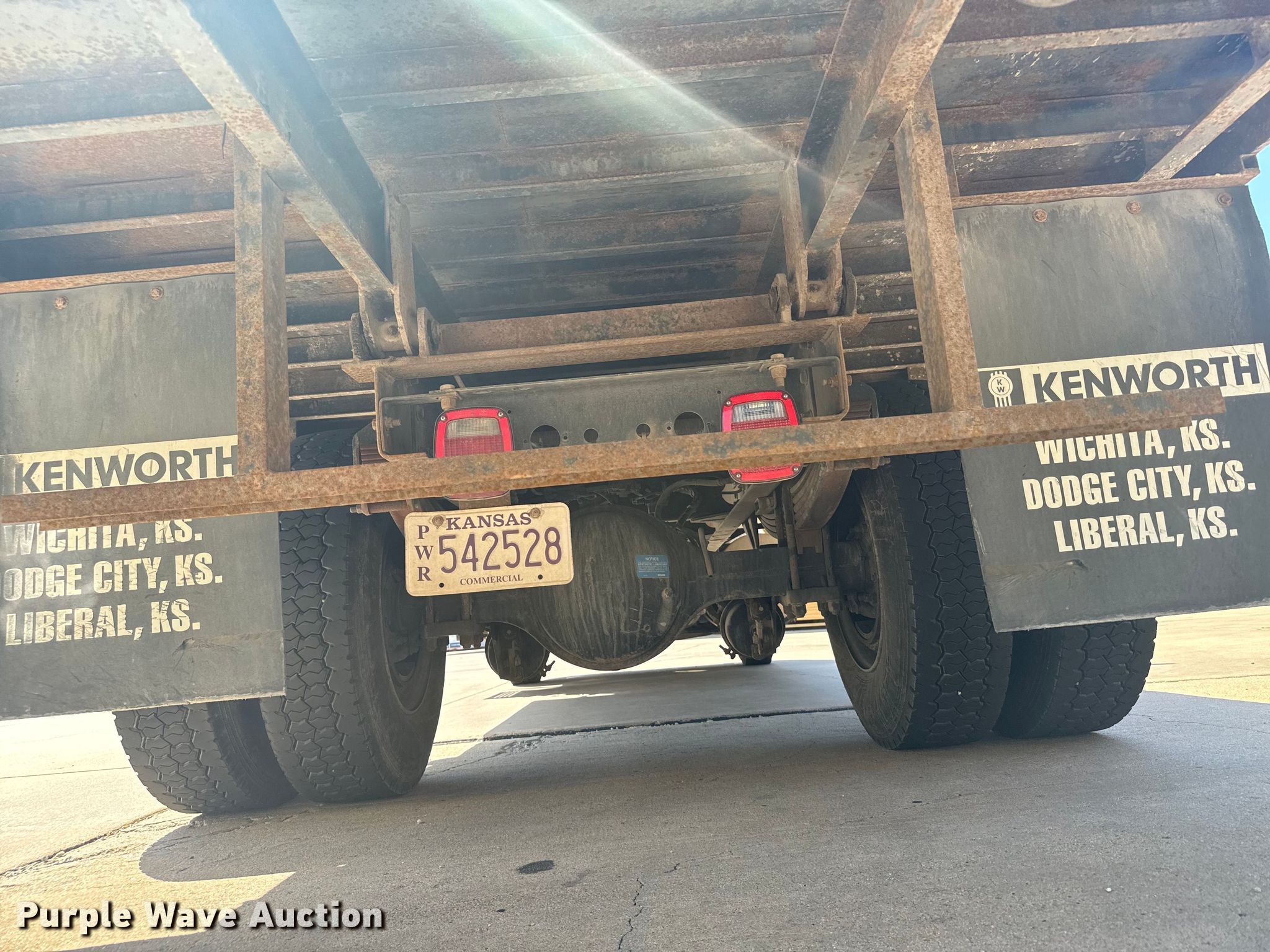 2009 Kenworth T370 flatbed truck. Miles: 117,185 on odometer, Hours: 4,727 on meter, VIN: 2NKHHM7X39M255391. Engine Paccar PX-6, Serial: 57849265, Displacement: 6.7L, Cylinders: 6, Fuel type: Diesel, HP: 260, Engine brake. Transmission Eaton Fuller, Manual, Speed: 6. Chassis Differential lock, Axles: Single, Suspension: Spring, Brakes: Air, PTO, GVWR: 33,000 lbs. Interior AC, Heat, Power locks, Power passenger window, Cruise control. Features Dump flatbed Winkel, 18' 9" L x 96" W, Ram: Single. Tires Size: 295/75R22.5. Kansas title. B & B Lumber Co. Wichita, KS 67215