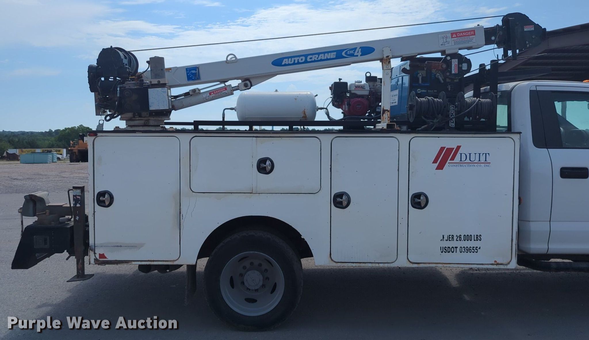 2018 Ford F550 Super Duty utility / service truck. Miles: 151,969 on odometer, VIN: 1FDUF5GTXJDA04186, Unit #: 771.310 901.017. Engine Displacement: 6.7L, Cylinders: 8, Fuel type: Diesel. Transmission Automatic. Chassis Axles: Single, Suspension: Spring, Brakes: Hydraulic, GVWR: 19,500 lbs, Wheelbase: 169". Interior AC, Heat, Cruise control, Auxiliary controls, Brake controller. Features Bed Auto Crane, 11' L x 96" W, Torch bottle rack, Welder/generator Miller Bobcat 250, Hours: 123 on meter, Fuel type: Gas, 240V outlets: 1, 120V outlets: 4, Watts: 11,000, Welder type: Leads, Tig, CC, CV, Wire, Mig, Stick (AC/DC), Air compressor VMAC G30, Honda GX390, Crane Auto Crane EHC-4, Maximum boom length: 20.5' Maximum lift capacity: 4,000 lbs.. Tires Size: 225/70R19.5. Oklahoma title. Title distribution may be delayed up to 14 days from verification of funds. Duit Holdings, Inc.. 7183 E Waterloo Industrial Road. Edmond, OK 73034