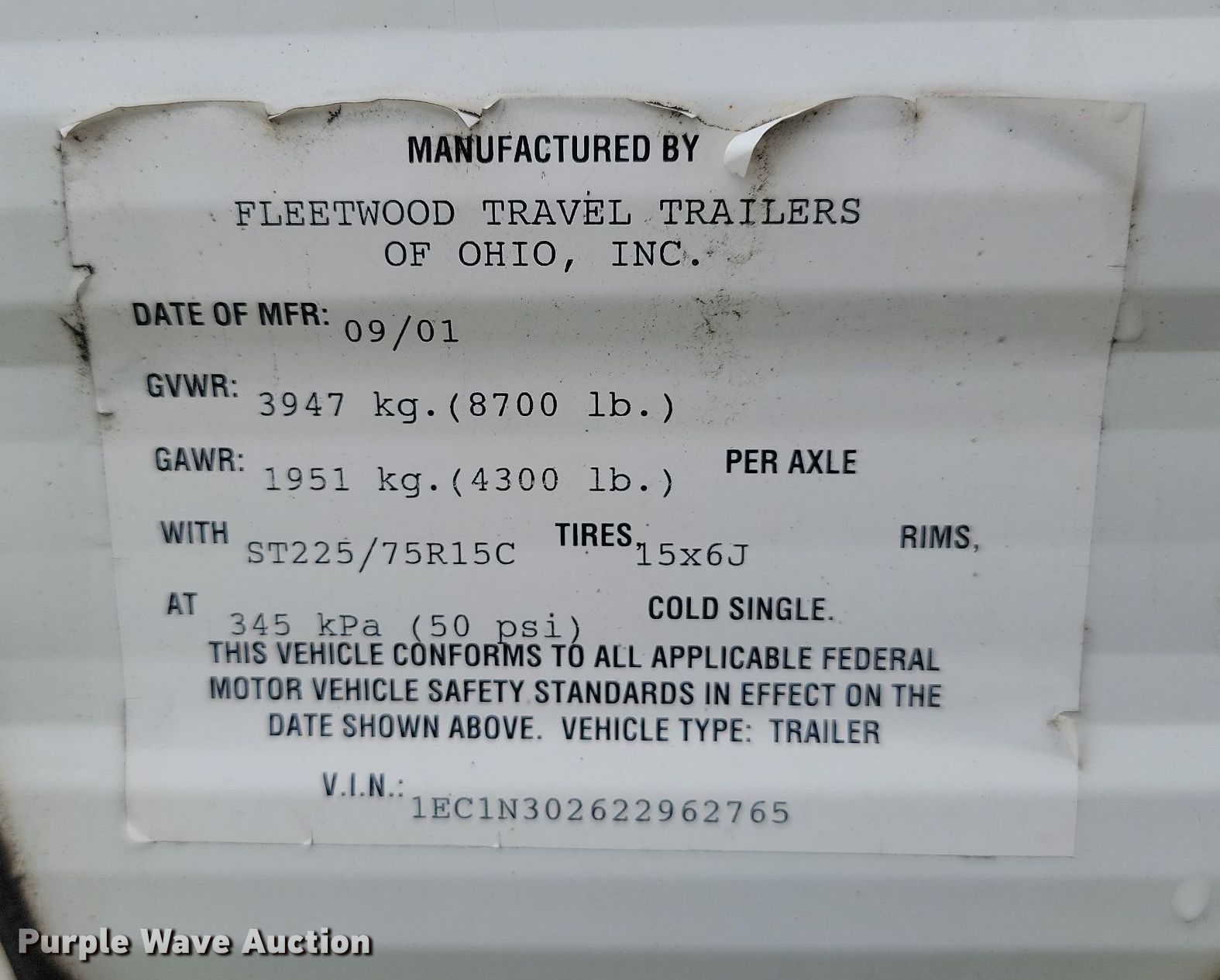 2002 Fleetwood Prowler 30N camper. VIN: 1EC1N302622962765. Chassis Axles: Tandem, Suspension: Spring, Brakes: Electric, GVWR: 8,700 lbs, GAWR: 4,300 lbs. Interior Kitchen: Sink, Refrigerator, Microwave, Oven, Stove: Propane, Bathroom, Bed type: Queen, Heater, AC units: 1. Features Slide outs: 1, Awnings: 1 Awning type: Manual, Ball hitch: 2 5/16". Tires Size: ST225/75R15. Notes Non-operational slide out. South Dakota title. Seller is a South Dakota licensed motor vehicle dealer. The buyer may be required to pay sales tax and/or registration fees to the dealer prior to taking possession. Title will be assigned and distributed by the dealer. Please contact the seller for distribution questions. Pleasureland RV. Sioux Falls, SD 57107