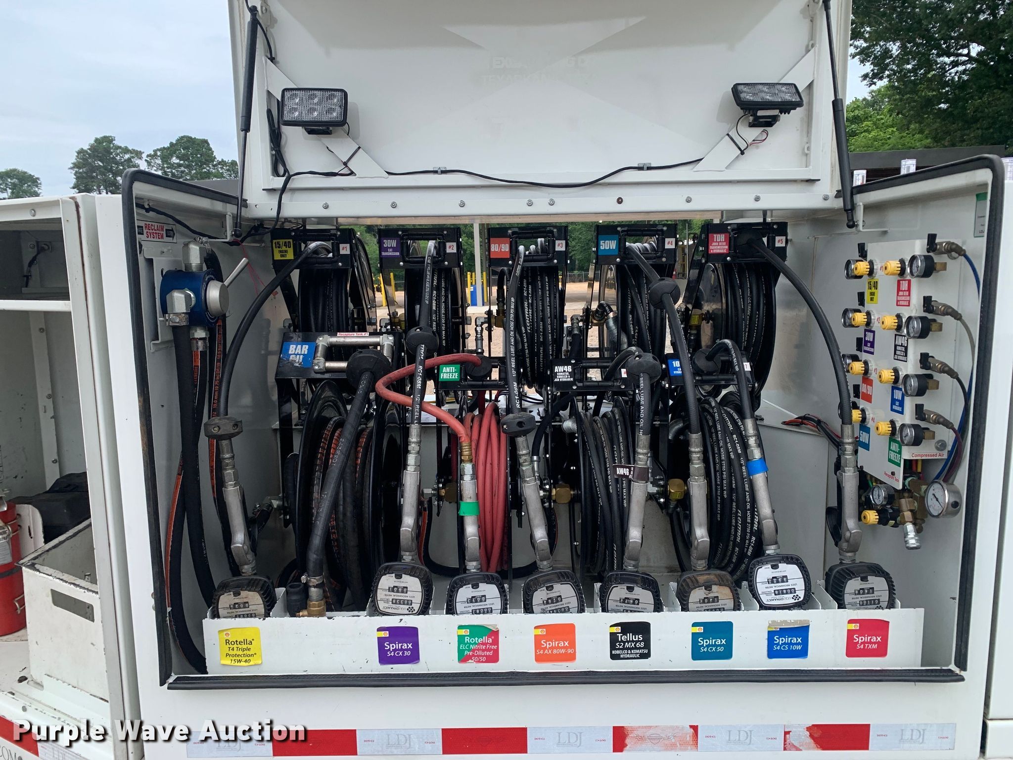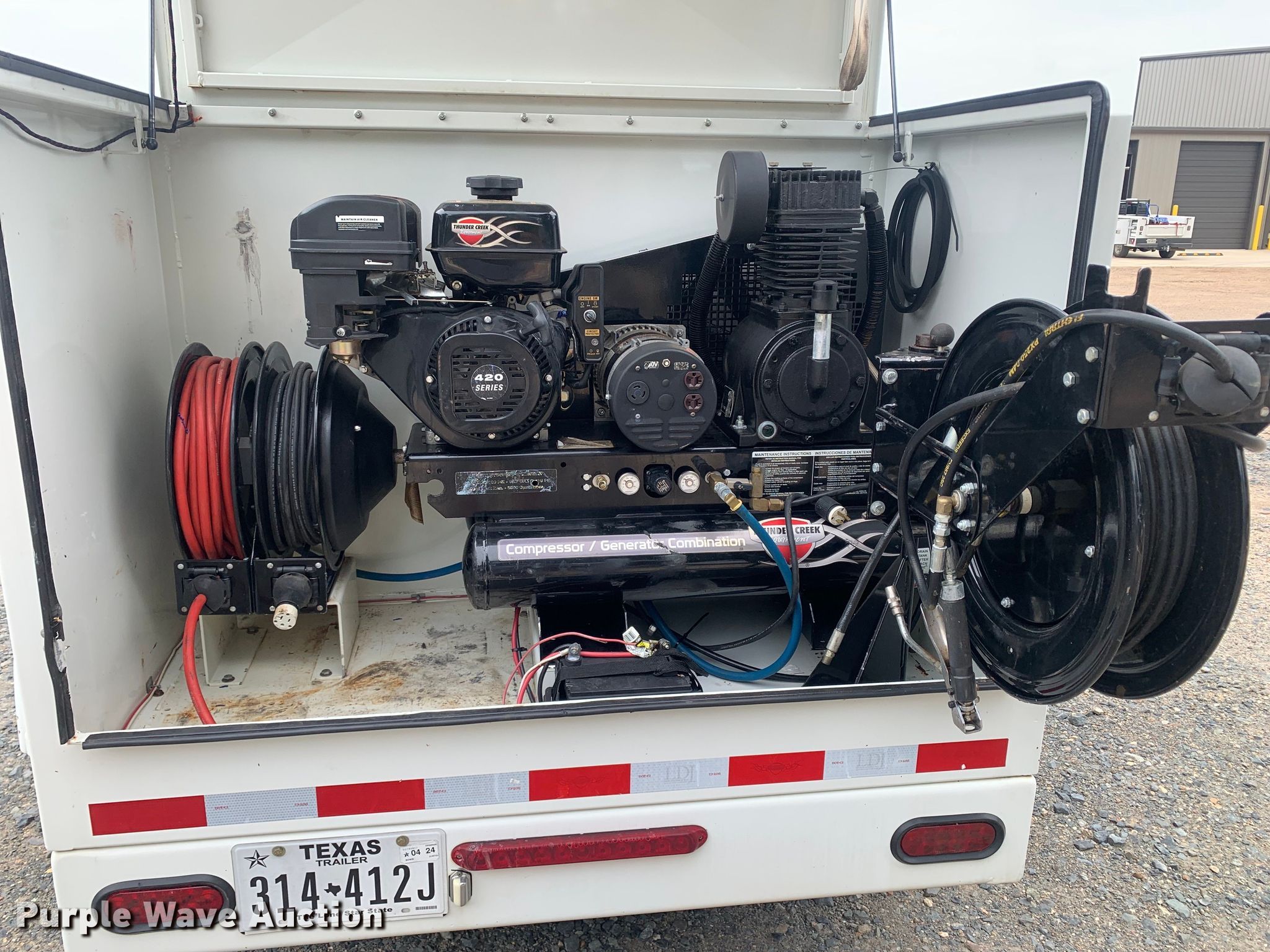 2015 Thunder Creek SLT715 Custom lube trailer. VIN: 56ZL1UP30FP000528, Unit #: 428. Dimensions Overall: 23' L x 6' 4" W. Features Deck type: Steel, (8) tanks, Hose reels, Recapture tank Capacity: 200 gallons, Reel, Air compressor / Generator Engine Thunder Creek Equipment Displacement: 420 cc, Fuel type: Gas, Electric start, (2) air hose reels, CFM: 16.3, PSI: 100, CFM: 15.7, PSI: 175, Generator Electrical cord reel, Maximum watts: 4,000.. Chassis Ball hitch: 2 5/16", Landing gear: Single, Suspension: Spring, Brakes: Electric, Axles: Triple, GVWR: 18,000 lbs, GAWR: 6,000 lbs. Tires Aluminum wheels, Size: 7.50R16LT. Texas title. Title distribution may be delayed up to 14 days from verification of funds. Tatum Excavating Company. Texarkana, TX 75501