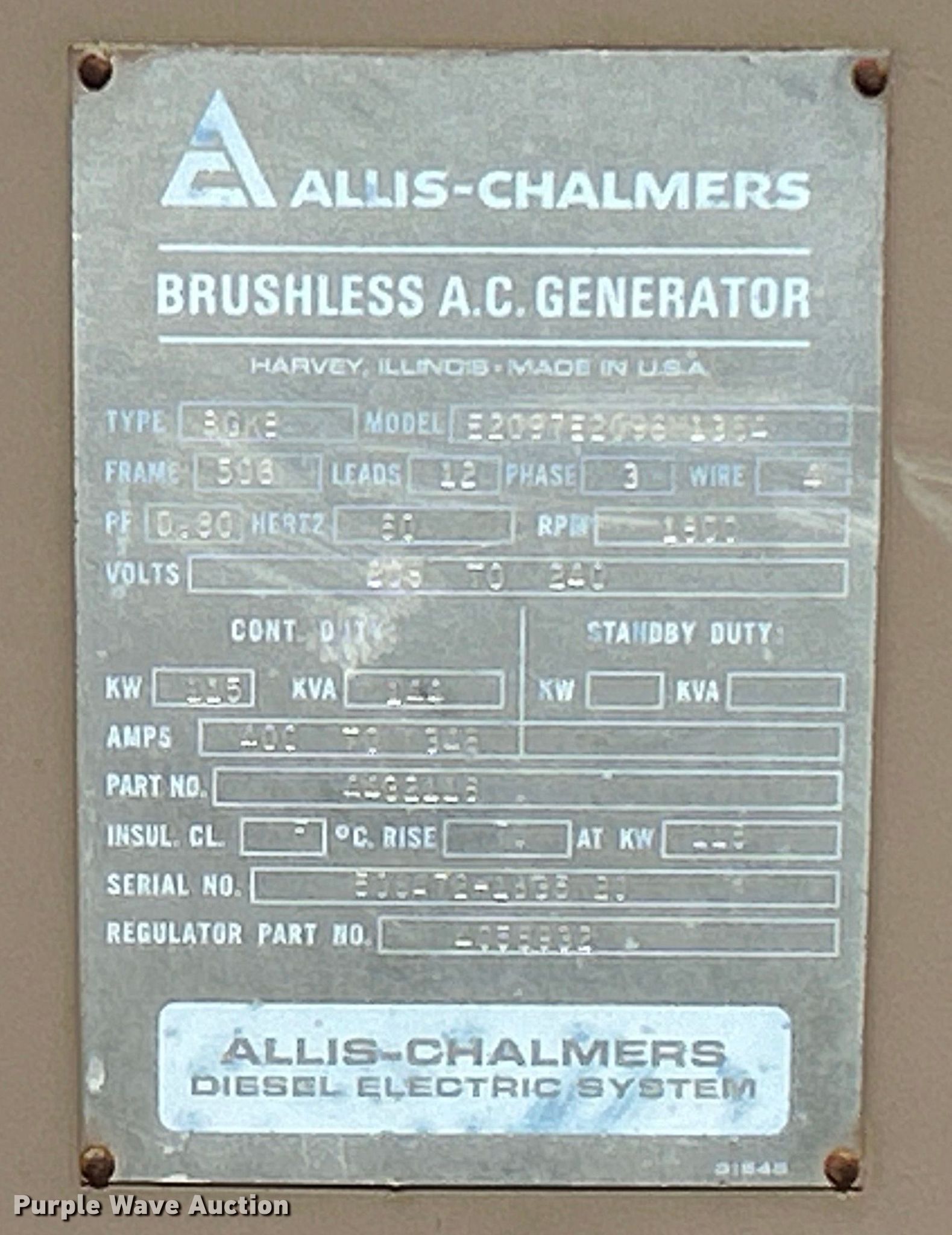 Purple Wave is selling a used Generator Set in Oklahoma. This item is a Allis Chalmers BKGB generator with the following: Hours: 355 on meter, Serial: 506A72-1835N20