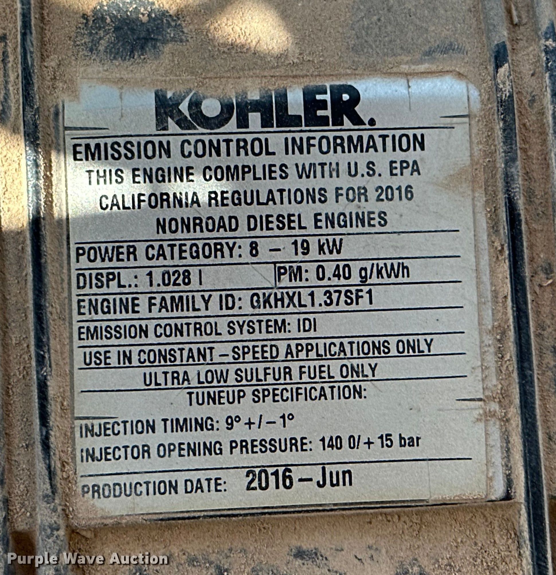 2016 Terex RL4 light plant. Hours: 1,075 on meter, VIN: 4ZJSA1014H1003894, Serial: RL4J-3894, Unit #: 47. Engine Kohler KDW1003GE, Serial: 9224804, Displacement: 1.028L, Cylinders: 3, Fuel type: Diesel. Features Generator Pancake, kVA: 6, kW: 6, Phase: Single, Electric start, Fuel tank, Light plant Bulbs: 4, Hoist: Manual, Stabilizers. Trailer 9' L x 52" W, Ball hitch size: 2", Suspension: Spring, Axles: Single, Tire size: ST175/80D13, GVWR: 1,605 lbs, GAWR: 2,000 lbs. This is worksite support equipment and will not come with a title. Transfer of ownership documentation will be a bill of sale. Lindsay, OK 73052