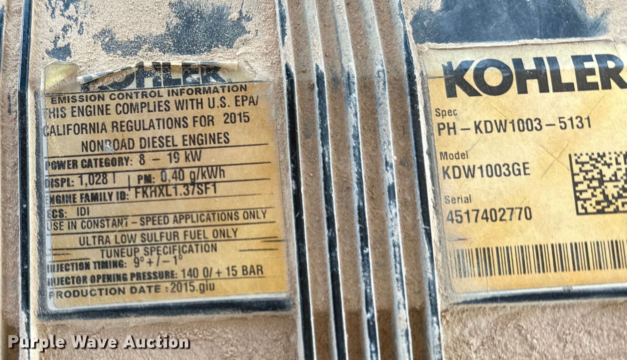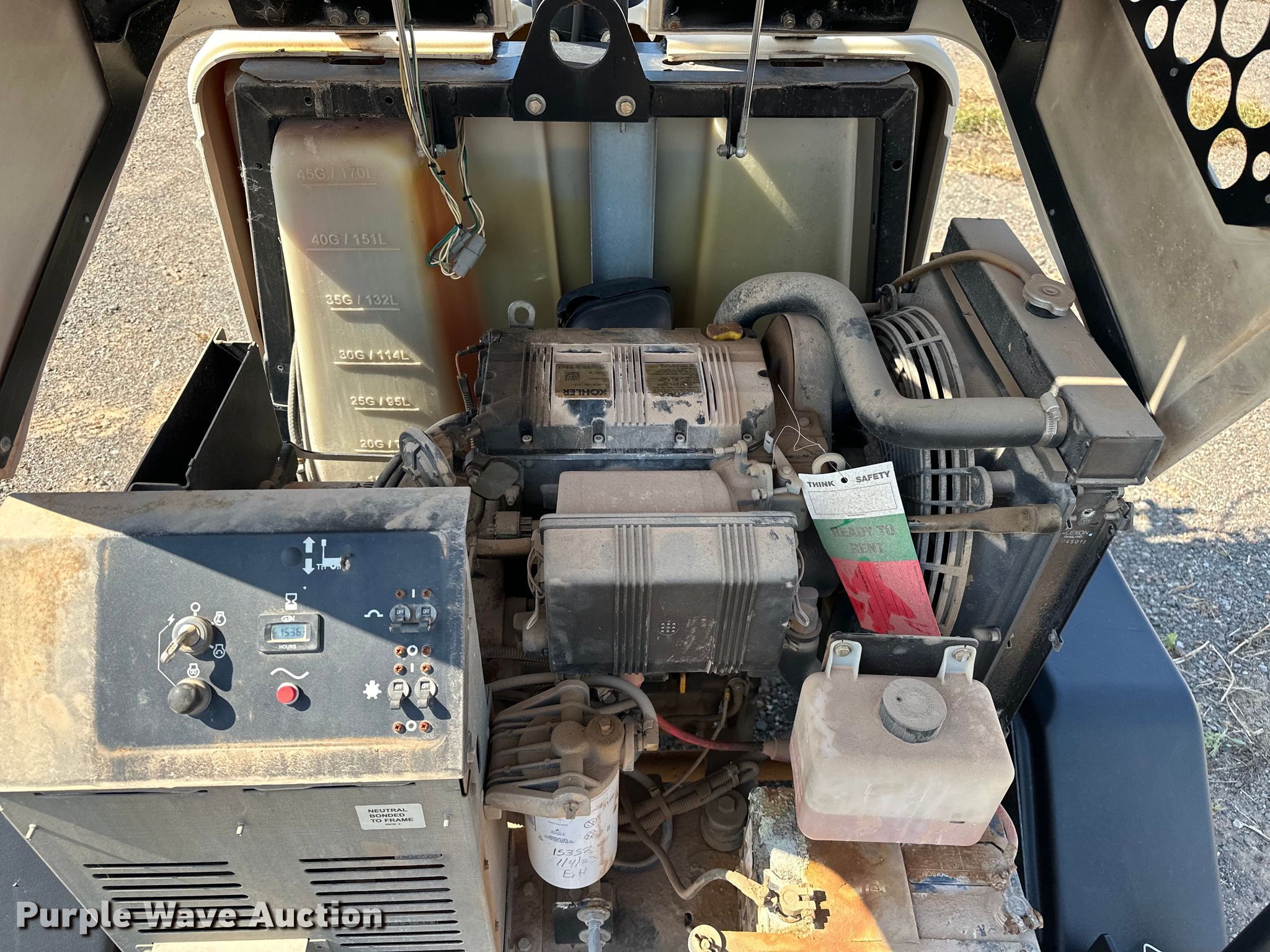 2016 Terex RL4 light plant. Hours: 15,363 on meter, VIN: 4ZJSA1016G1000400, Serial: RL416-400, Unit #: 41. Engine Kohler KDW1003GE, Serial: 4517402770, Displacement: 1.028L, Cylinders: 3, Fuel type: Diesel. Features Generator Coliseum, kVA: 6, kW: 6, Phase: Single, Electric start, Fuel tank, Light plant Bulbs: 4, Hoist: Manual, Stabilizers. Trailer 9' L x 52" W, Ball hitch size: 2", Suspension: Spring, Axles: Single, Tire size: ST175/80D13, GVWR: 1,605 lbs, GAWR: 2,000 lbs. Notes Possible head gasket leak. This is worksite support equipment and will not come with a title. Transfer of ownership documentation will be a bill of sale. Lindsay, OK 73052
