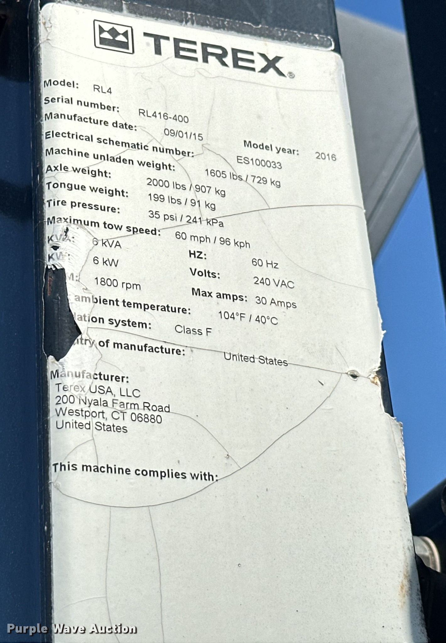 Purple Wave is selling a used Light Plant in Oklahoma. This item is a 2016 Terex RL4 light plant with the following: Hours: 15,363 on meter, VIN: 4ZJSA1016G1000400, Serial: RL416-400, Unit #: 41