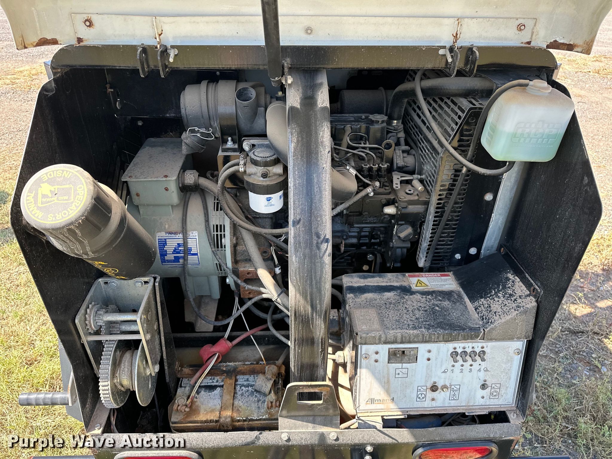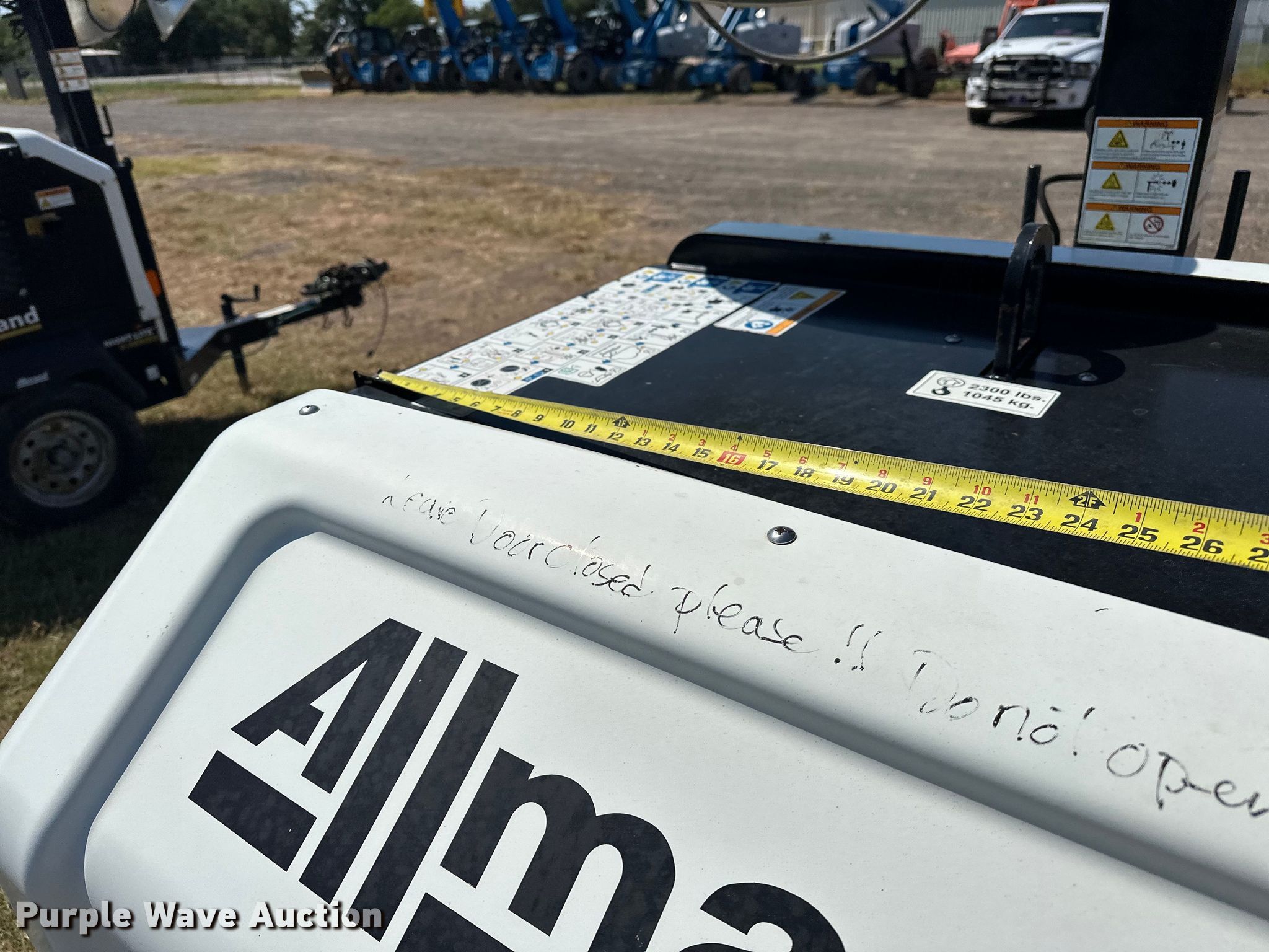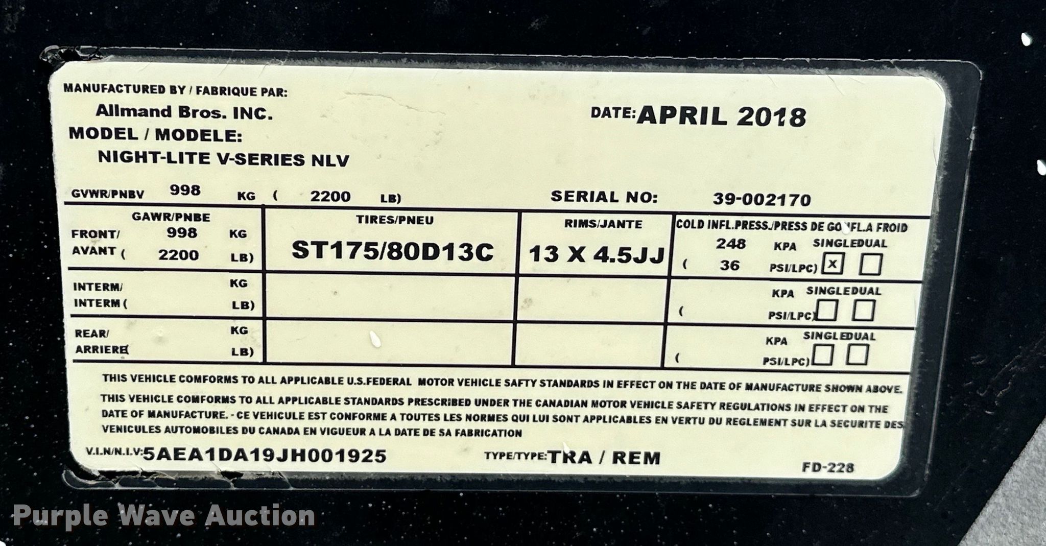 2018 Allmand Night-Light V-Series NLV light plant. Hours: 8,725 on meter, VIN: 5AEA1DA19JH001925, Serial: 39-002170, Unit #: 74. Engine Mitsubishi L3E, Serial: A45409, Displacement: 1.0L, Cylinders: 3, Fuel type: Diesel. Features Generator Pancake 201CSA5420, kVA: 8, kW: 8, Phase: Single, Electric start, Fuel tank, Light plant Bulbs: 4, Hoist: Manual. Trailer 8' L x 54" W, Ball hitch size: 2", Suspension: Spring, Axles: Single, Tire size: ST175/80R13, GVWR: 2,200 lbs, GAWR: 2,200 lbs. Notes Dead battery, Unknown operating condition. This is worksite support equipment and will not come with a title. Transfer of ownership documentation will be a bill of sale. Lindsay, OK 73052