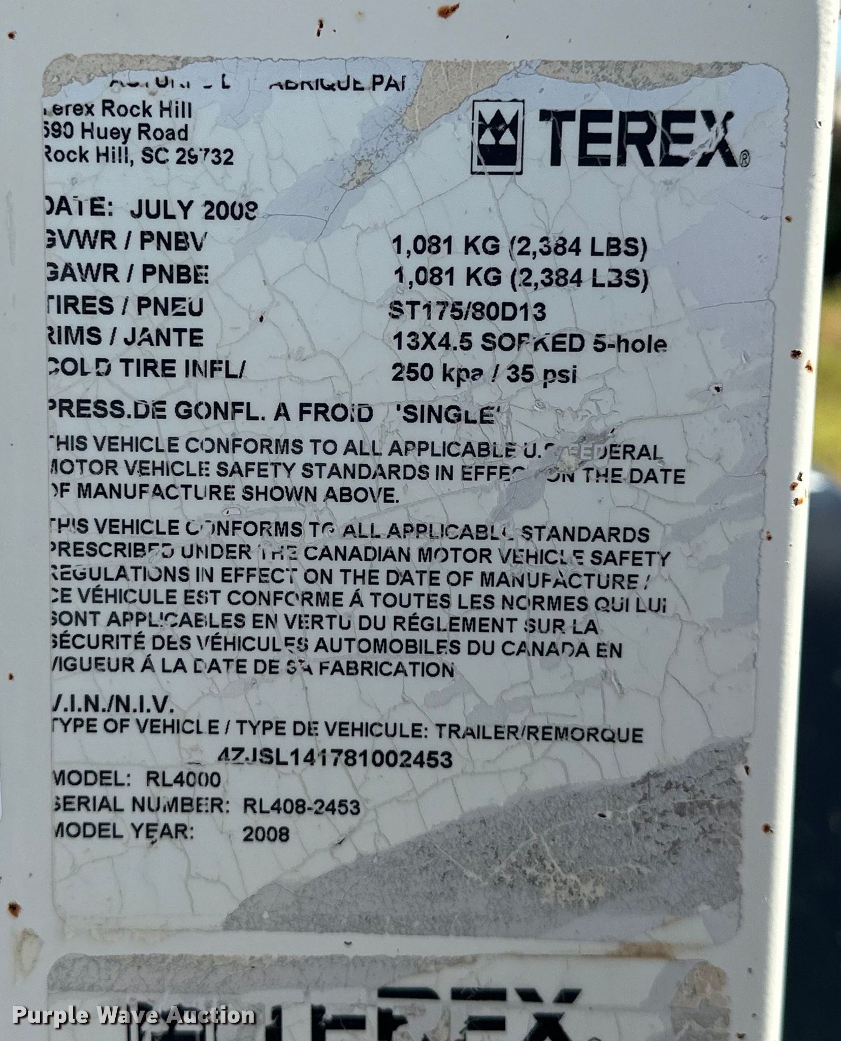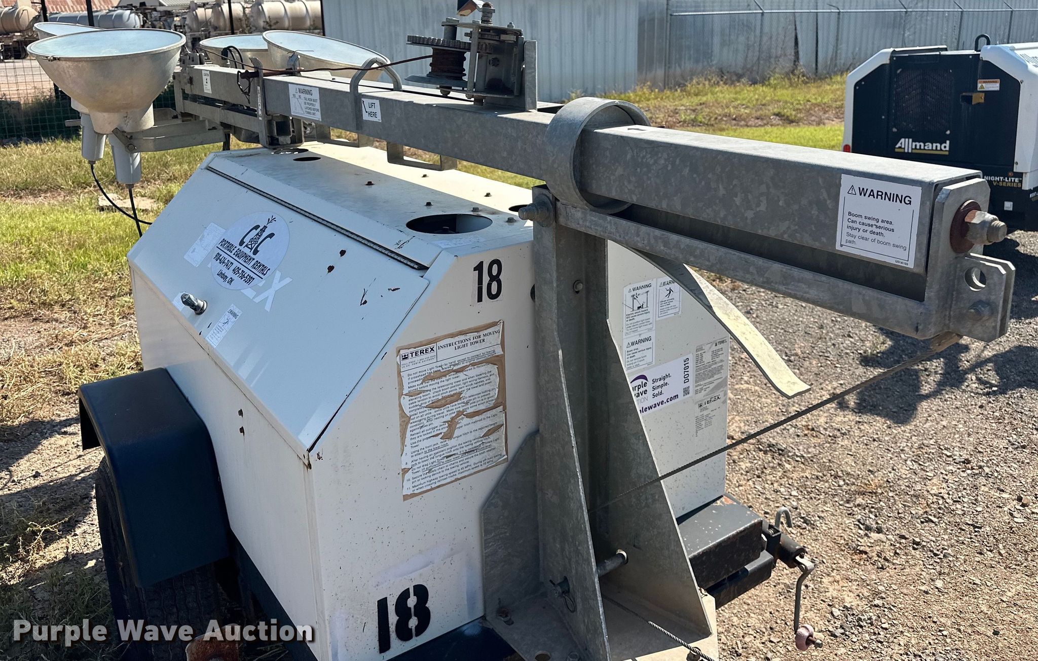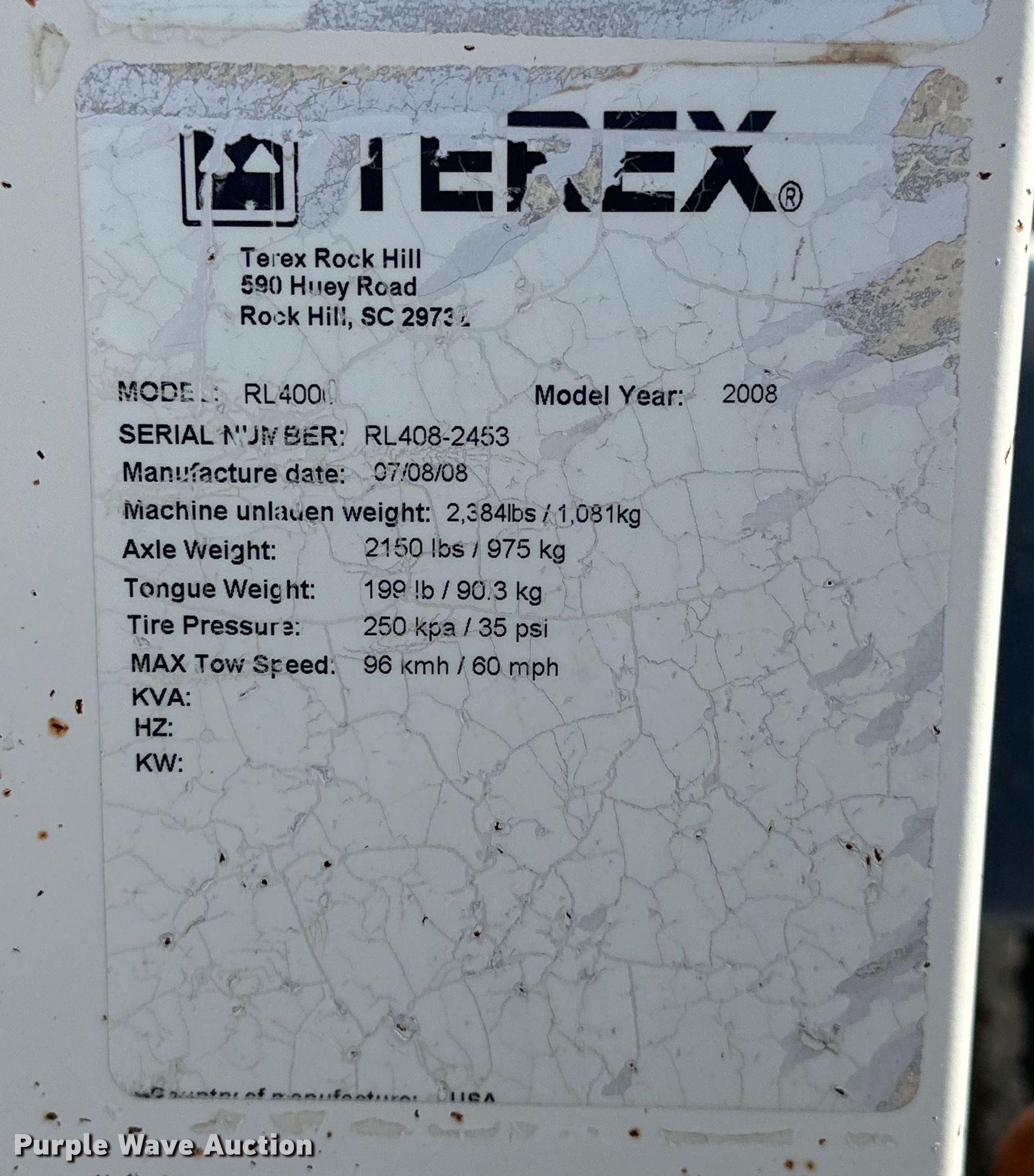 Purple Wave is selling a used Light Plant in Oklahoma. This item is a 2008 Terex RL4000 light plant with the following: Hours: 2,034 on meter, VIN: 4ZJSL141781002453, Serial: RL408-2453, Unit #: 18