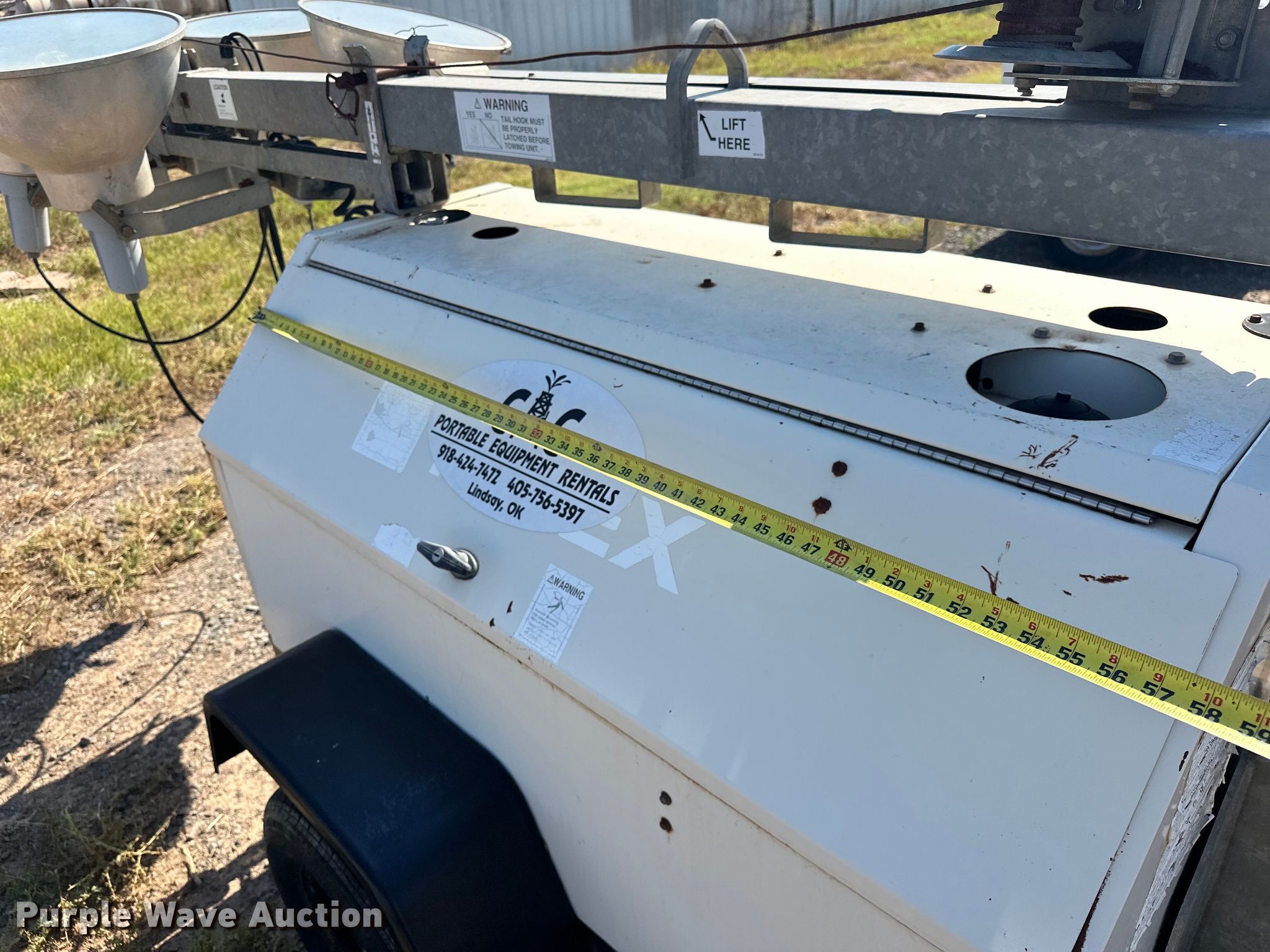 2008 Terex RL4000 light plant. Hours: 2,034 on meter, VIN: 4ZJSL141781002453, Serial: RL408-2453, Unit #: 18. Engine Kubota D1105, Displacement: 1.1L, Cylinders: 3, Fuel type: Diesel. Features Generator Pancake 201CSA5411, kVA: 6, kW: 6, Phase: Single, Electric start, Fuel tank, Light plant Bulbs: 4, Hoist: Manual, Stabilizers. Trailer 9' L x 54" W, Ball hitch size: 2", Suspension: Spring, Axles: Single, Tire size: ST175/80R13, GVWR: 2,384 lbs, GAWR: 2,384 lbs. This is worksite support equipment and will not come with a title. Transfer of ownership documentation will be a bill of sale. Lindsay, OK 73052