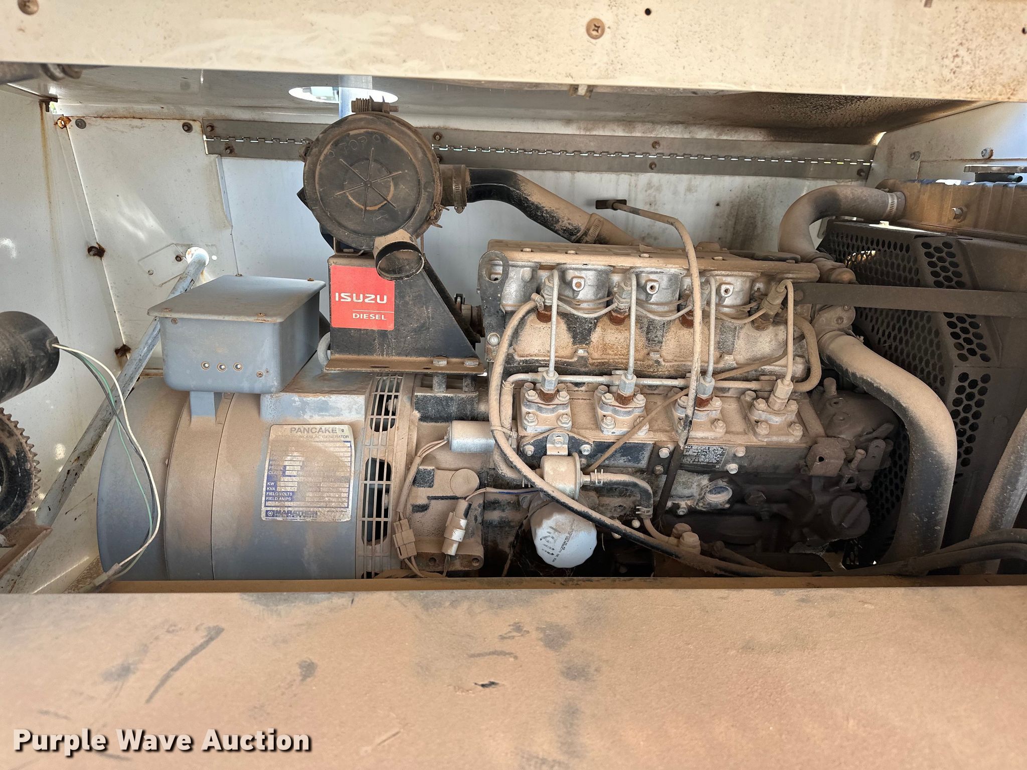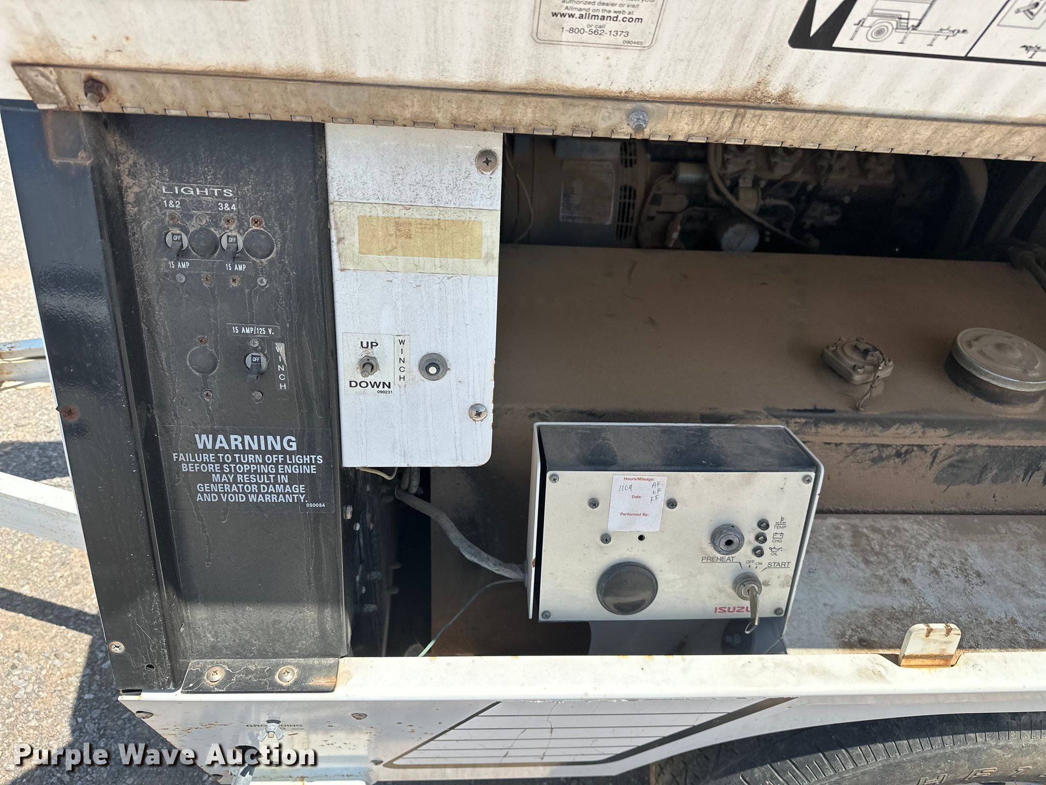 Allmand ML20 light plant. Hours: 1,104 on meter, Serial: 0506MXL08, Unit #: 2. Engine Isuzu 4LE1, Displacement: 2,179 cc, Cylinders: 4, Fuel type: Diesel. Electric Motor Pancake, Phase: Single. Features Generator Allmand ML20, Phase: Single, Electric start, Fuel tank, Light plant Bulbs: 4, Hoist: Power, Stabilizers. Trailer 9.5' L x 66" W, Ball hitch size: 2", Suspension: Spring, Axles: Single, Tire size: ST205/75R15. Notes Engine issues, turns over but will not start , Bulbs missing, Unknown operating condition of lights, Unknown operating condition. This is worksite support equipment and will not come with a title. Transfer of ownership documentation will be a bill of sale. Lindsay, OK 73052