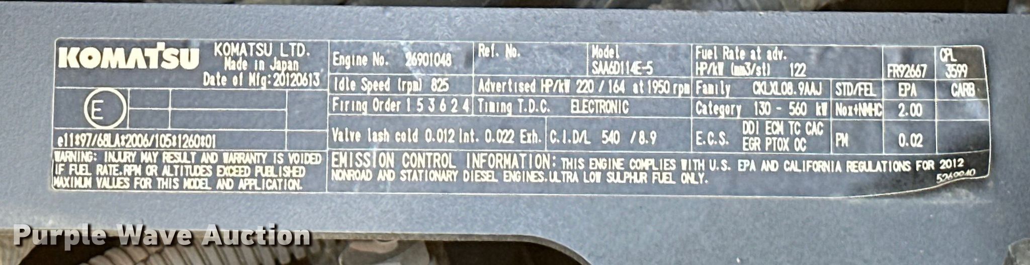 2013 Komatsu D65EX dozer. Hours: 6,044 on meter, Miles or hours may vary, unit still in use, Serial: KMT0D117C01001899. Engine Komatsu SAA6D114E-5, Serial: 26901048, Displacement: 8.9L, Cylinders: 6, Fuel type: Diesel. Transmission Powershift, 3F - 3R. Operators station Enclosed cab, AC, Heat, Electronic Monitoring System panel, Steering: Joystick. Features Screen guards, Sweeps, Dozer blade Type: Semi-U, Single-tilt, Width: 11', Attachments Ripper Komatsu, Shanks: 3.. Tracks Width: 24", Grouser pads: Single, Bottom rollers: 7, Track guards. Cherokee Builders Inc. Tulsa, OK 74116